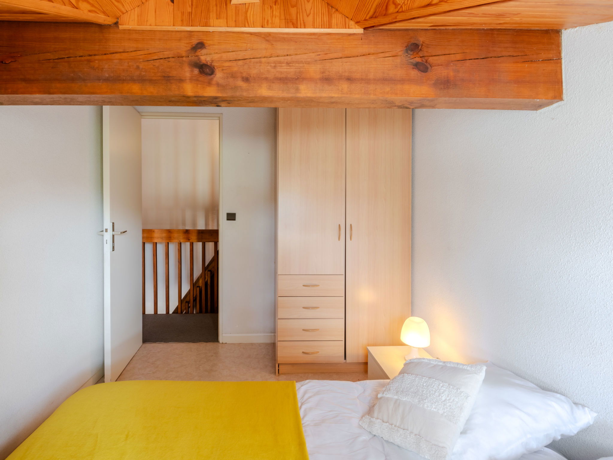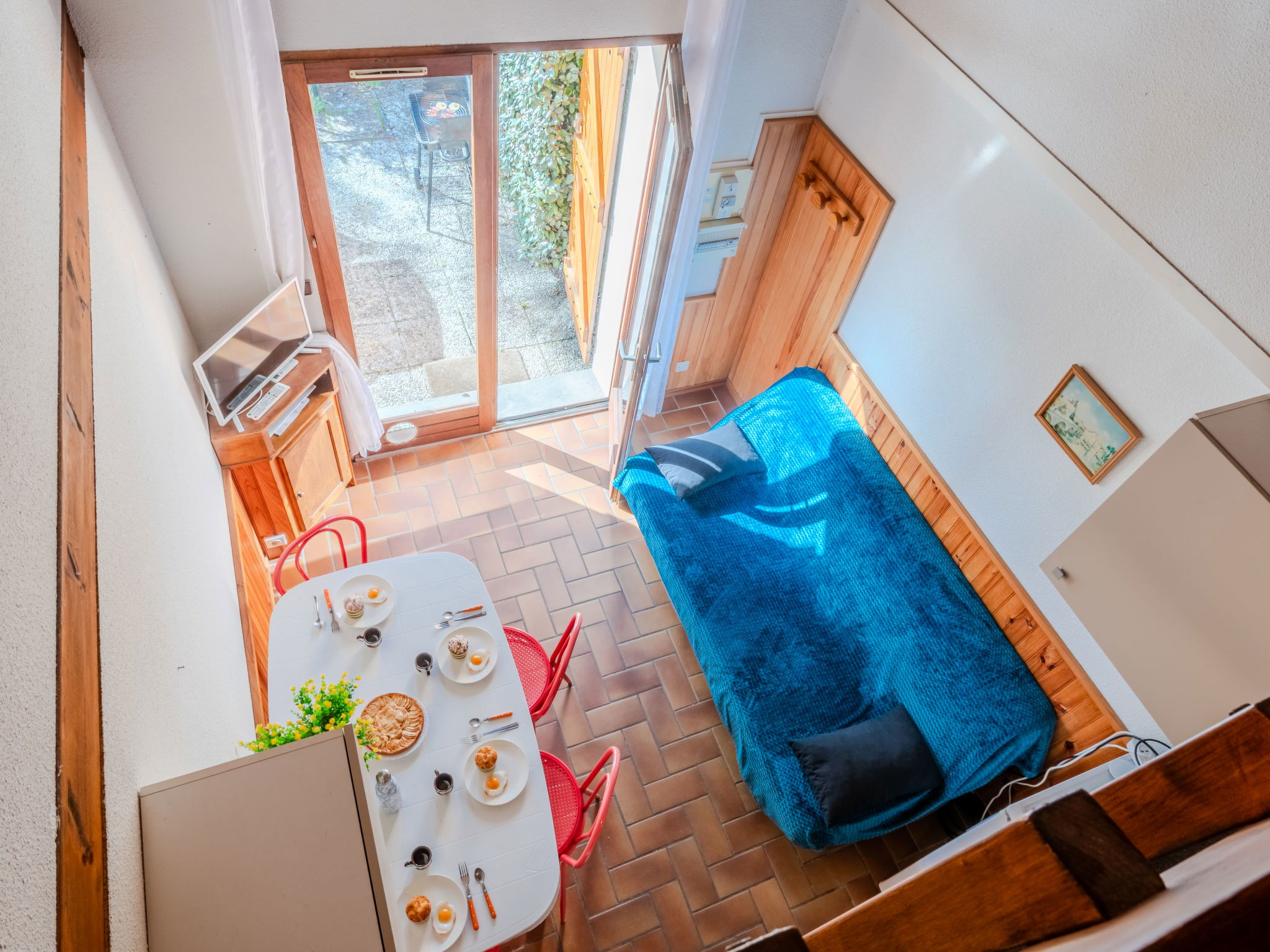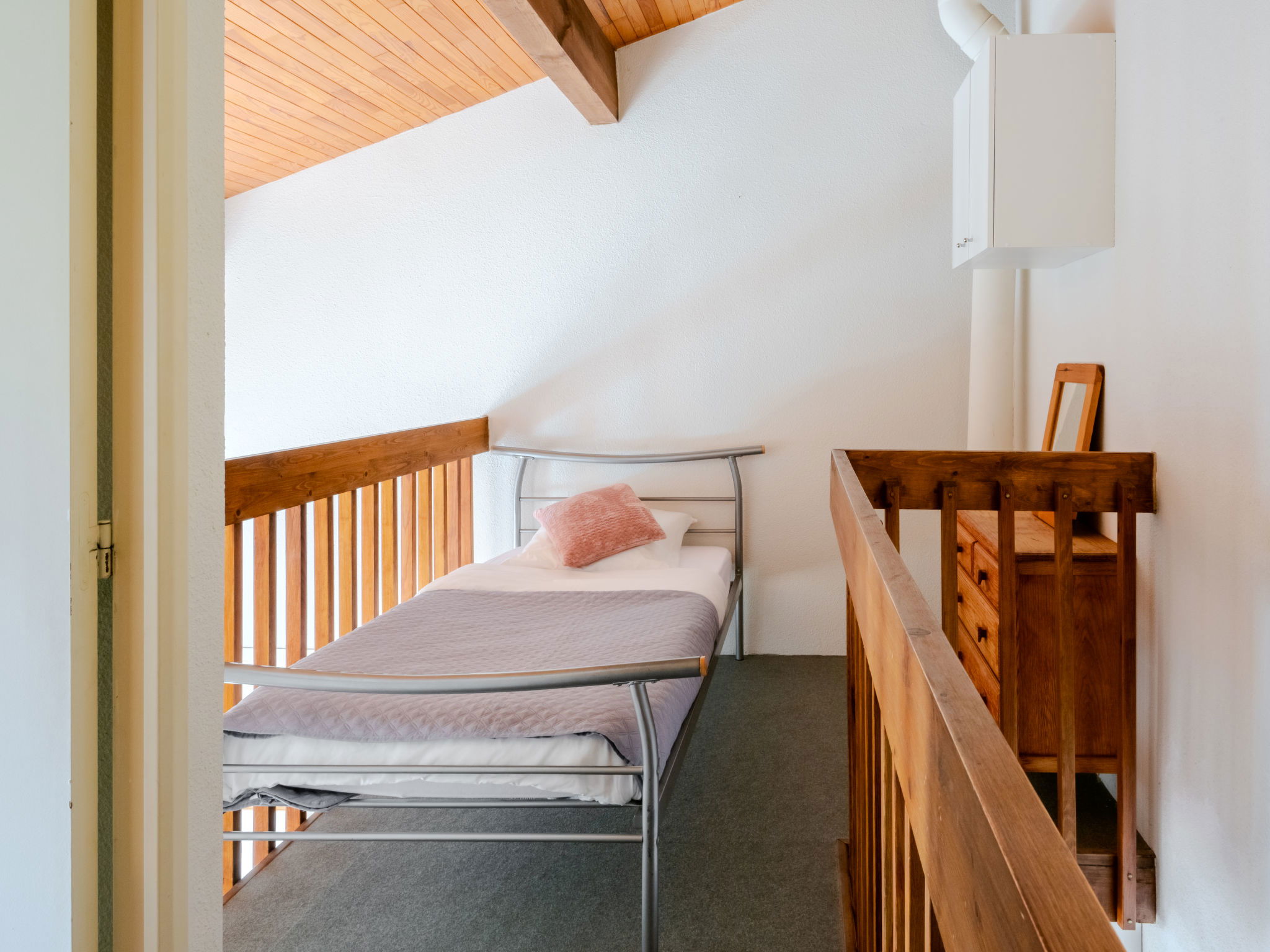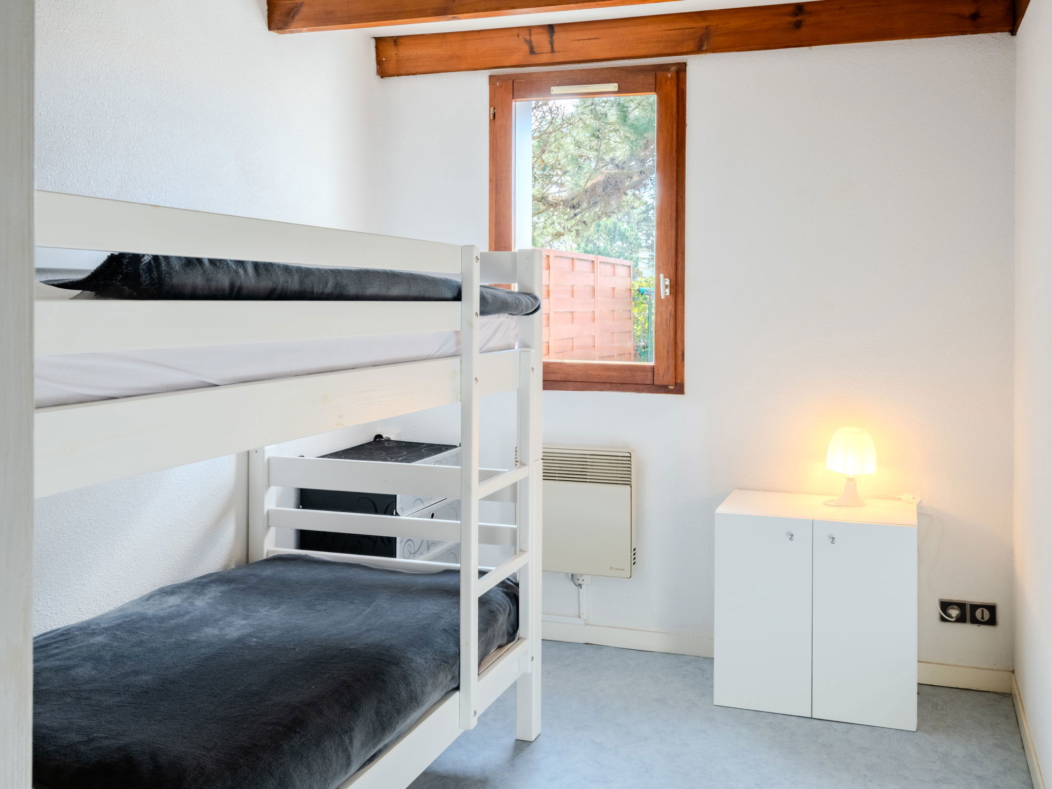 3-room terraced house 39 m2 on 2 levels, south facing position. Rustic furnishings: small living/dining room with TV (flat screen). Exit to the terrace. 1 room with 1 x 2 bunk beds (90 cm). Kitchenette (2 hot plates, oven, microwave). Shower, sep. WC. Upper floor: (steep stair), 1 open room with sloping ceilings, ceiling height 110 - 150 cm with 1 french bed (140 cm). Electric heating. Terrace furniture, barbecue (portable). Facilities: washing machine. Internet (WiFi, extra). Please note: non-smokers only. 1 small pet/ dog allowed. TV only FR. Smoke alarm.