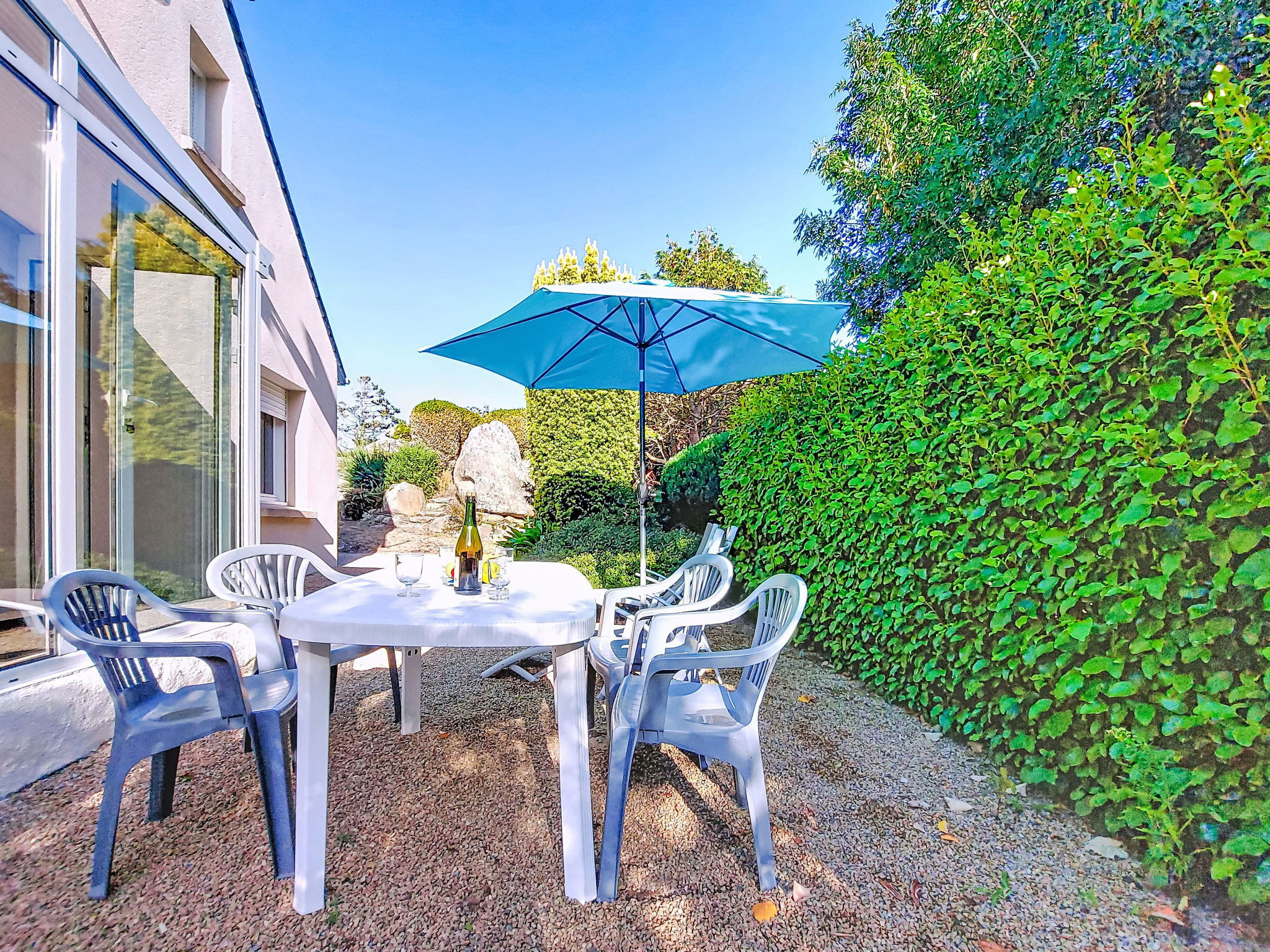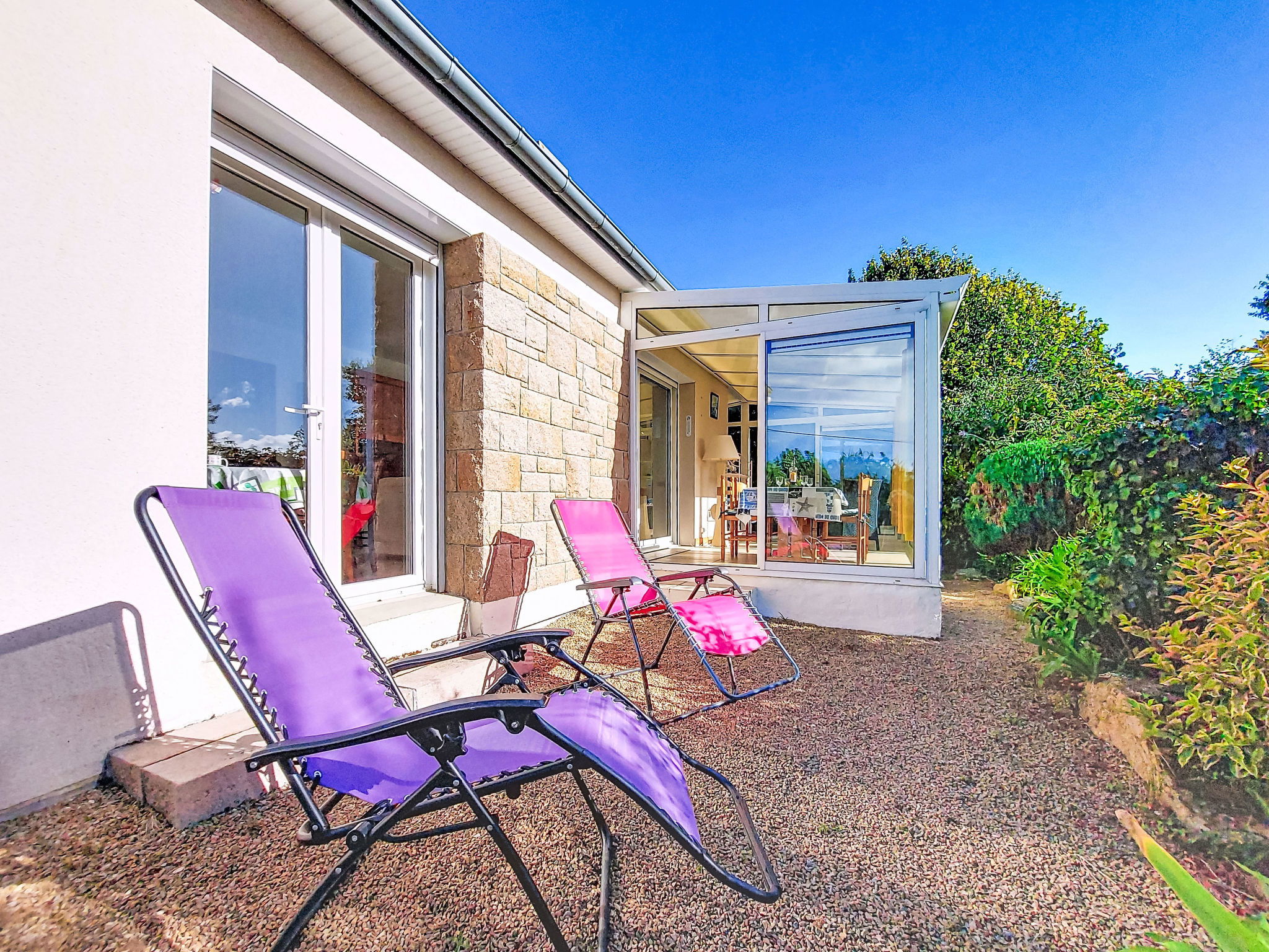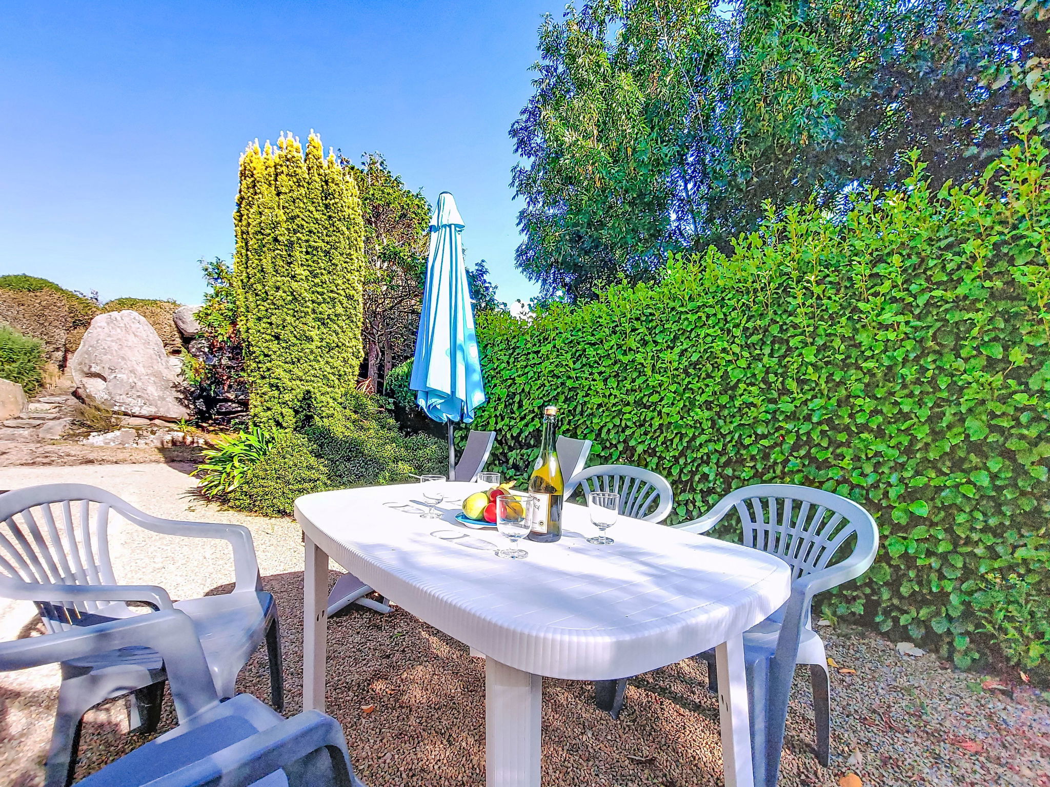 "Kerguntuil", 3-room house 60 m2. Bright, beautiful and cosy furnishings: living room with veranda with dining table and TV. Exit to the veranda. 1 room with 1 french bed ". 6.5 km from the centre of Pleumeur-Bodou, 3 km from the centre of Tregaste-Plage, 13 km from the centre of Lannion, 1 km from the sea. Private: large garden 1'500 m2 (not fenced) with lawn and wildlife garden, natural garden, parking on the premises. Grocery 3 km, supermarket 4.5 km, bus stop 3 km, sandy beach 2 km.