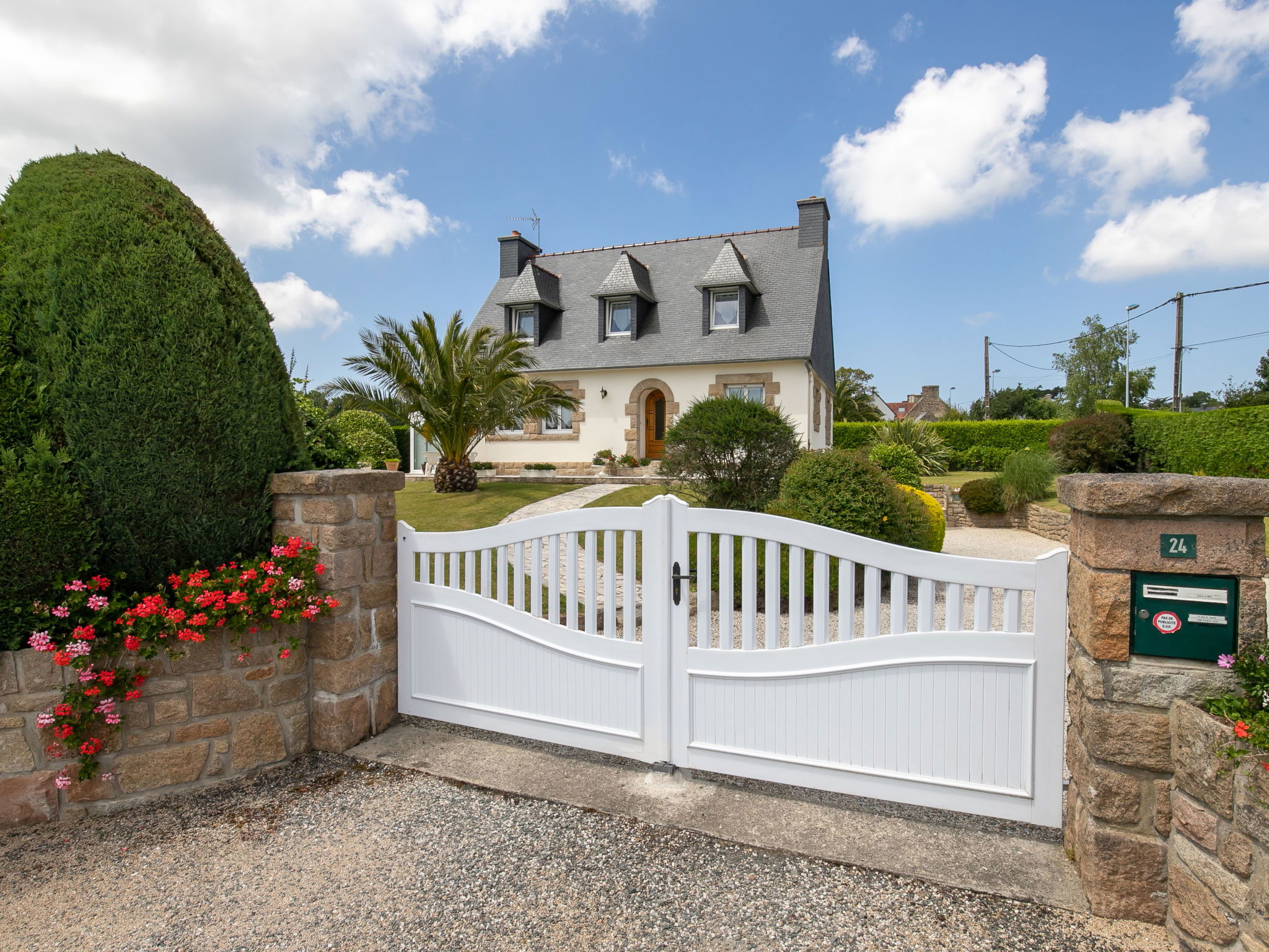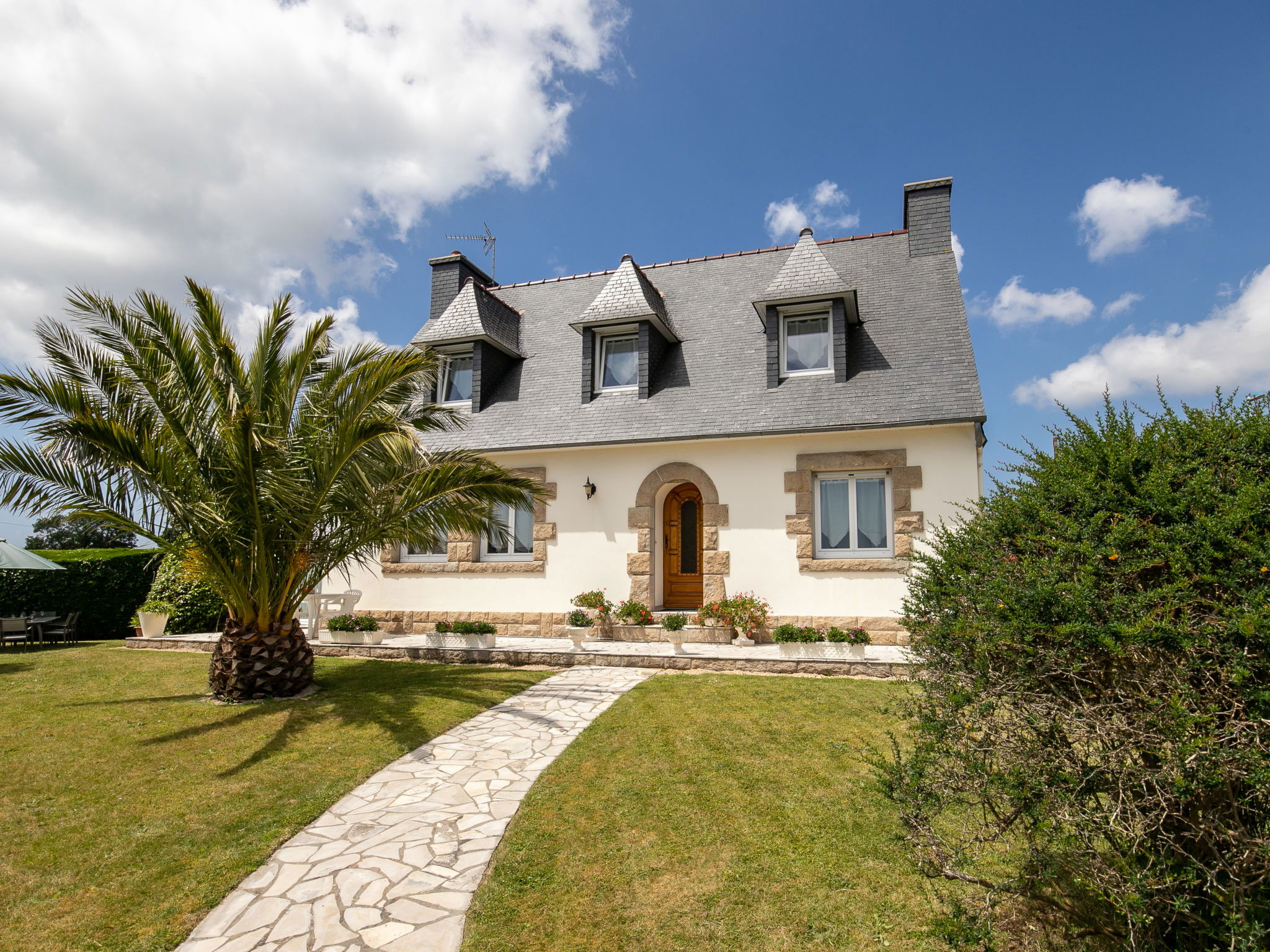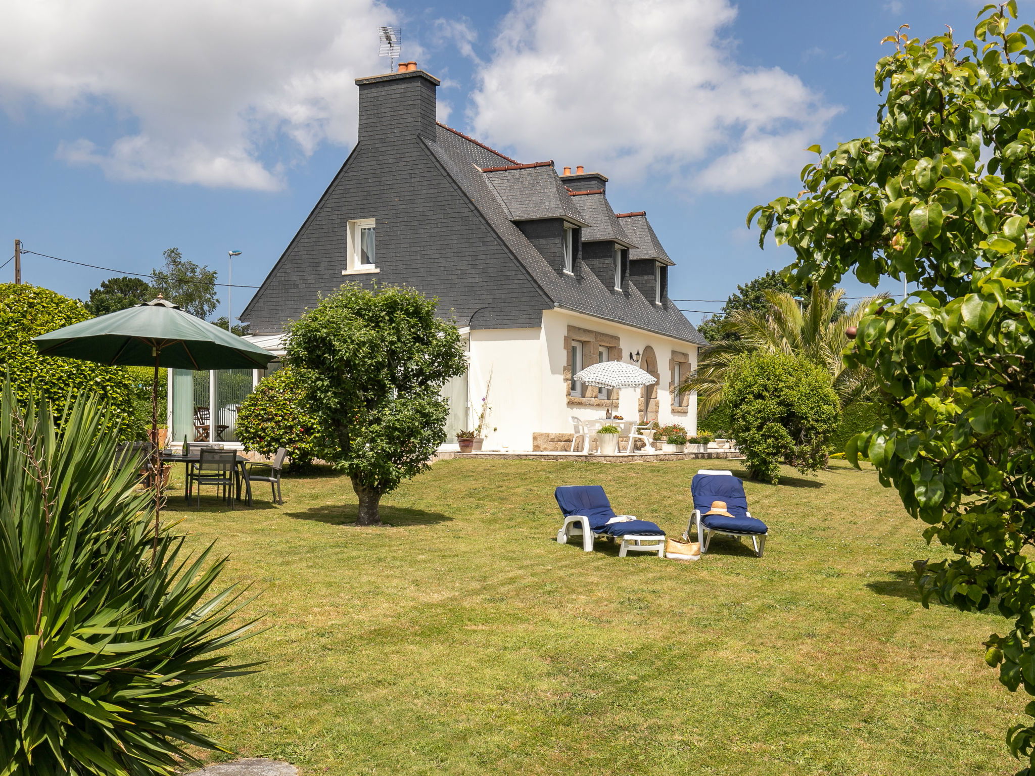 Beautiful single-family house "Gueradur". In a hamlet 1 km from the centre of Pleumeur-Bodou, 4 km from the centre of Trégastel, 8 km from the centre of Lannion, in the residential district, 4.5 km from the sea. Private: large garden 1'500 m2 (fenced) with lawn and wildlife garden, parking (for 3 cars), single garage. Grocery 1 km, supermarket 5 km, bus stop 1 km, sandy beach "Trégastel" 4.5 km. Sports harbour 4.5 km, golf course (18 hole) 1 km, indoor tennis centre 3.5 km. Nearby attractions: Plage de Perros-Guirec 4.5 km, Ile Grande 4.5 km. Please note: main road 10 m from the property.