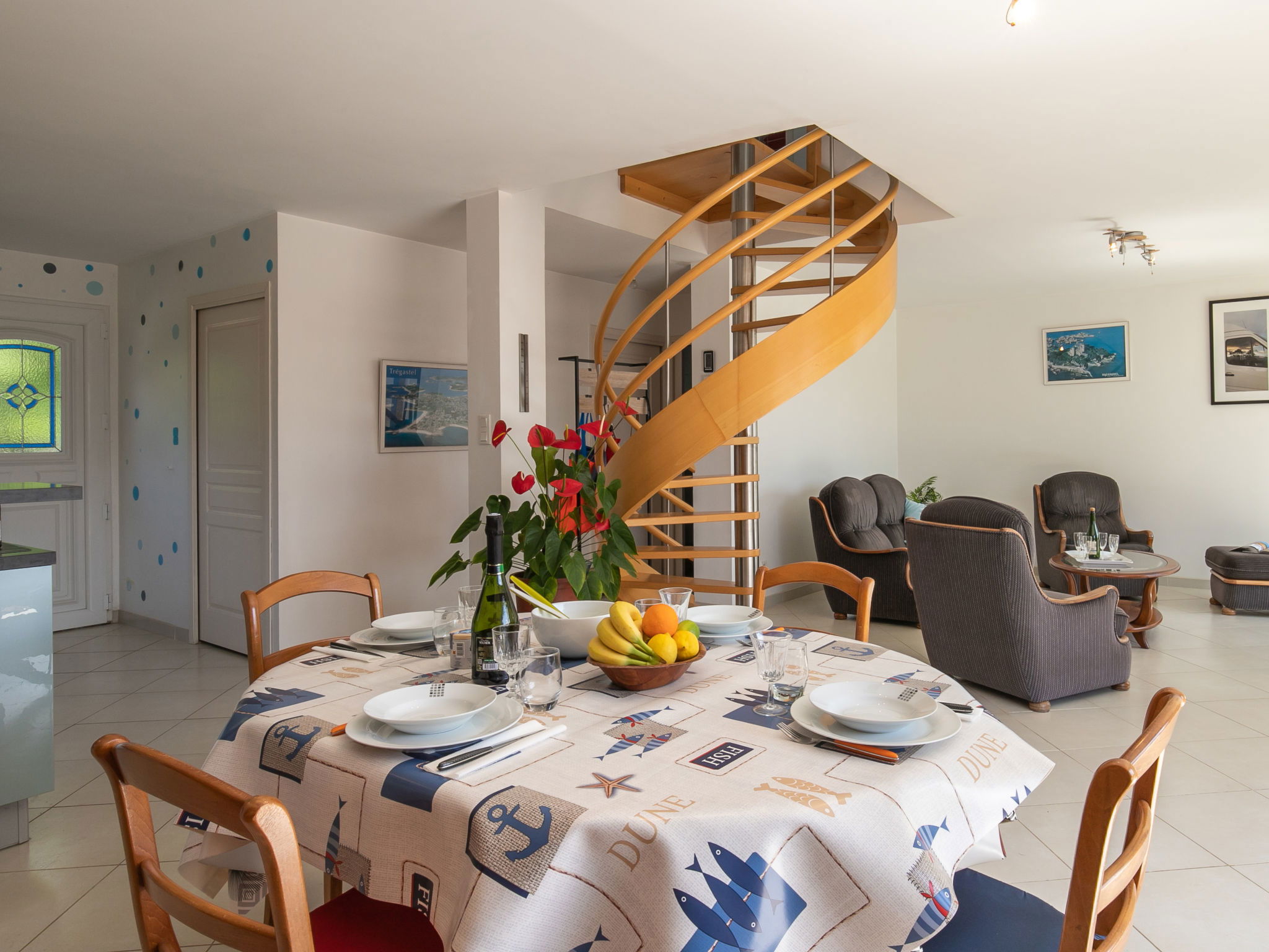 "Rivage", 3-room house 120 m2 on 2 levels. Beautiful and cosy furnishings: large living/dining room with dining table and TV (flat screen). Exit to the terrace. Open kitchen (oven, dishwasher, 3 induction hot plates, toaster, kettle, microwave, freezer, electric coffee machine) with bar. Shower, sep. WC, double hand-basin. Upper floor: (spiral staircase), 1 room with 1 french bed (160 cm, length 200 cm), TV (flat screen). 1 room with 2 beds (90 cm, length 190 cm). Gallery. Bath/WC. Floor heating. Terrace furniture, barbecue (portable), deck chairs (4). Facilities: washing machine. Internet (WiFi). Please note: non-smoking house. Maximum 1 pet/ dog allowed. Smoke alarm. Instead of an enclosed bedroom, some sleeping areas are located in an open-plan area (gallery, alcove, etc.). Offer by a private individual according to Art. 155, IV of CGI.