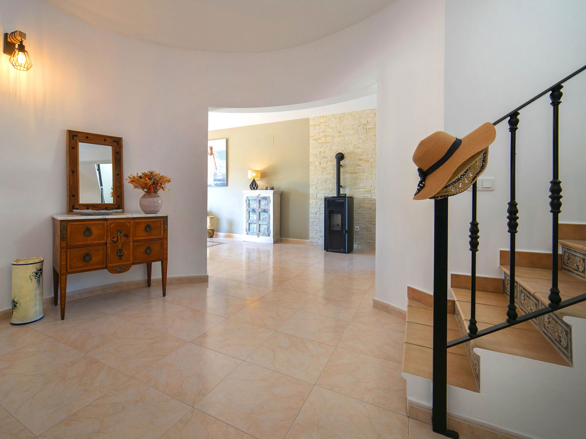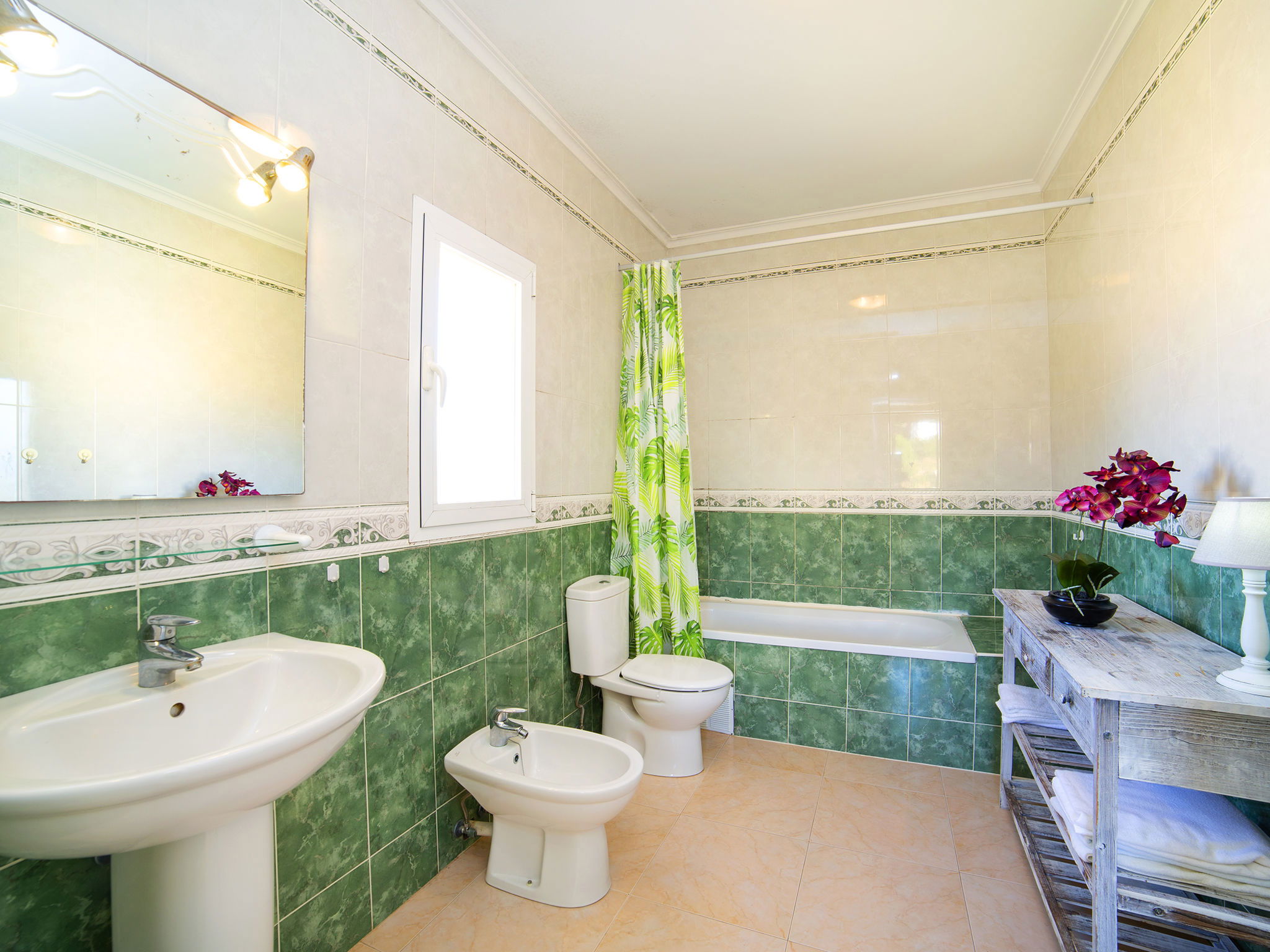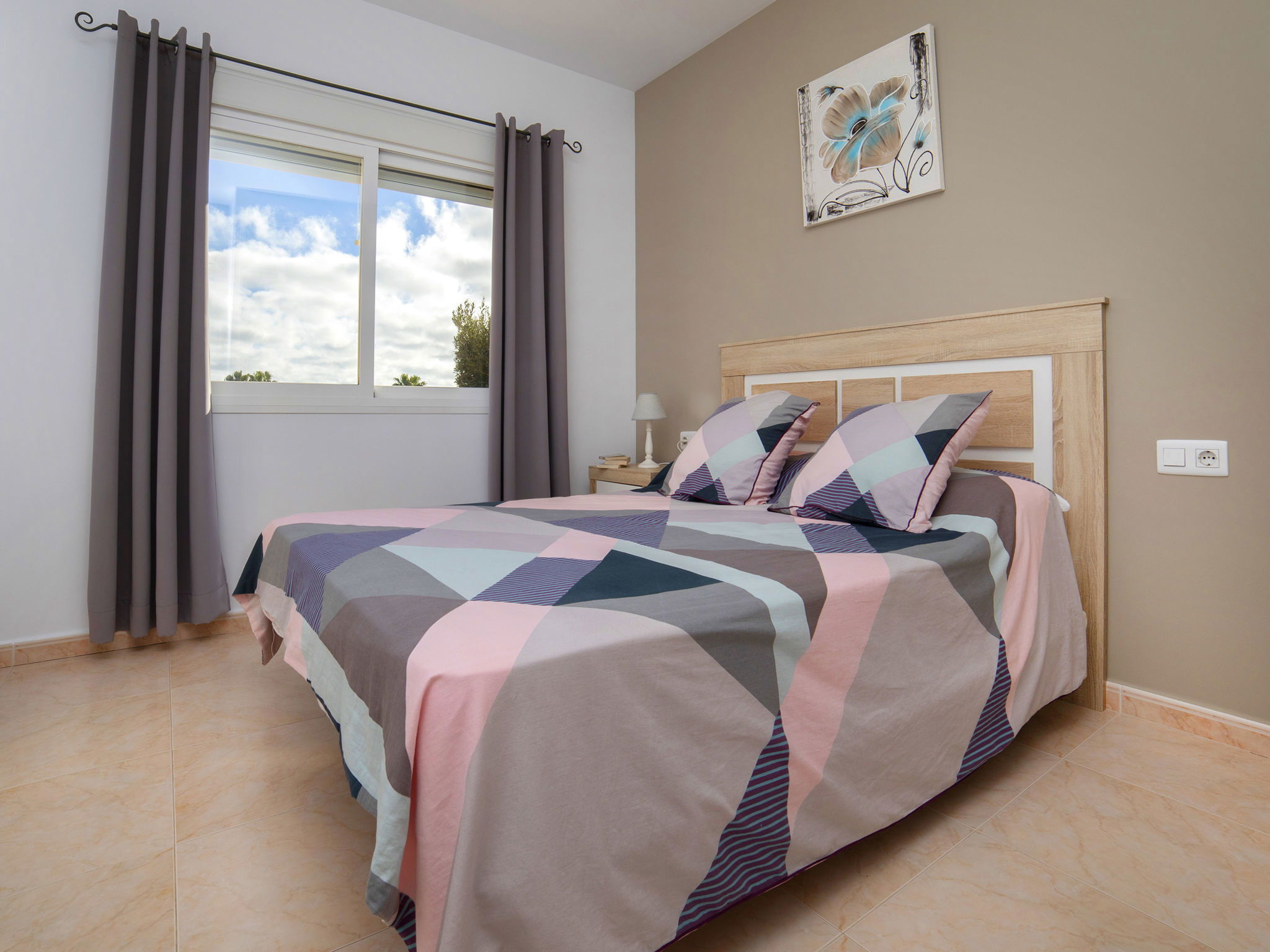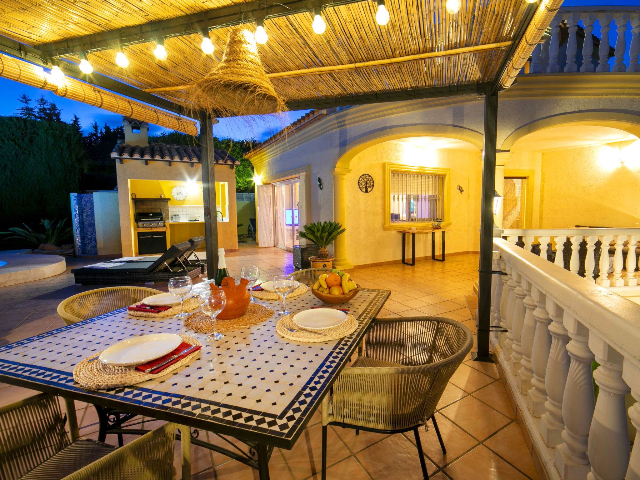 "Hawaii", 4-room villa 130 m2 on 2 levels. Spacious and bright, beautiful and cosy furnishings: living/dining room with dining table, satellite TV, digital TV, flat screen, radio, CD-player, air conditioning, forced-air heating and boiler (100 litres). Exit to the terrace, to the swimming pool. 1 room with 1 french bed (150 cm, length 200 cm), air conditioning, fan and forced-air heating. 1 room with 1 french bed (150 cm, length 200 cm), air conditioning, fan and forced-air heating. Large kitchen (oven, dishwasher, 3 ceramic glass hob hotplates, microwave, freezer, electric coffee machine). Bath/WC, bidet. Electric heating, boiler (100 litres). Heating available only from 01.11. to 30.04. Upper floor: 1 room with 1 french bed (150 cm, length 200 cm), bath/WC, bidet, air conditioning, fan and forced-air heating. Exit to the terrace. Office. Large terrace 50 m2, south facing position and, east facing position, garden, lawn. Terrace furniture, barbecue, deck chairs (6). Distant view of the sea and the countryside. Facilities: washing machine, iron, mosquito net, children's high chair, baby cot for up to 2 year olds, hair dryer. Internet (WiFi, free). Parking (fenced). Please note: suitable for families. Non-smoking house. AT-481467-A // Reg. Nr.: ESFCTU00000302900054192100000000000000000AT-481467-A4