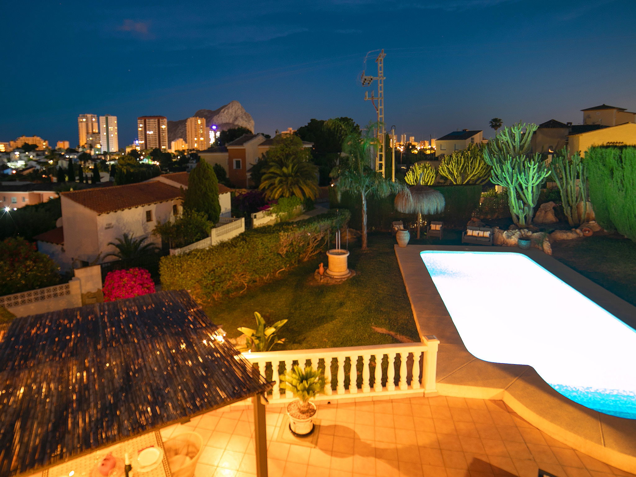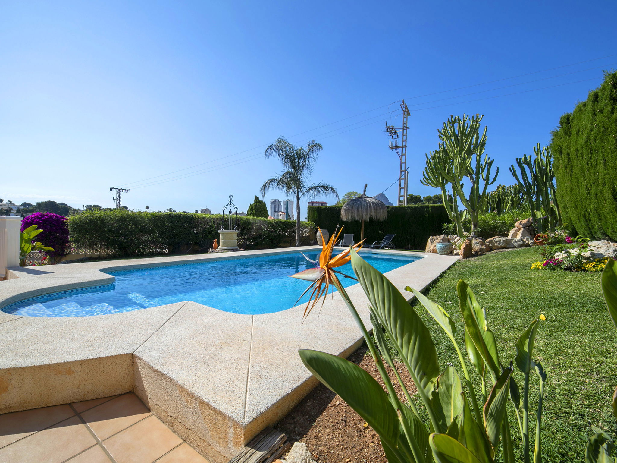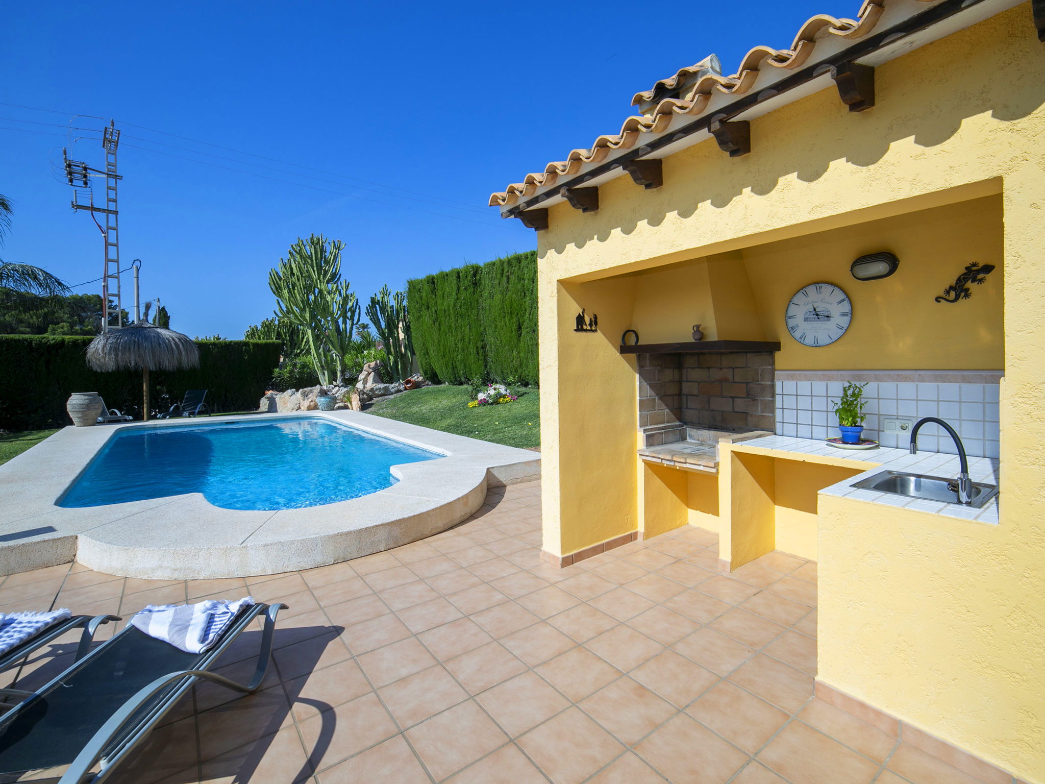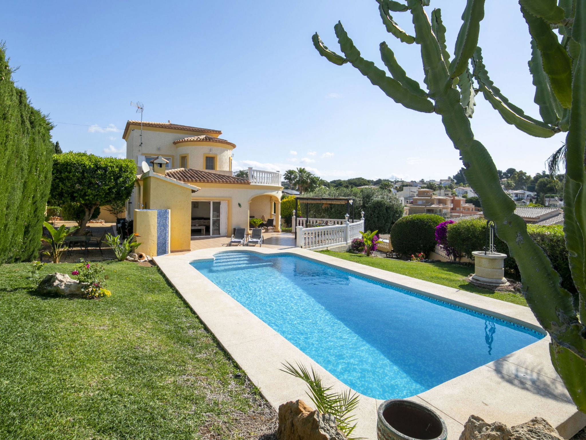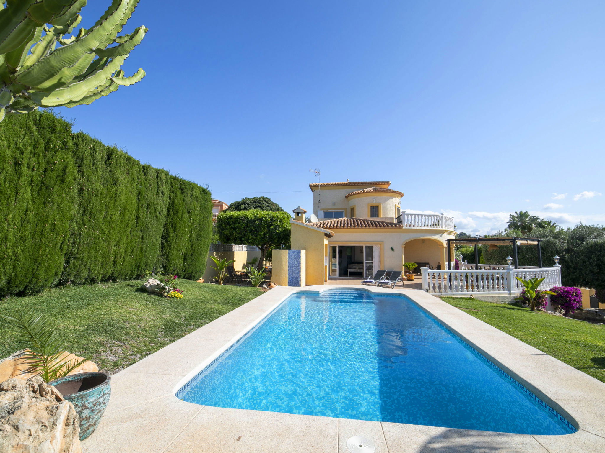 Costeres 1 km from Playa La Fossa: Large, child friendly house "Hawaii", 2 storeys. Outside the resort, 3 km from the centre of Calpe, in the district Costeres, in a quiet position residential area (villas), 900 m from the sea, from the beach. Private: property 800 m2 (fenced) with lawn, natural garden, swimming pool (8 x 4 m, depth 100 - 200 cm, seasonal availability: 01.Jan. - 31.Dec.) with internal staircase. Outdoor shower, garden furniture, barbecue, parking on the premises. Shop 1 km, grocery 1 km, supermarket 1 km, restaurant, bar, café 750 m, pub garden 750 m, 43 minute walk to the centre, bus stop "Bus Local" 750 m, sandy beach "Playa de la Fossa" 1.1 km, diving center 2.5 km, swimming bay 900 m. Sports harbour 2.5 km, marina 2.5 km, golf course (9 hole) 9.7 km, surf school 2.5 km, sailing school 2.5 km, tennis 2.5 km. Nearby attractions: Peñon de Ifach 2.5 km, Salinas de Calpe 2.3 km. Hiking paths: Siera de Olta 10.2 km, Sierra de Bernia 22.2 km, Sendero Calalga 900 m. Please note: suitable for families. Groups of teenagers on request only. Neighbourhood highly sensitive to noise. Quietness and good behaviour expected.