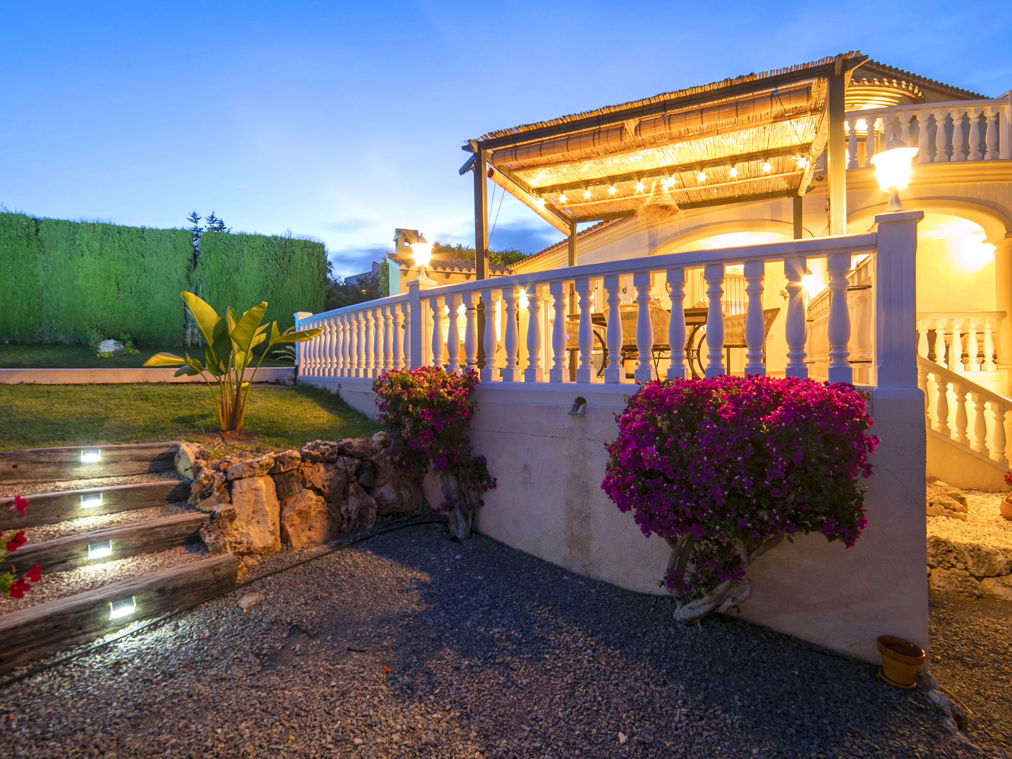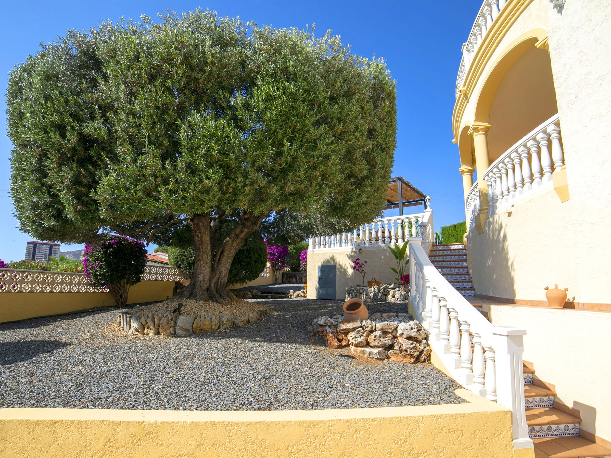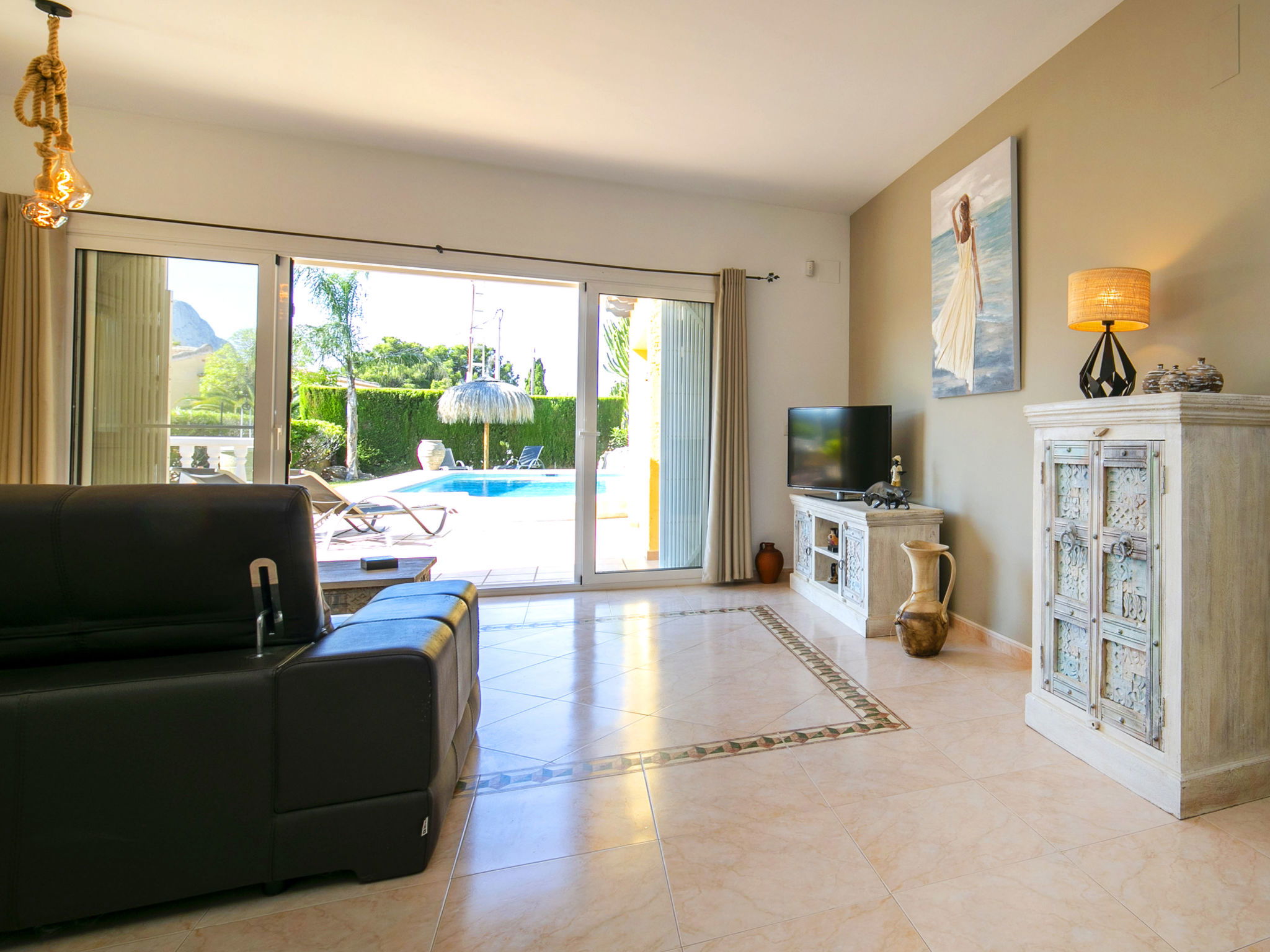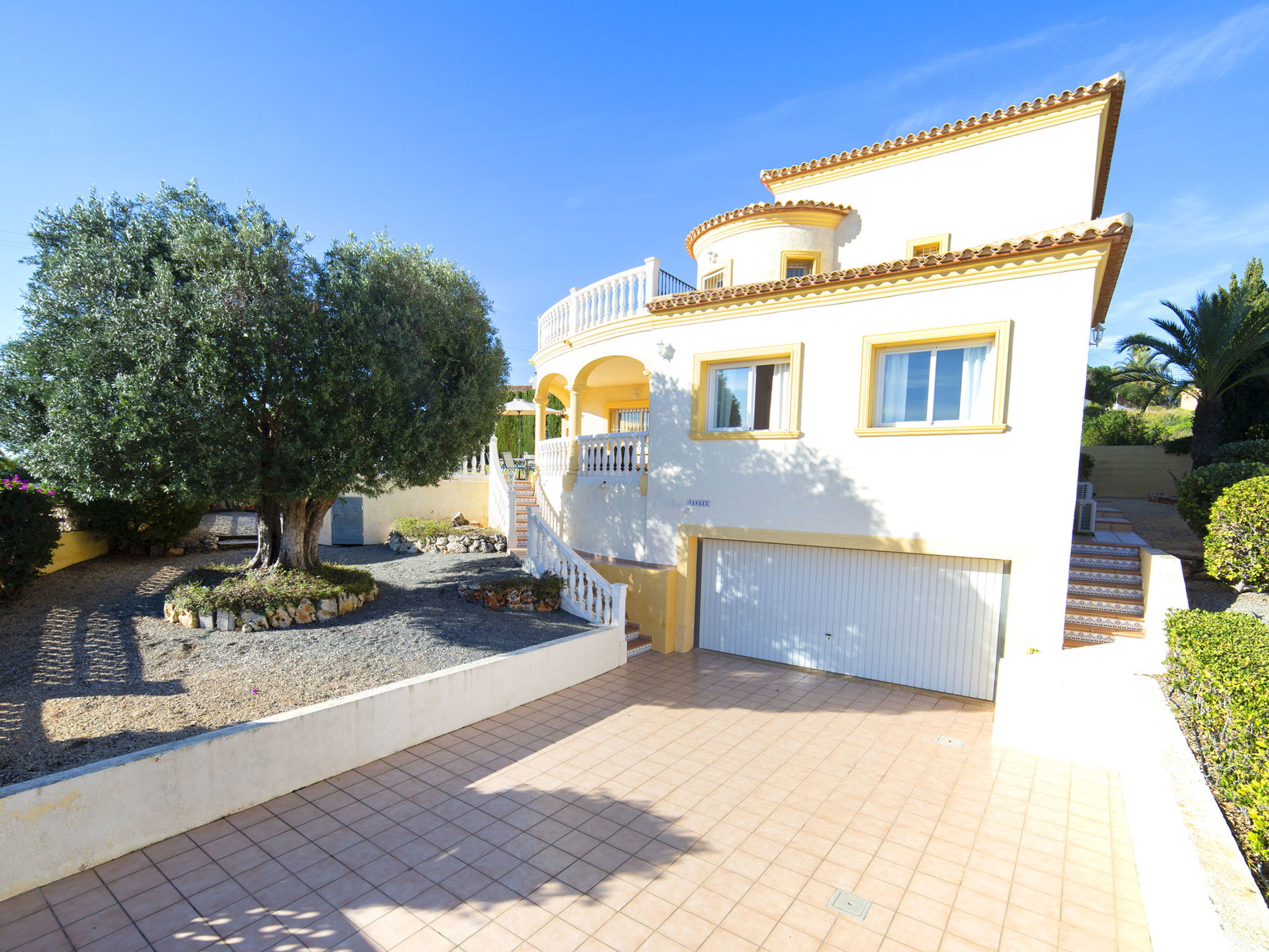 Costeres 1 km from Playa La Fossa: Large, child friendly house "Hawaii", 2 storeys. Outside the resort, 3 km from the centre of Calpe, in the district Costeres, in a quiet position residential area (villas), 900 m from the sea, from the beach. Private: property 800 m2 (fenced) with lawn, natural garden, swimming pool (8 x 4 m, depth 100 - 200 cm, seasonal availability: 01.Jan. - 31.Dec.) with internal staircase. Outdoor shower, garden furniture, barbecue, parking on the premises. Shop 1 km, grocery 1 km, supermarket 1 km, restaurant, bar, café 750 m, pub garden 750 m, 43 minute walk to the centre, bus stop "Bus Local" 750 m, sandy beach "Playa de la Fossa" 1.1 km, diving center 2.5 km, swimming bay 900 m. Sports harbour 2.5 km, marina 2.5 km, golf course (9 hole) 9.7 km, surf school 2.5 km, sailing school 2.5 km, tennis 2.5 km. Nearby attractions: Peñon de Ifach 2.5 km, Salinas de Calpe 2.3 km. Hiking paths: Siera de Olta 10.2 km, Sierra de Bernia 22.2 km, Sendero Calalga 900 m. Please note: suitable for families. Groups of teenagers on request only. Neighbourhood highly sensitive to noise. Quietness and good behaviour expected.