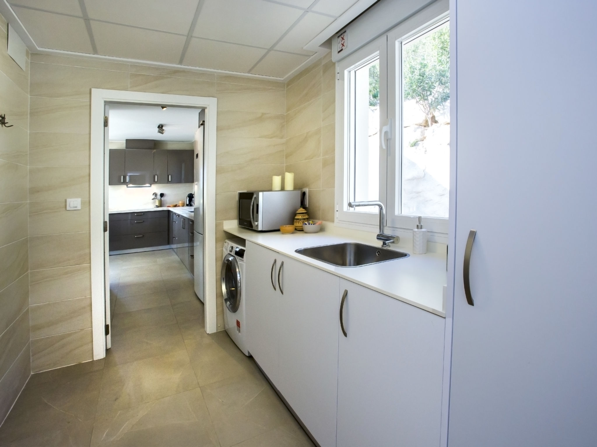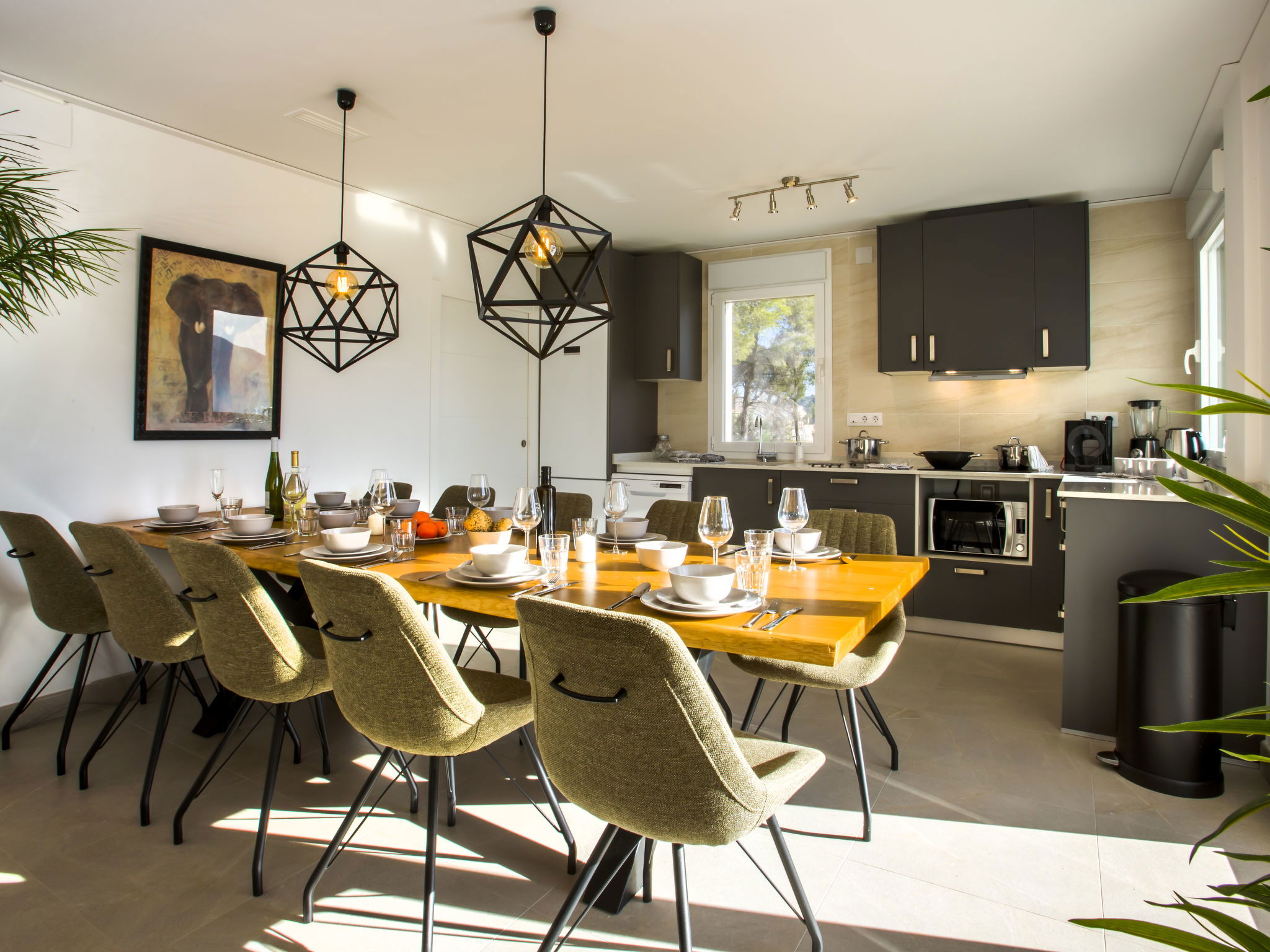 Very large, modern, very comfortable villa "Cara Mull Alcalalí", 2 storeys, built in 2020, surrounded by trees, meadows and vineyards. In the resort Alcalalí, 20 km from the centre of Calpe,Dénia,Javea,Moraira,Altea, in a quiet, sunny, elevated position, 17 km from the sea, 17 km from the beach, south facing position. Private: property 2'500 m2, large, beautiful, well-kept terraced garden wildlife garden and trees, swimming pool (15 x 6 m, depth 130 - 200 cm, seasonal availability: 01.Jan. - 31.Dec.) with internal staircase. Outdoor shower, pergola, terrace, garden furniture, barbecue, pool maintenance by the owner/gardener. In the house: lift, central heating system, air conditioning, laundry, washing machine, tumble dryer. Parking (for 5 cars) on the premises. Shop 600 m, supermarket 3 km, shopping centre 550 m, restaurant, bakery 600 m, café 500 m, bicycle rental 2 km, bus stop 22 km, railway station 21 km, ferry 22 km. Walking paths from the house 500 m. Nearby attractions: Rastro/Flea Market de Jalón 3 km, Parque Natural del Peñón de Ifach 17 km, Port de l'Olla de Altea 16 km, Fuentes del Algar 12 km. Hiking paths: cicloturismo 50 m. Please note: car recommended. The owner does not accept any youth groups.