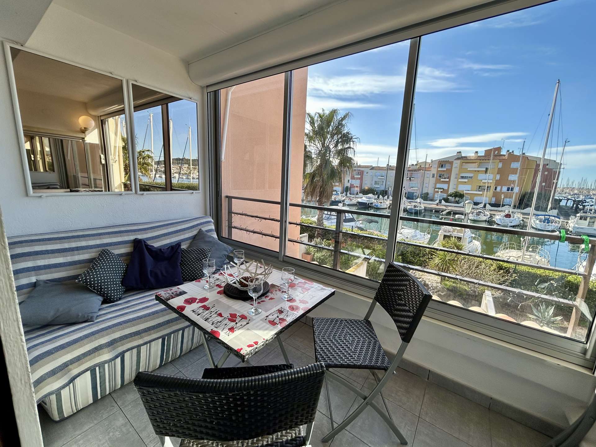 Loggia fermée par baie vitrée équipée d'un store, très jolie vue sur le chenal.