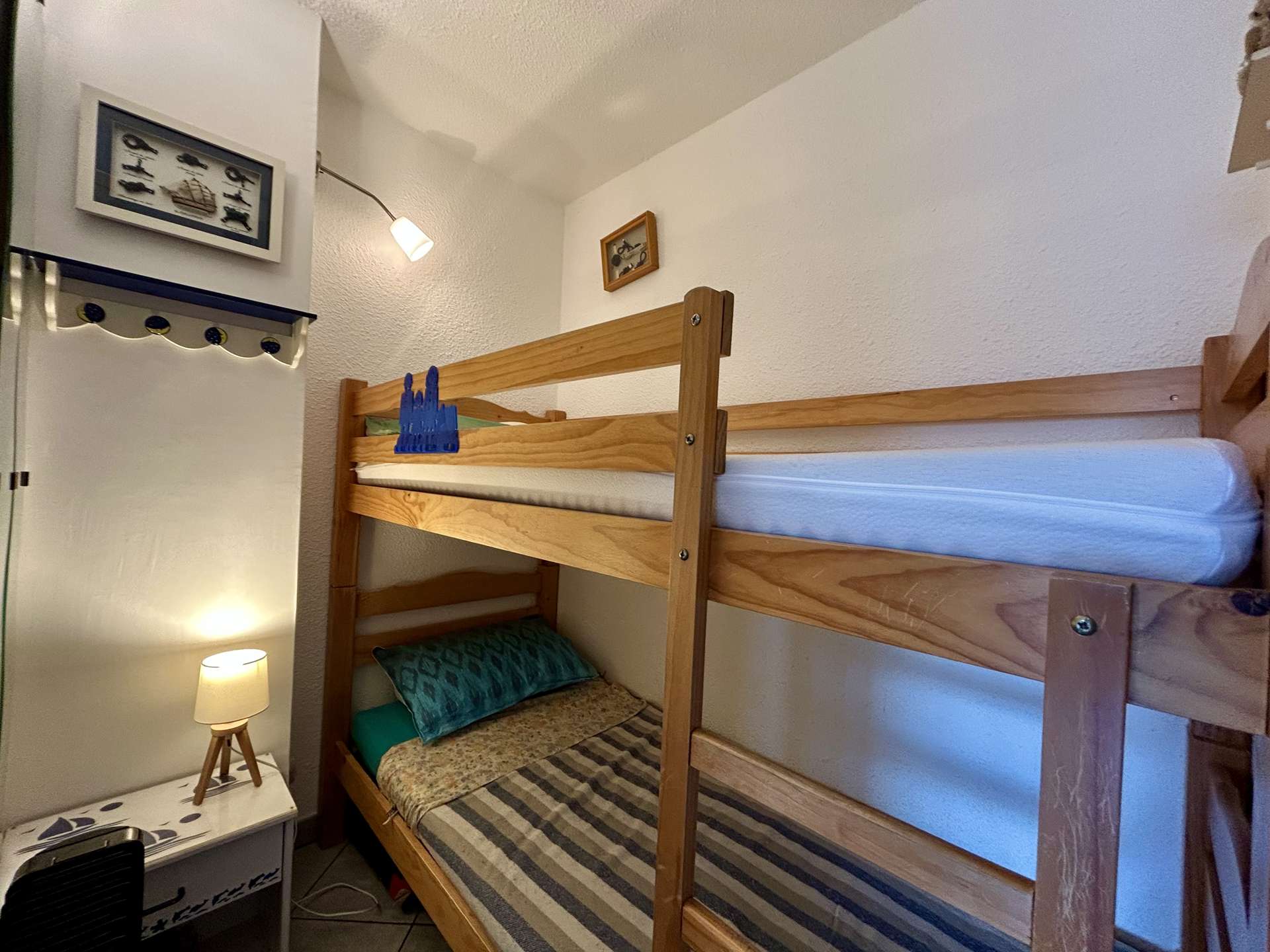 Cet appartement de vacances, situé au 1er étage , comprend un séjour avec un canapé convertible 2 places et télévision avec lecteur DVD, et décodeur TNT, une alcôve avec 2 lits superposés , un coin cuisine équipé, une salle d'eau avec douche et WC
