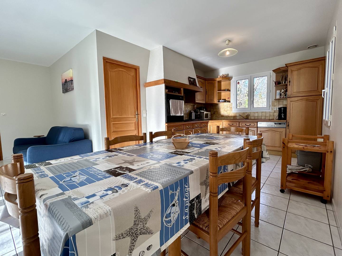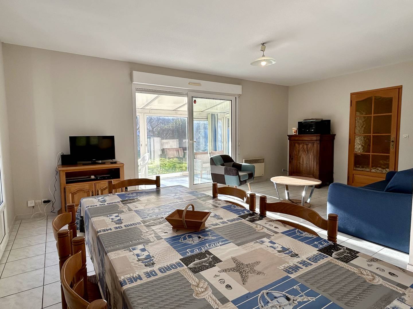 Agréable maison dans un lotissement calme se composant d'une grande pièce de vie avec coin salon avec canapé convertible deux couchages, salle à manger et cuisine aménagée et équipée avec lave-vaisselle, d'une véranda avec mobilier, d'une arrière cuisine avec lave-linge, d'une première chambre avec un lit deux couchages (140) et placard, d'une seconde chambre avec deux lits un couchage (90x2) et placard, d'une salle d'eau et d'un WC séparé.