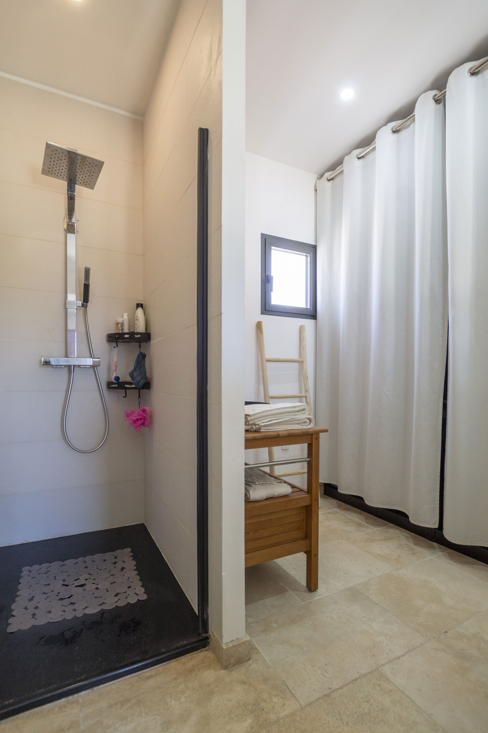The open-plan kitchen is a paradise for any hobby chef. The stylish dining and living room open onto the sunny terrace and garden. Also on the ground floor is the master bedroom with ensuite shower room. On the floor is the 2nd bedroom with roof terrace and ensuite bathroom. Maison des Fleurs is a holiday home with air conditioning.