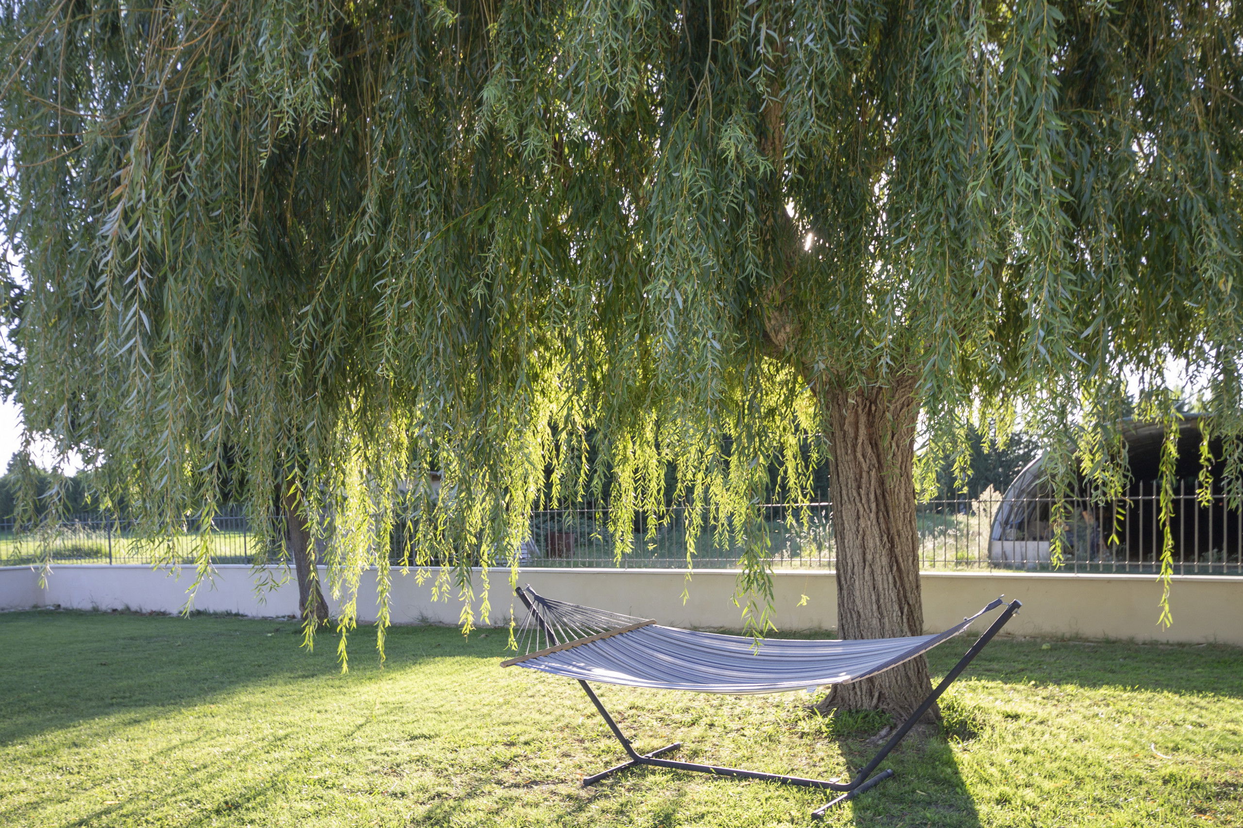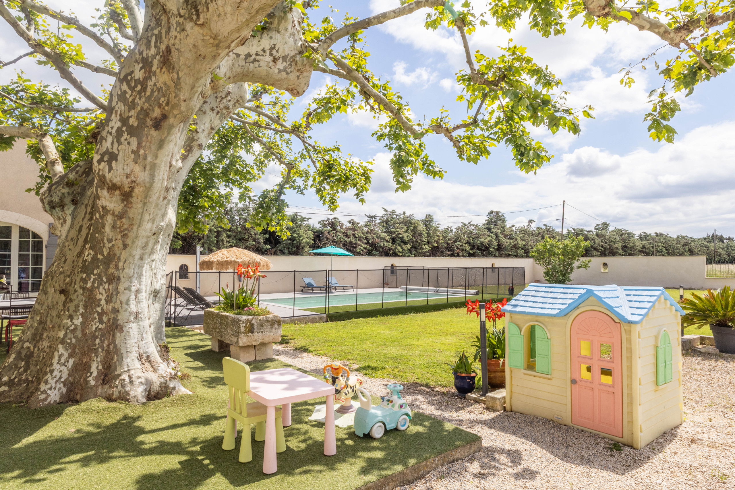The enclosed private pool (4x8m and 1.6m deep) is open from June 1st to September 30th and is equipped with a child safety lock, making it extra safe for children. Sun loungers are placed around the pool for optimal sun enjoyment. Relaxing in the garden lounge on the terrace is a true pleasure, especially thanks to the natural shade provided by the 100-year-old plane tree. From the garden and the terrace, you can enjoy a beautiful view of the surrounding fields and meadows.