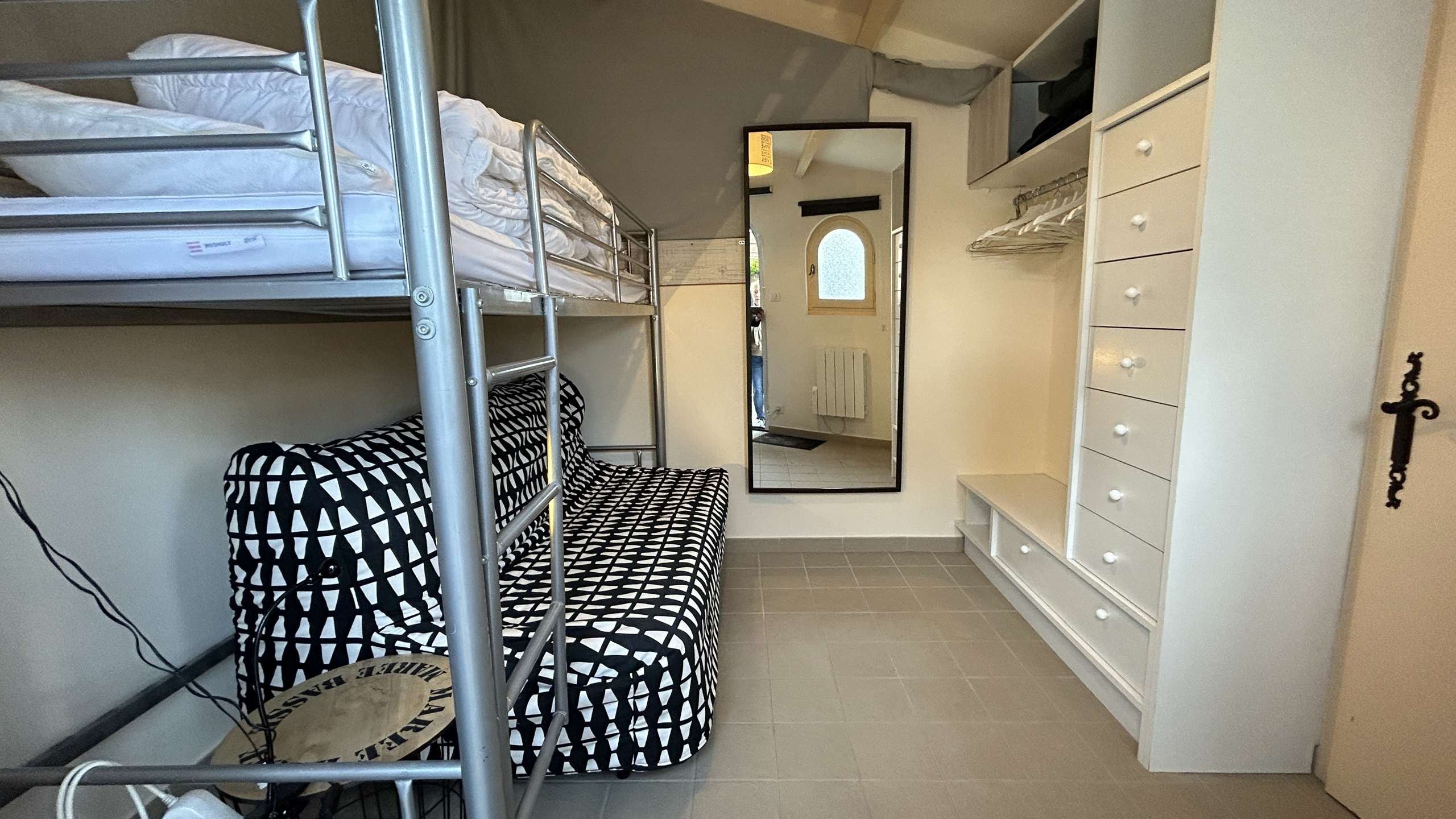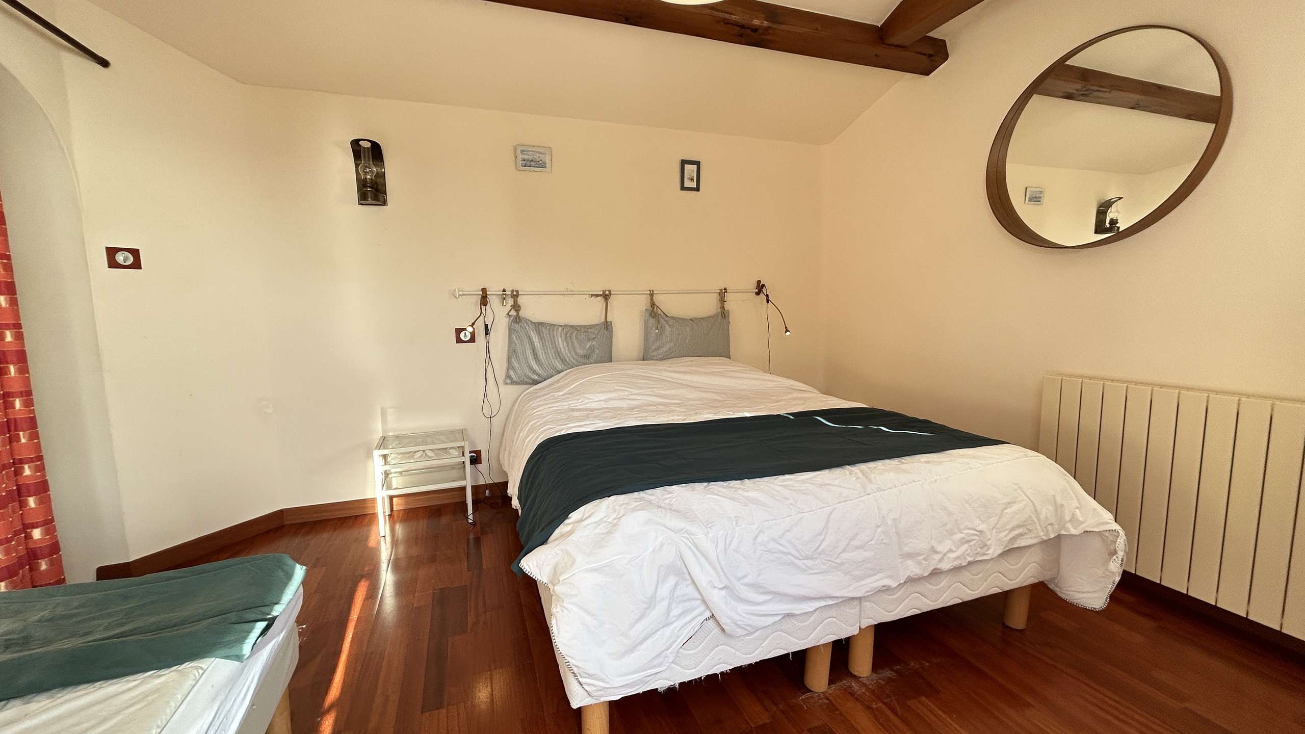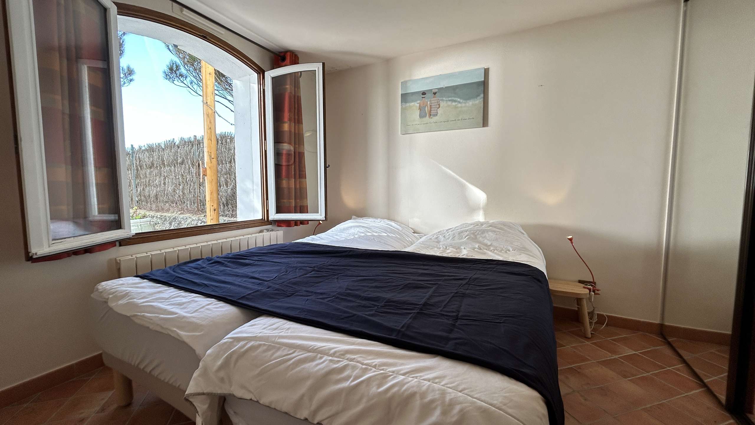 Comfortable house facing the sea comprising an entrance hall, a living room with television opening onto the terrace with sea view, an open fitted kitchen, a bedroom with two 80 cm beds pushed together and adjoining bathroom, a separate toilet. Upstairs, you have a master suite with television, a double bed, a single bed, a beautiful bathroom, a dressing room and a toilet. A studio that can accommodate two people with a sofa bed, a bunk bed, a bathroom and toilet. Cellar with washing machine