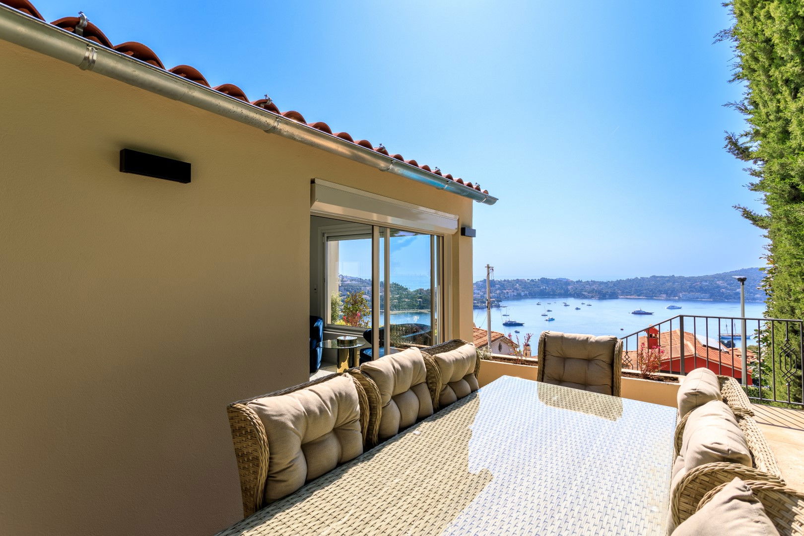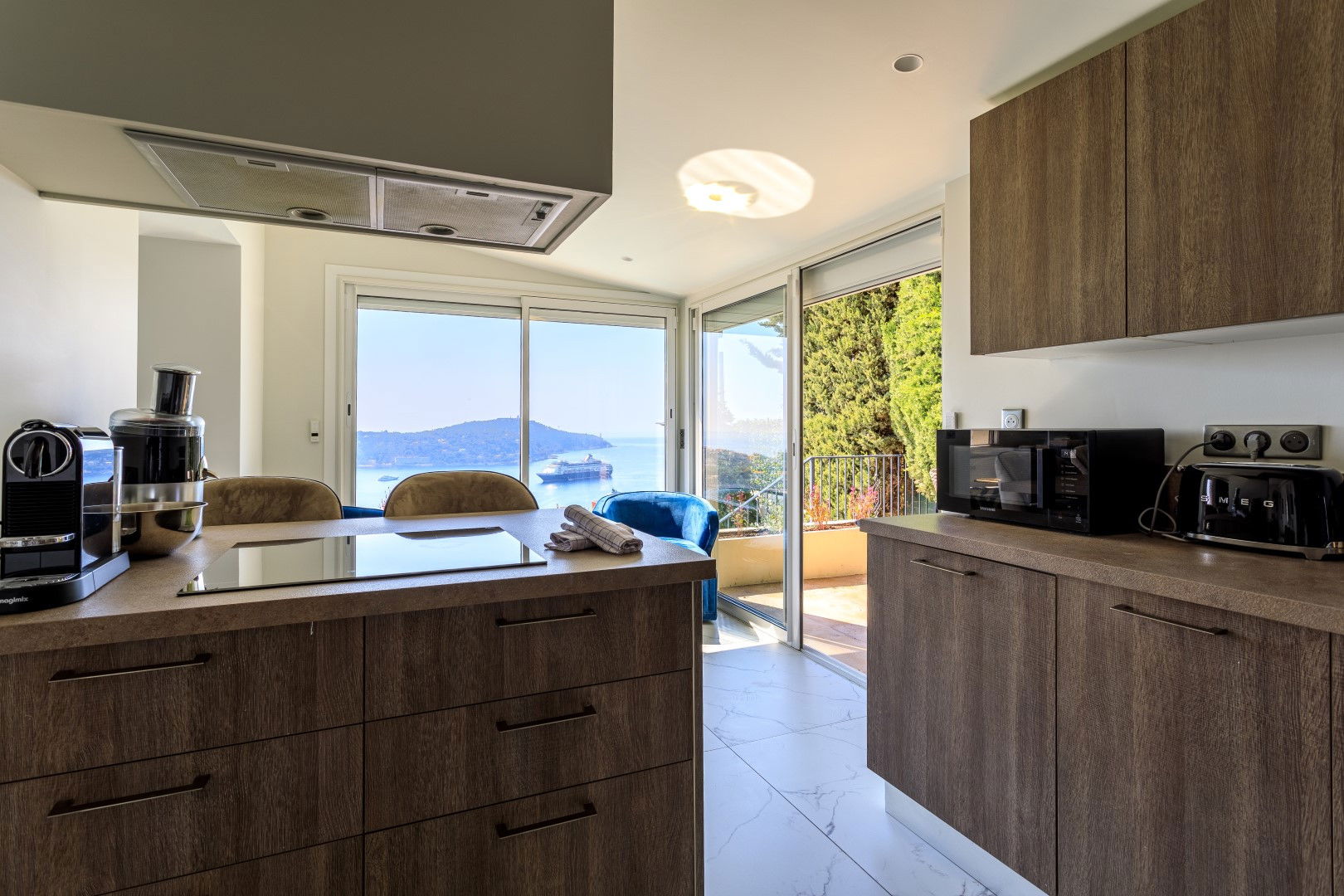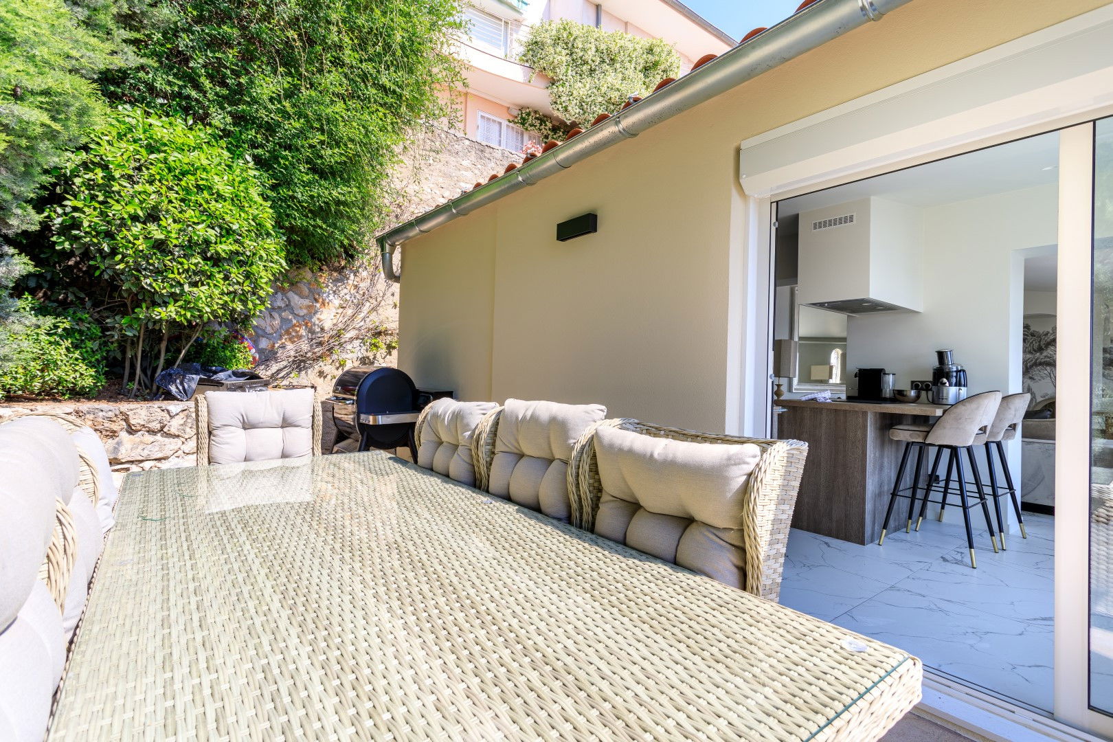 Fully equipped open modern kitchen including a living/dining room opening onto a terrace on the kitchen side with a barbecue and plancha dining area, on the living room side another terrace with lounge area overlooking the swimming pool with magnificent sea view over the Villefranche harbor.