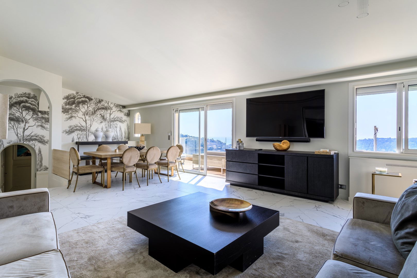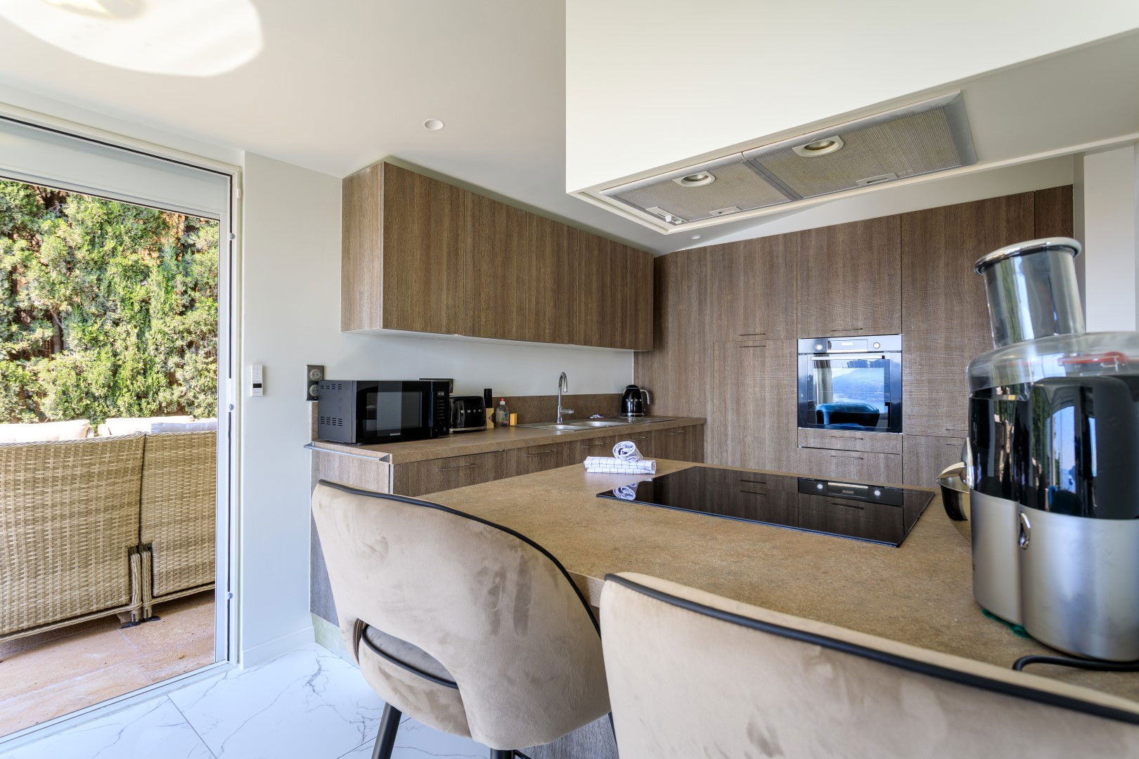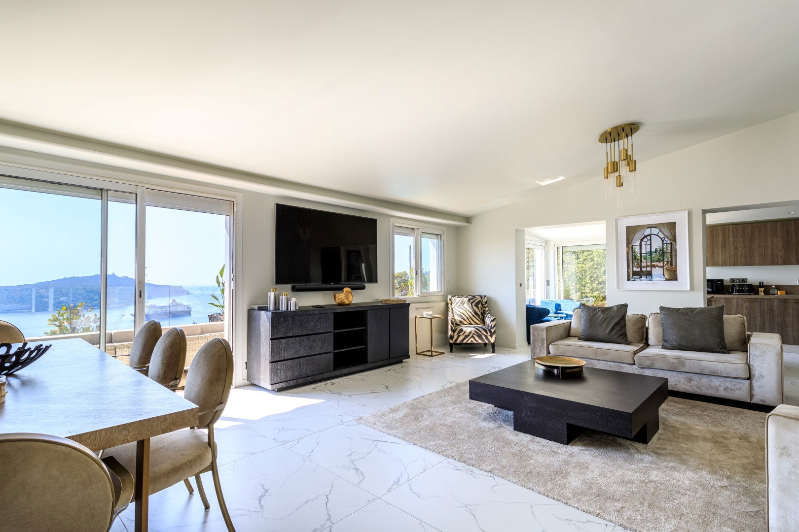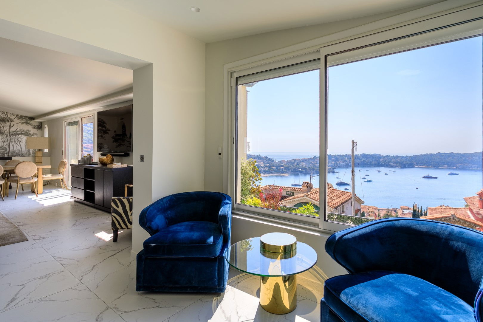 Fully equipped open modern kitchen including a living/dining room opening onto a terrace on the kitchen side with a barbecue and plancha dining area, on the living room side another terrace with lounge area overlooking the swimming pool with magnificent sea view over the Villefranche harbor.