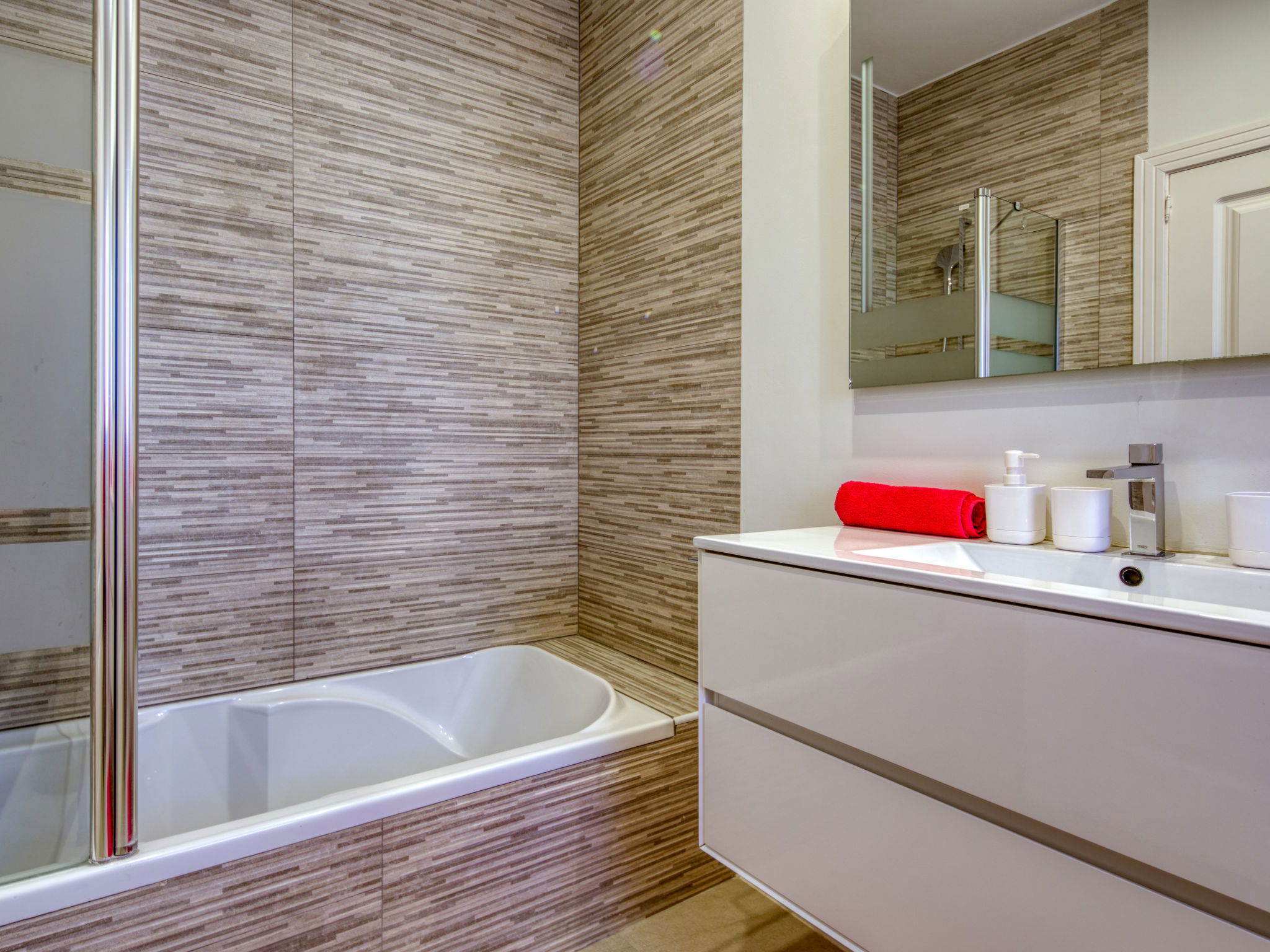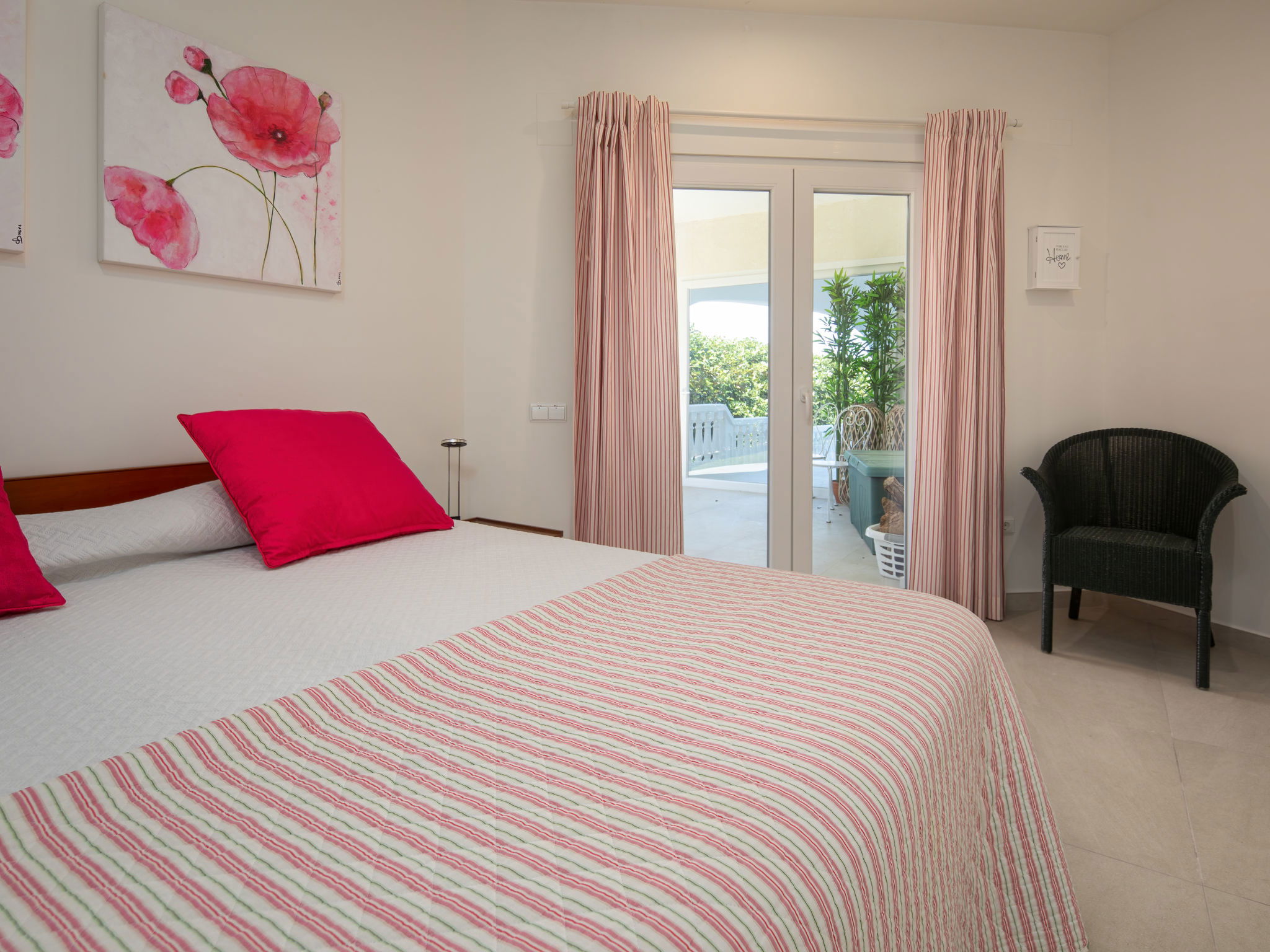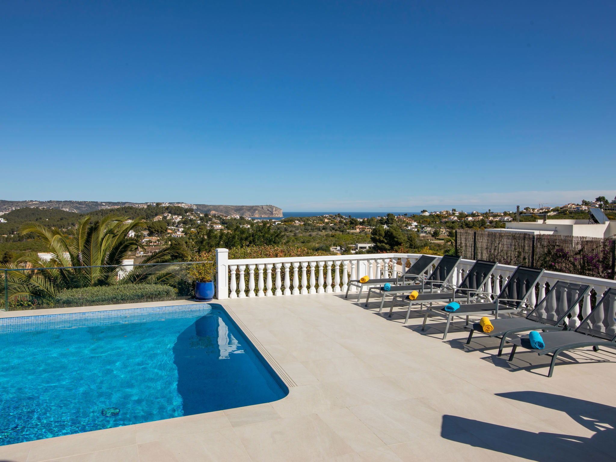 "Villa Bonheur", 5-room villa 280 m2. Spacious and bright, very beautiful and luxurious furnishings: living room with satellite TV, digital TV and air conditioning. Exit to the terrace, to the swimming pool. Dining room with air conditioning. Exit to the terrace. 1 room with 1 french bed (2 x 90 cm, length 200 cm), bath/WC, hand-basin and air conditioning. Exit to the terrace, to the swimming pool. 1 room with 1 french bed (2 x 90 cm, length 200 cm), hand-basin, shower/WC and air conditioning. 1 room with 2 beds (90 cm, length 200 cm), hand-basin, shower/WC and air conditioning. Large, open kitchen (oven, dishwasher, 4 induction hot plates, toaster, microwave, freezer, electric coffee machine) with air conditioning. Sep. WC. No heating option. Large terrace. Terrace furniture, barbecue, deck chairs, covered balcony. Marvellous panoramic view of the sea, the mountains and the valley. Facilities: washing machine, iron, mosquito net, hair dryer. Internet (WiFi, free). VT-477698-A // Reg. Nr.: ESFCTU00000307100055494400000000000000000VT-477698-A2