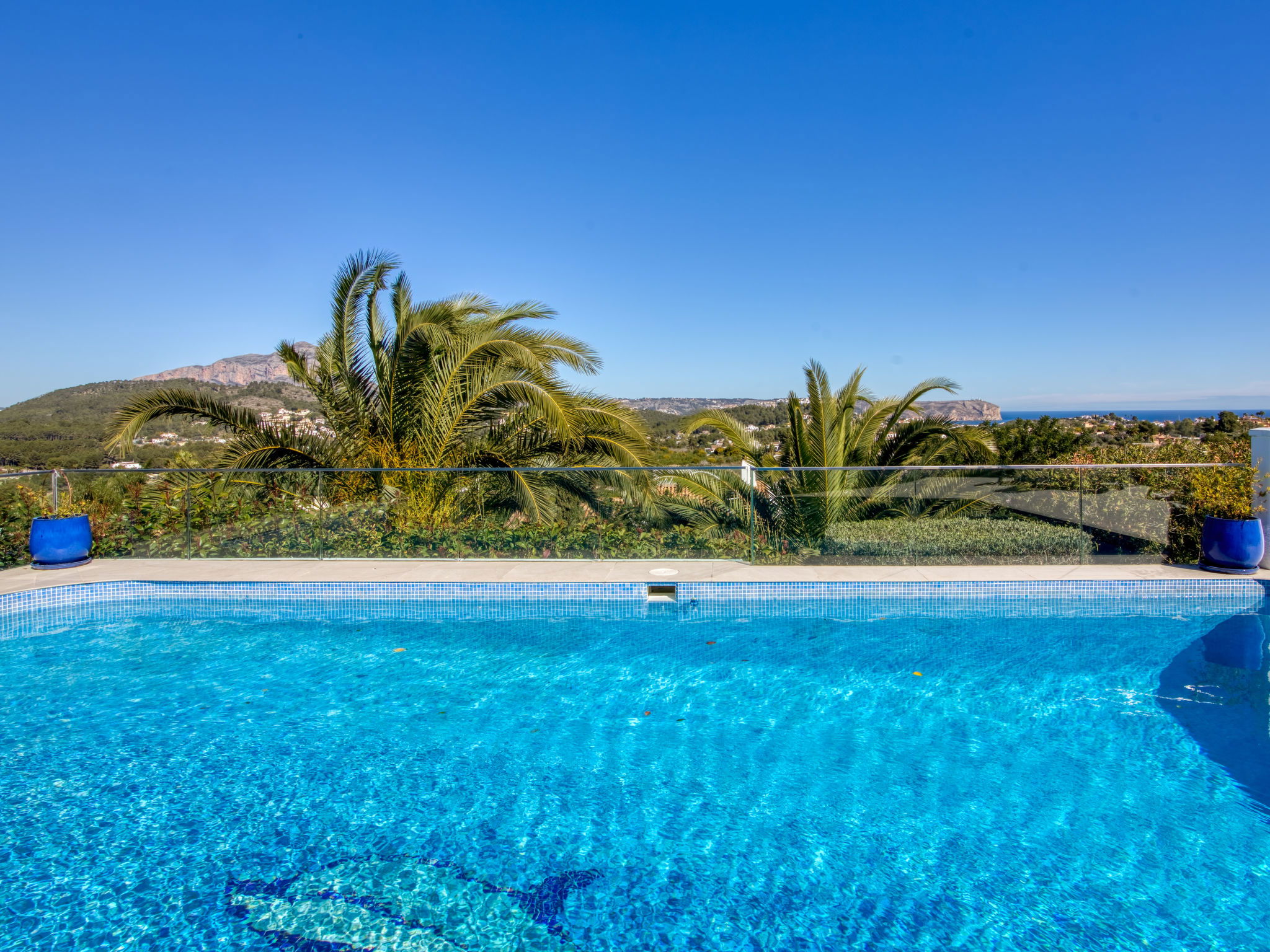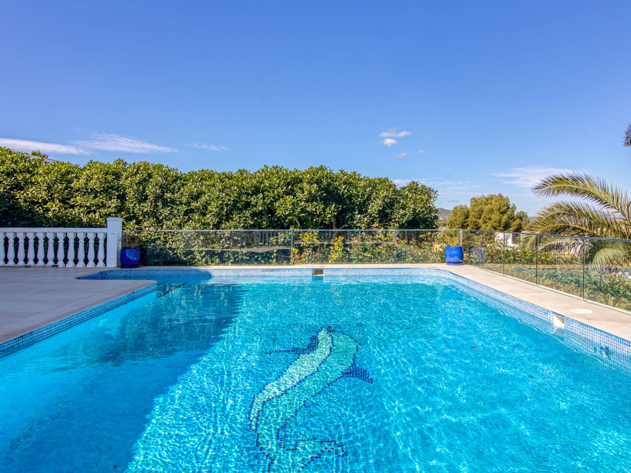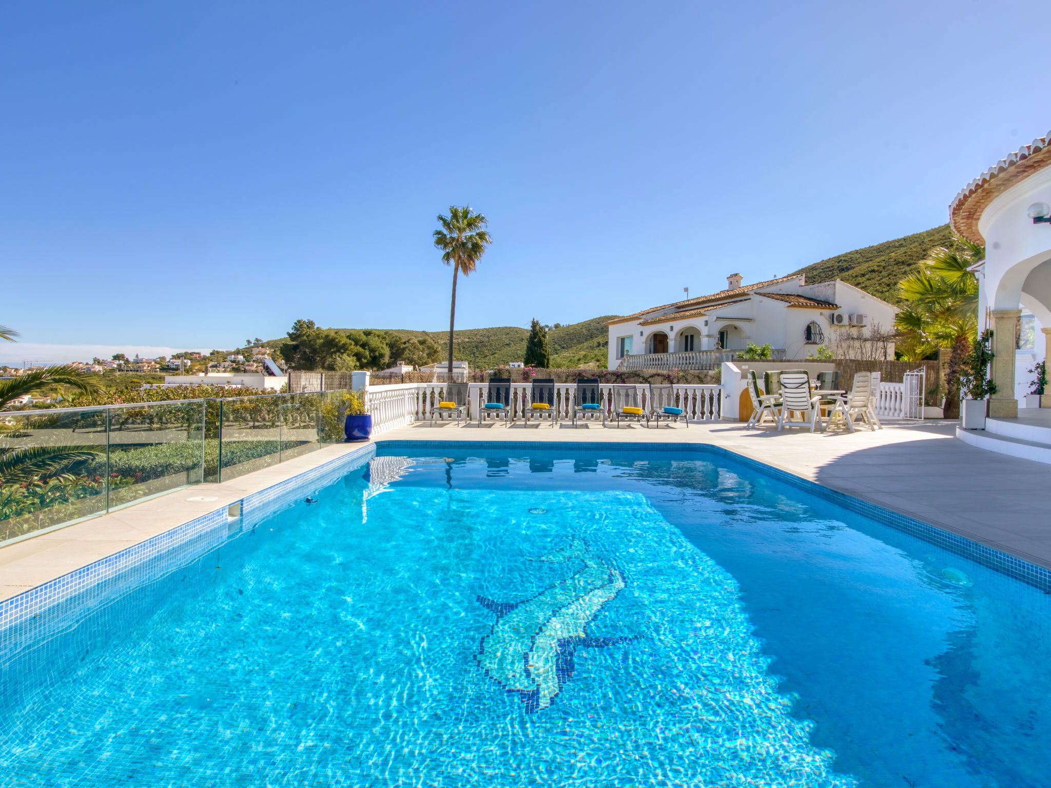 Very large, very beautiful, luxurious villa "Bonheur", 2 storeys. In the district of Valle del Sol, 3 km from the centre of Jávea - El Arenal, in a quiet, sunny position, 3 km from the sea, 3 km from the beach. Private: large, beautiful, well-kept garden with lawn and trees, swimming pool angular, secured, fenced (10 x 5 m, depth 90 - 250 cm, seasonal availability: 01.Jan. - 31.Dec.) with internal staircase. Patio, pergola, garden furniture, barbecue. Stepped path (10 steps) to the house. Parking (for 2 cars) on the premises. Shop 1.2 km, restaurant 800 m, bar 1.2 km, bus stop 5 km, sandy beach "El Arenal" 3 km, shingle beach "Portitxol" 4 km. Golf course (9 hole) 4 km, surf school 3 km, sailing school 3 km, tennis 3 km. Please note: car recommended. The owner does not accept any youth groups.