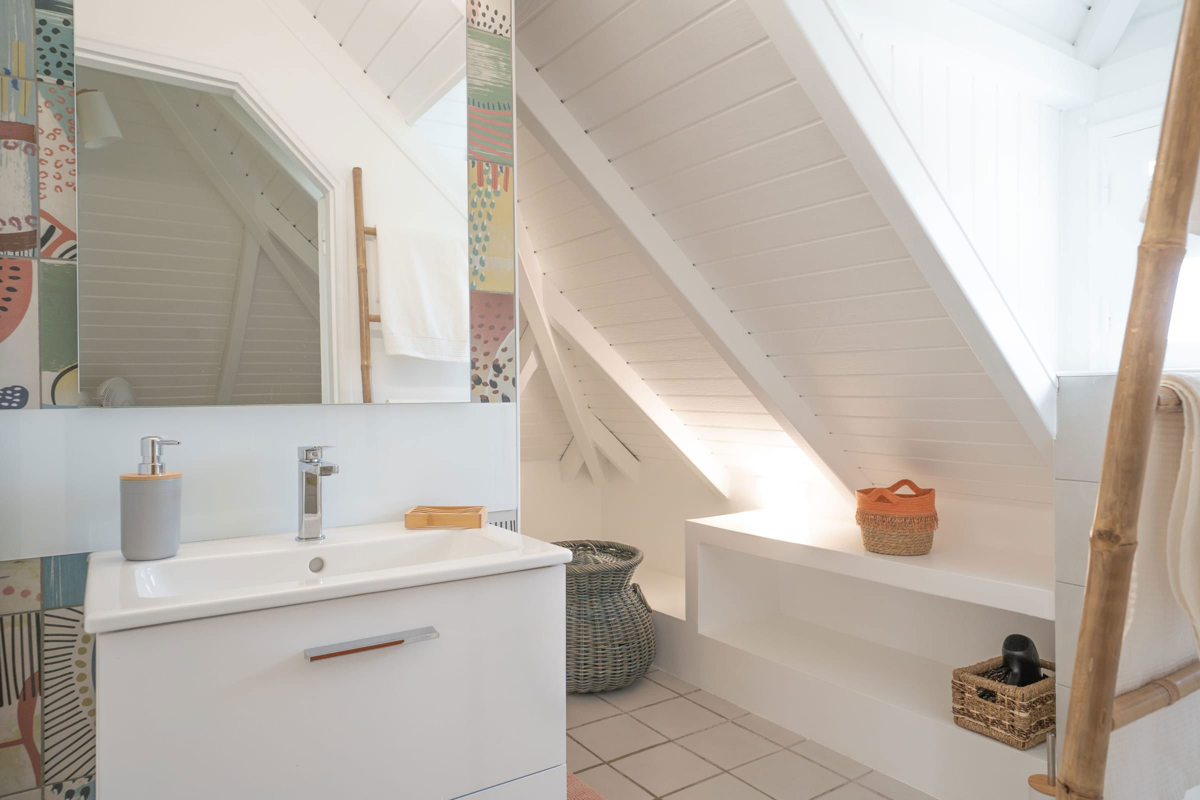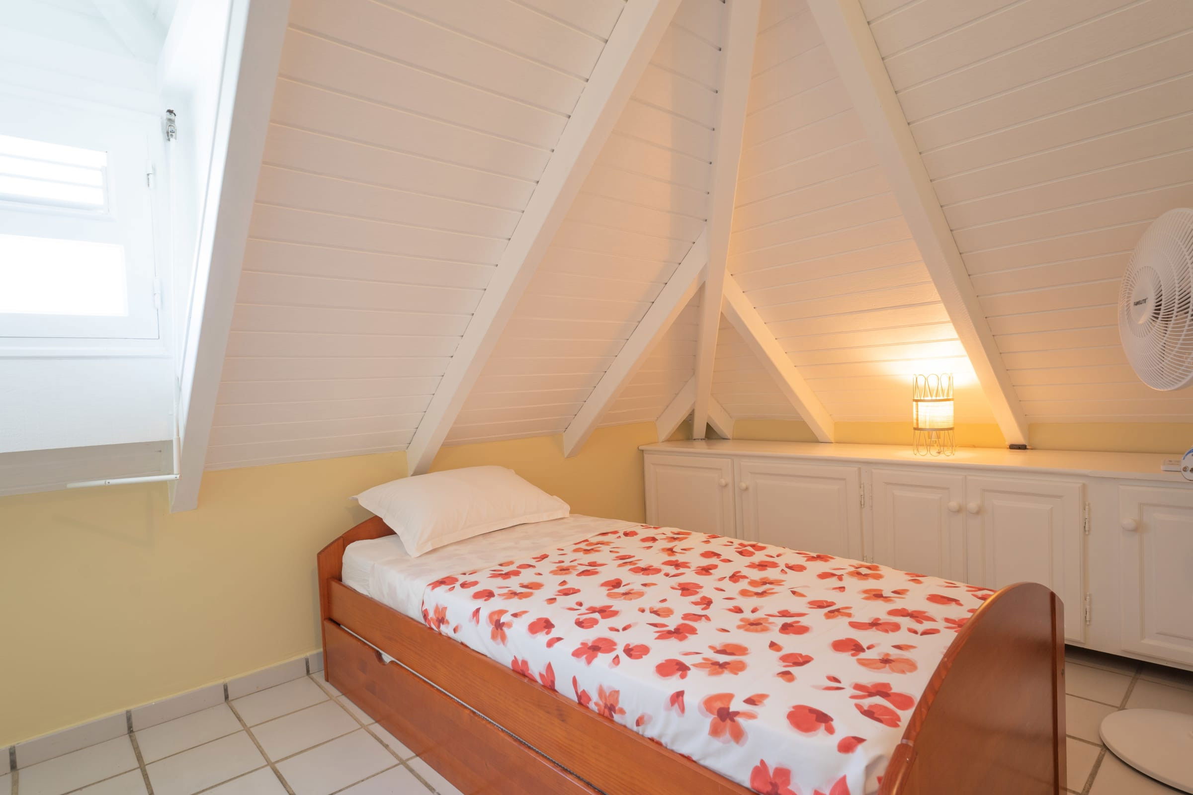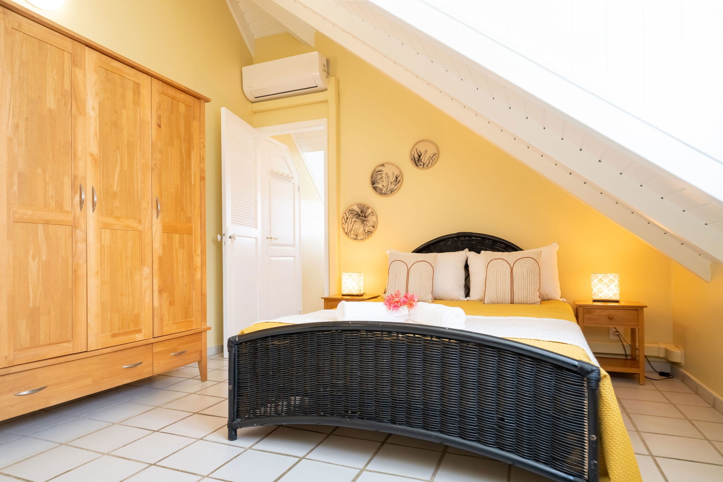 Inside, you'll find three air-conditioned bedrooms for your comfort. A spacious master suite with a 160cm bed and en-suite bathroom is a haven of peace for couples. TThe other two bedrooms have 140 cm beds, one of which has a sleeping area for young children (with a fan but no AC), and share an additional bathroom.