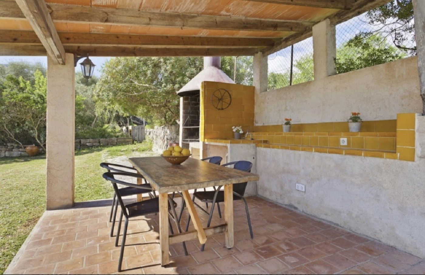 ☀ Covered barbecue area with outdoor dining, ideal for family meals even in low season.