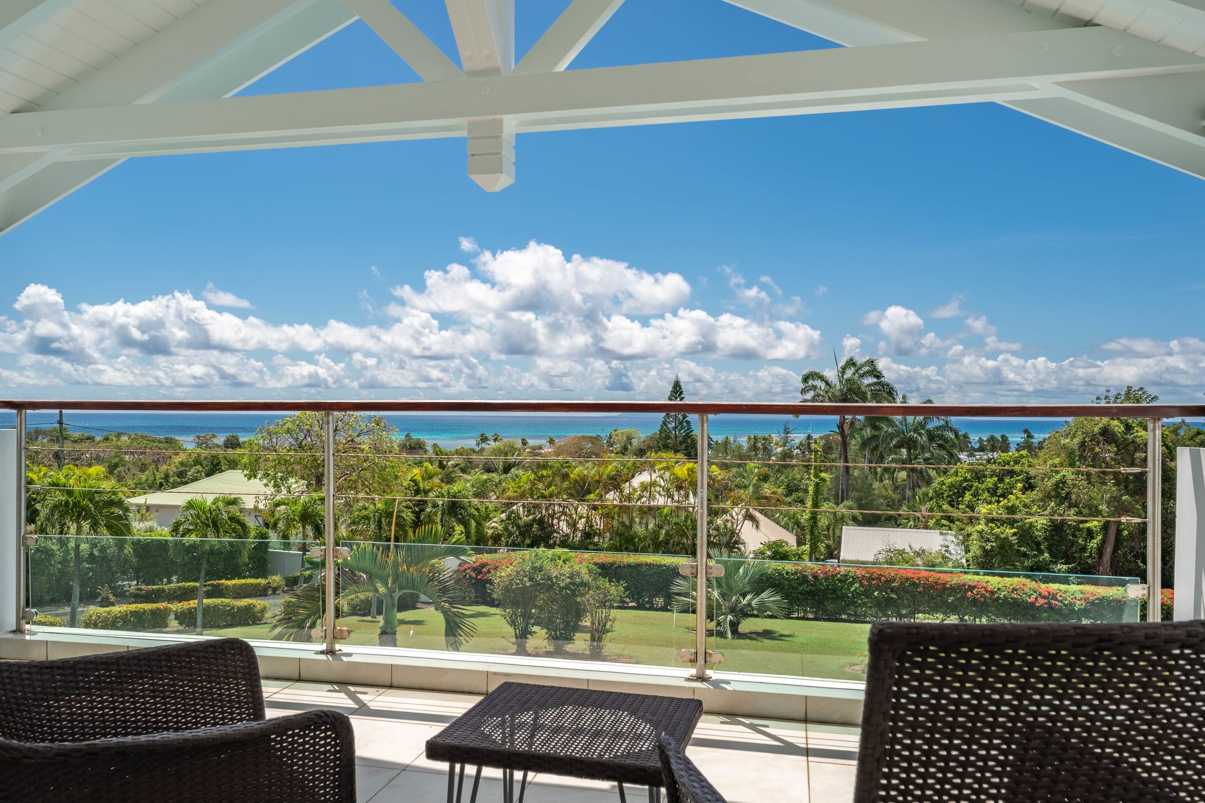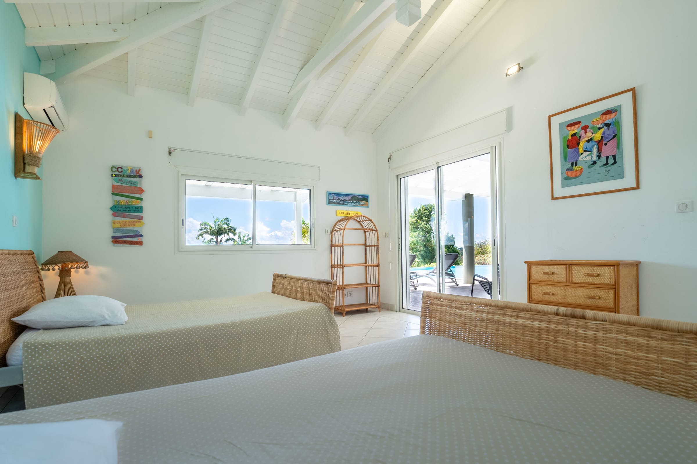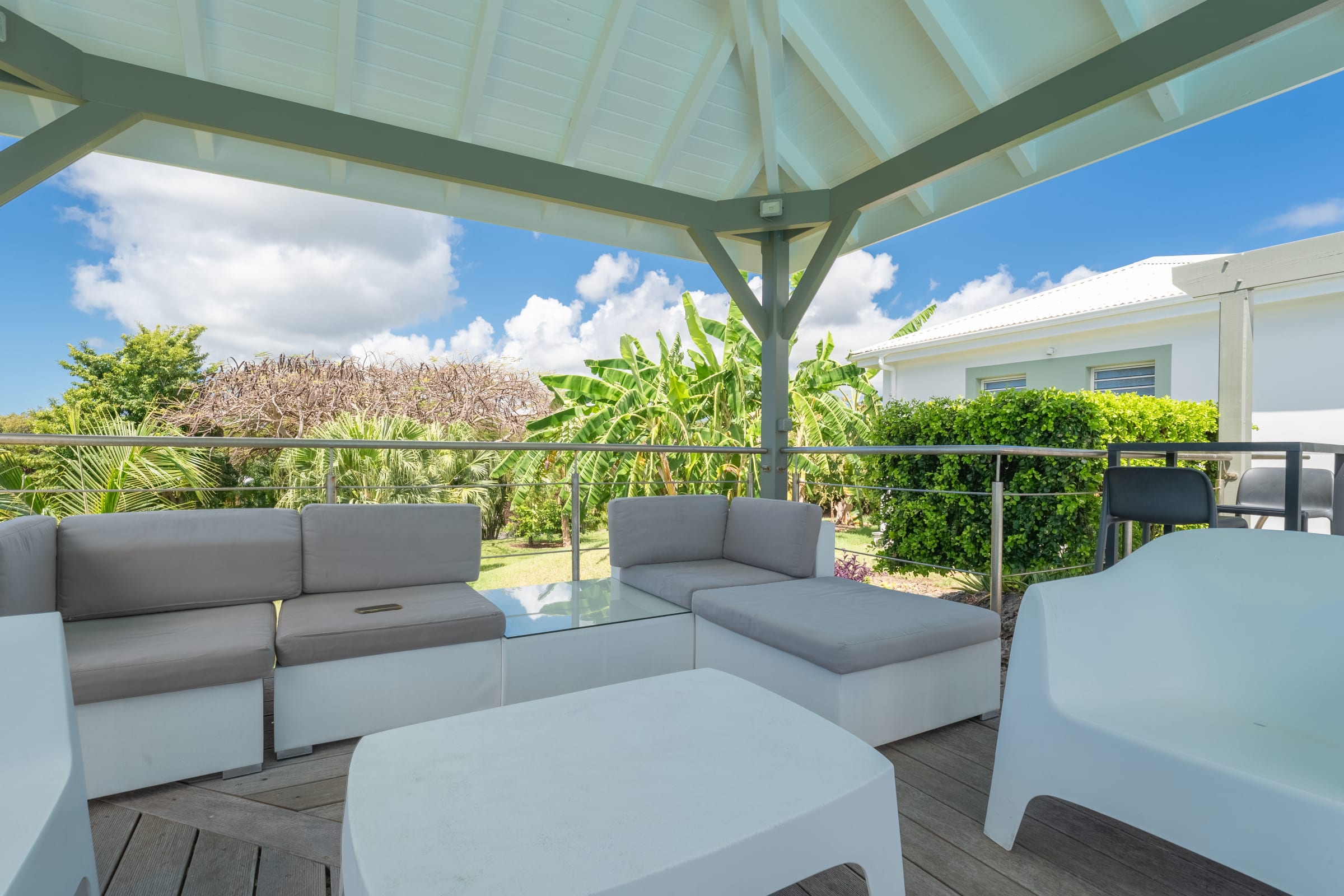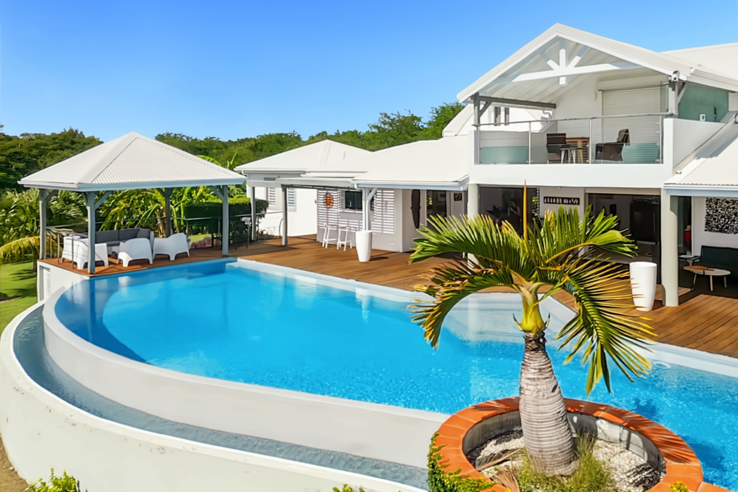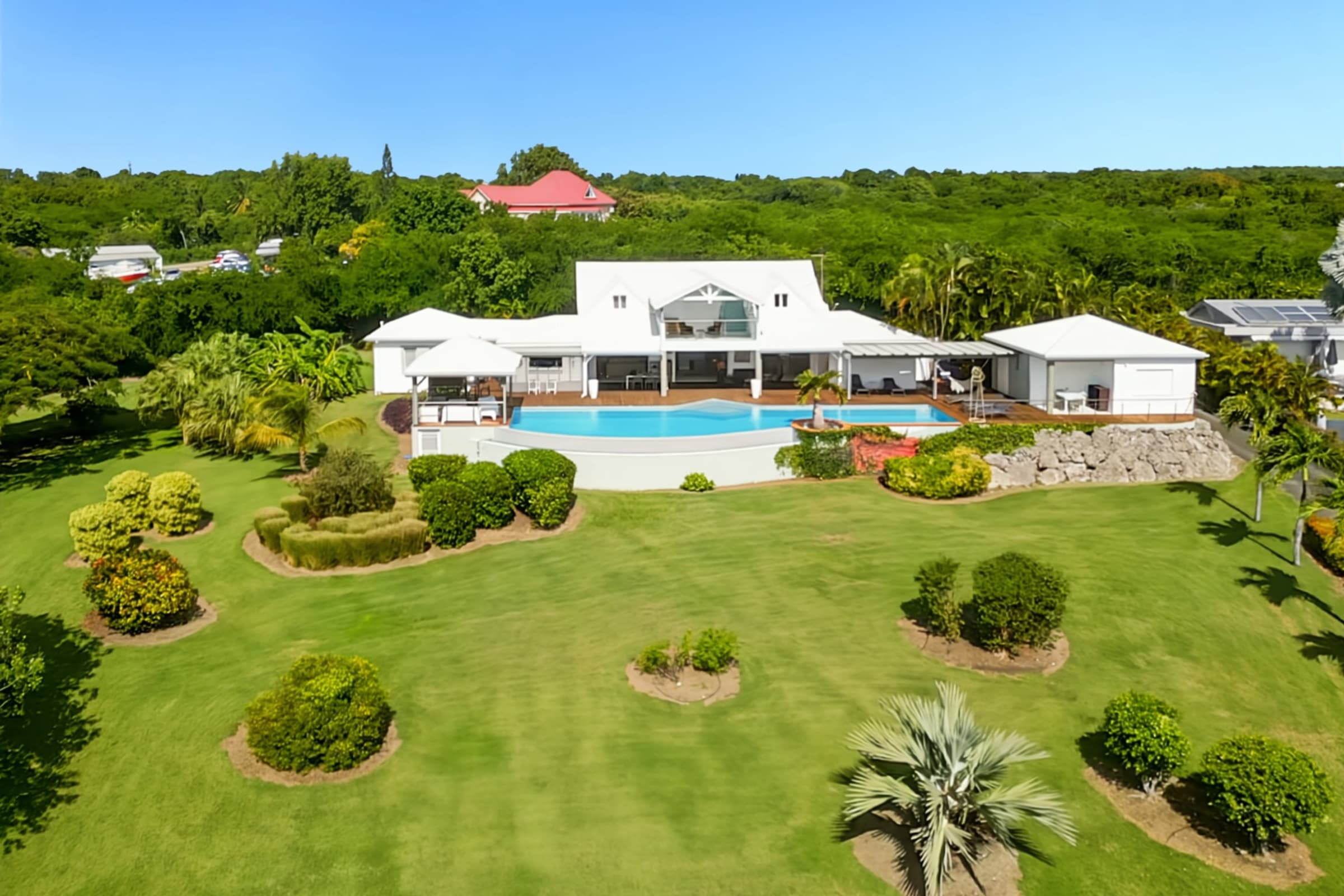 Villa Karukera welcomes you to a modern, spacious setting, ideal for large families or groups of friends. With 5 air-conditioned bedrooms, each with en-suite bathroom, you'll enjoy absolute comfort and the privacy you need for a relaxing vacation. The spacious living room opens onto the infinity pool, providing the ideal space for relaxation, while the pool table and darts add a playful touch to your stay. The fully-equipped kitchen and outdoor terrace with barbecue let you make the most of outdoor living, with breathtaking sea views. A very large garden is ideal for children to play in complete safety.