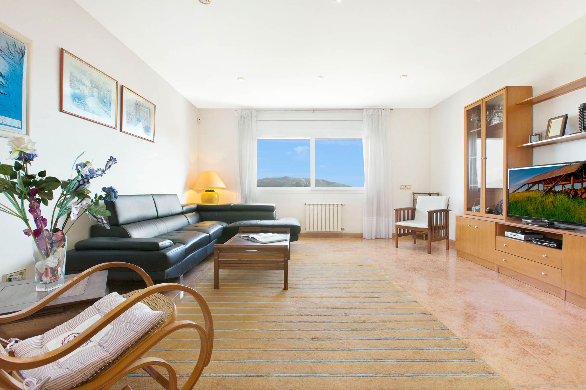The large and bright living room has satellite tv with french channels available and a stereo system.