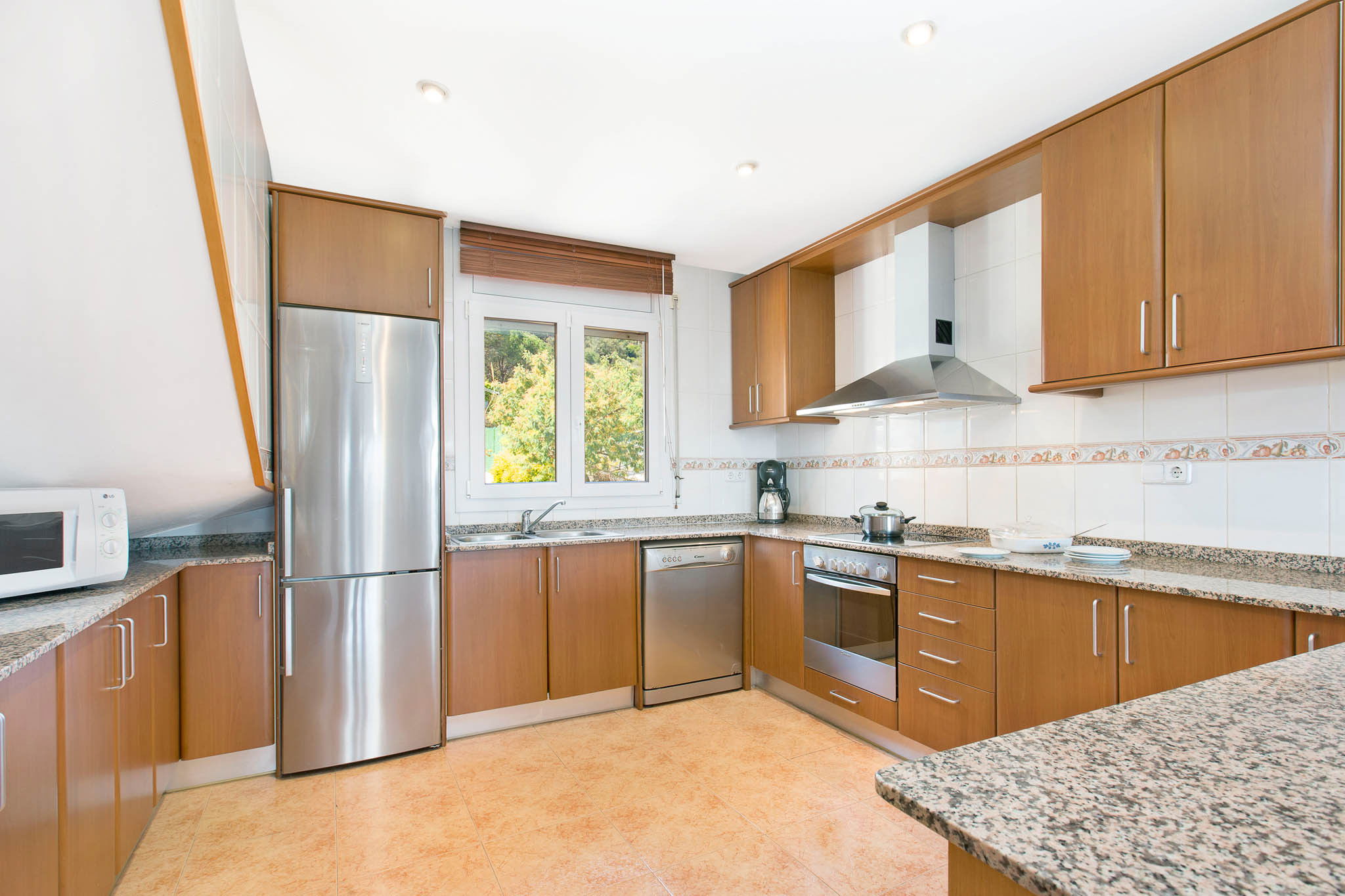 Open and fully equipped kitchen with fridge, freezer, vitroceramic cooktop, oven, microwave, electric coffee machine, dishwasher and washing machine.