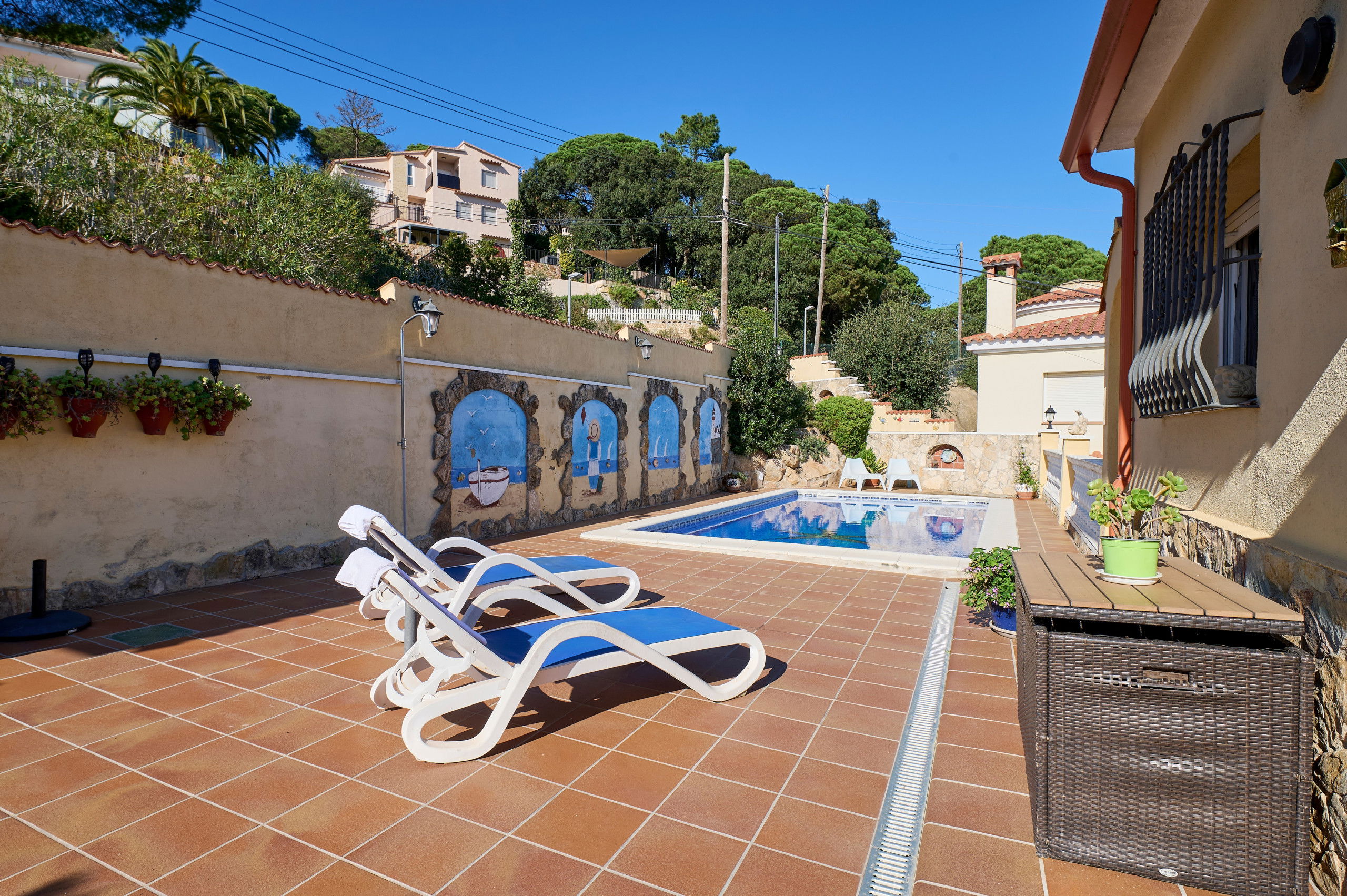 Beautiful house with private pool and sea views, situated in a quiet residential area only 4km from the beautiful and quiet beach of Canyelles, 6km from Lloret del Mar town centre and 8km from Tossa del Mar, one of the most charming towns on the Costa Brava! This property is ideal for enjoying family holidays on the Costa Brava! There is an outdoor area of 600m2 with private garden and pool (8x4m), a terrace with beautiful sea views where you will be able to enjoy an al fresco breakfast as well as a built in barbecue area and parking. The indoor space (100m2) consists of a living room with satellite TV and Hi-Fi system, a fully equipped kitchen (fridge, microwave, dishwasher, washing machine), 2 double bedrooms (135x200cm beds), 1 bedroom with 2 single beds (90x190cm) and 2 bathrooms with shower. Free WIFI. Optionial heating: 50 €/week. Youth groups not accepted.Esta propiedad sólo es para familias. Reservations for young people under 35 years of age are not allowed. Pets are not allowed.