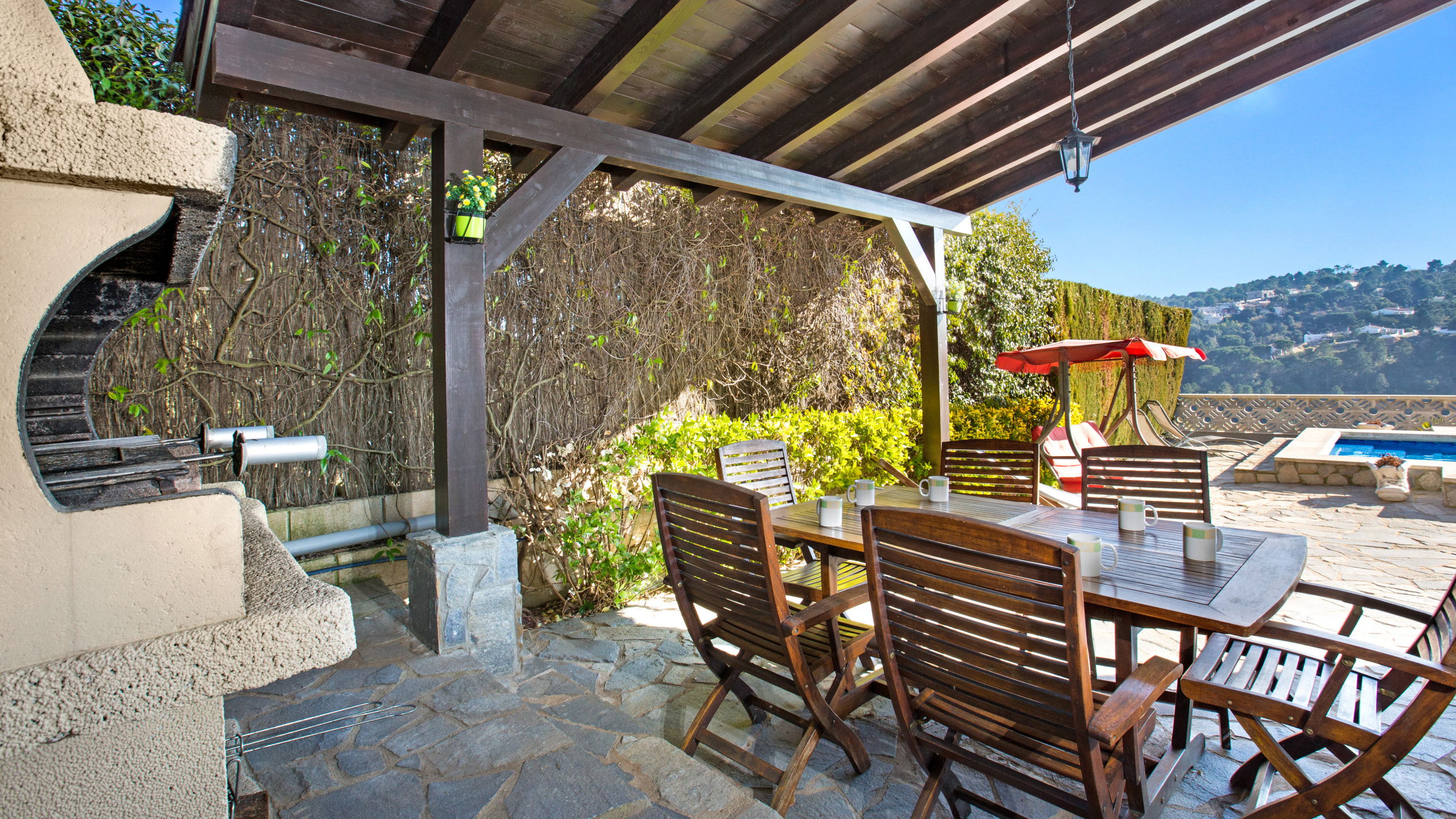 Outdoor area with private pool with beautiful mountain views, fully covered barbecue area where you can enjoy breakfasts and meals in front of the pool. There is also a garden and the possibility of parking 2 cars, one behind the other.