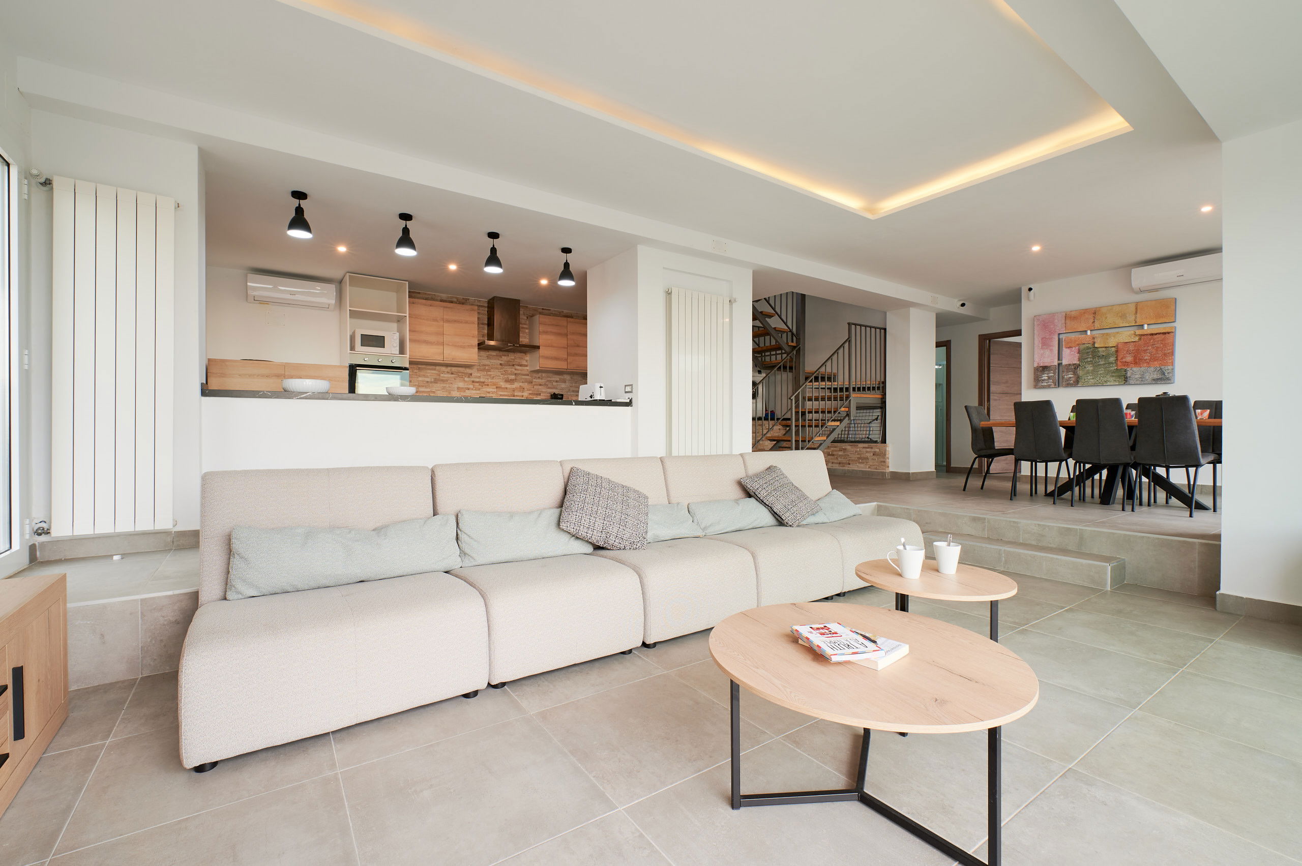 On the lower floor, we find another suite (double bed and shower) with access to the terrace; a spacious living-dining room with TV, a fully equipped American kitchen (ceramic hob, oven, microwave, dishwasher, washing machine).