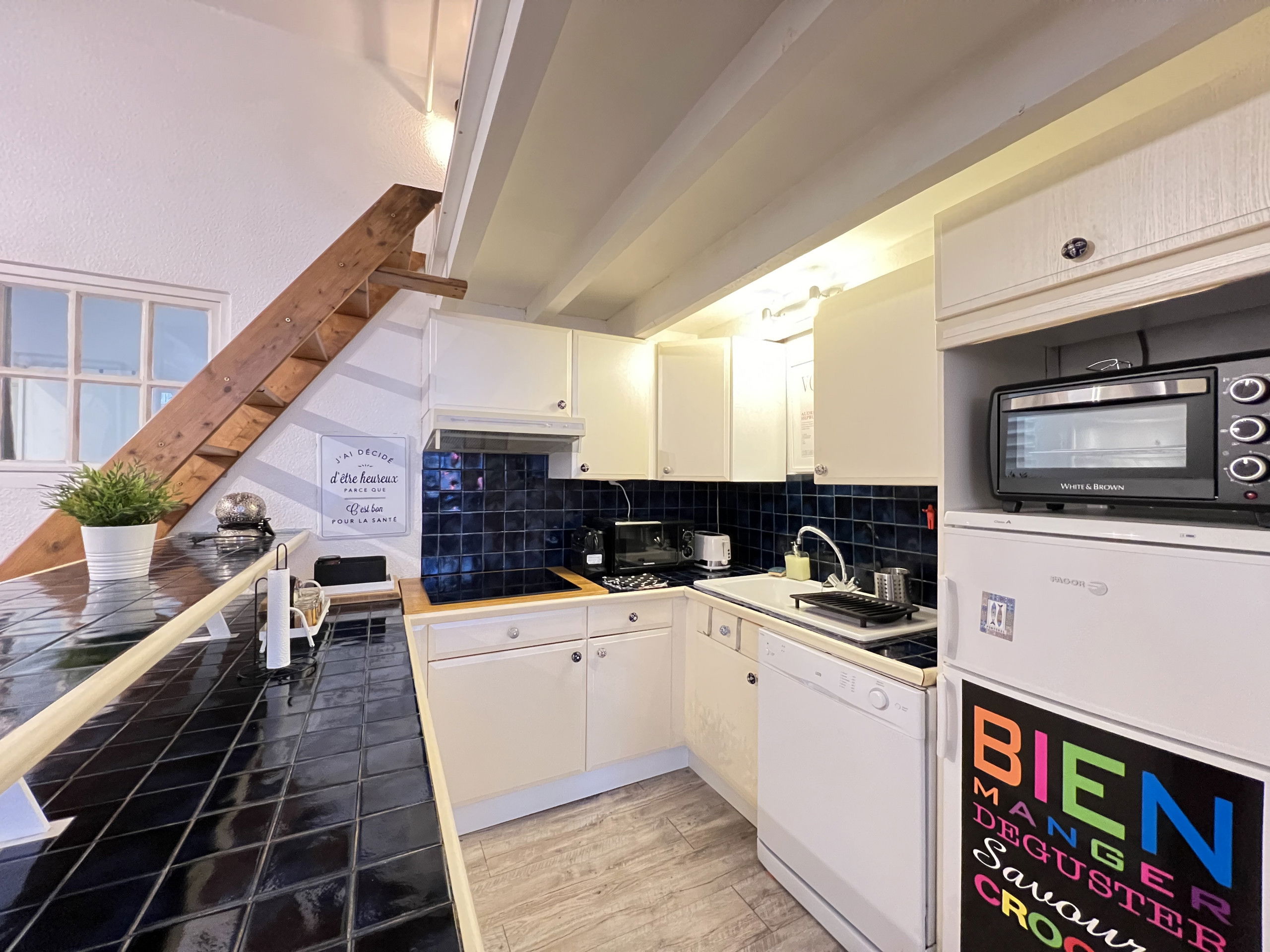 The open plan kitchen, electric, is equipped with refrigerator, microwave, freezer, dishwasher, dishes/cutlery, kitchen utensils, coffee machine, toaster and kettle.