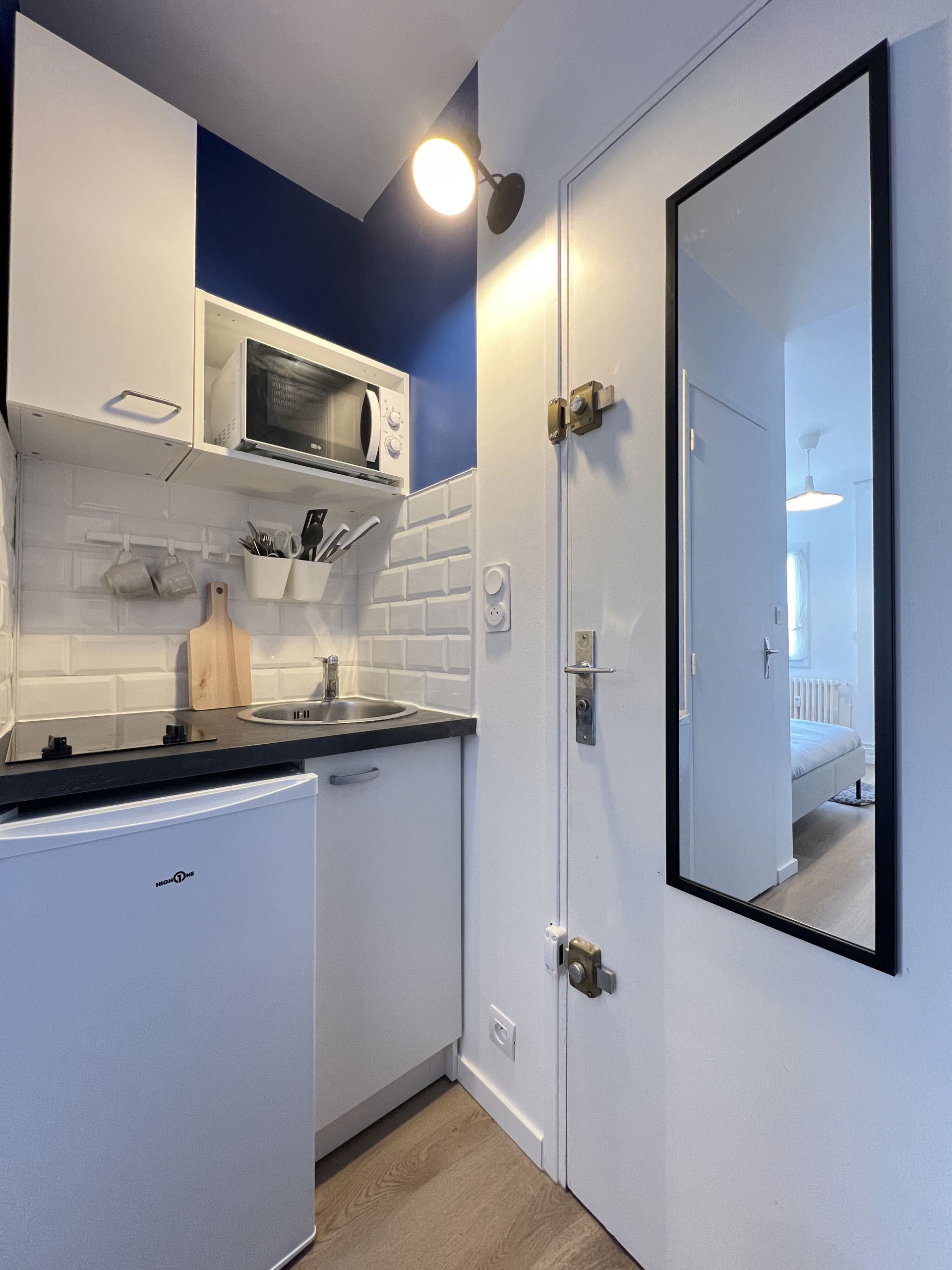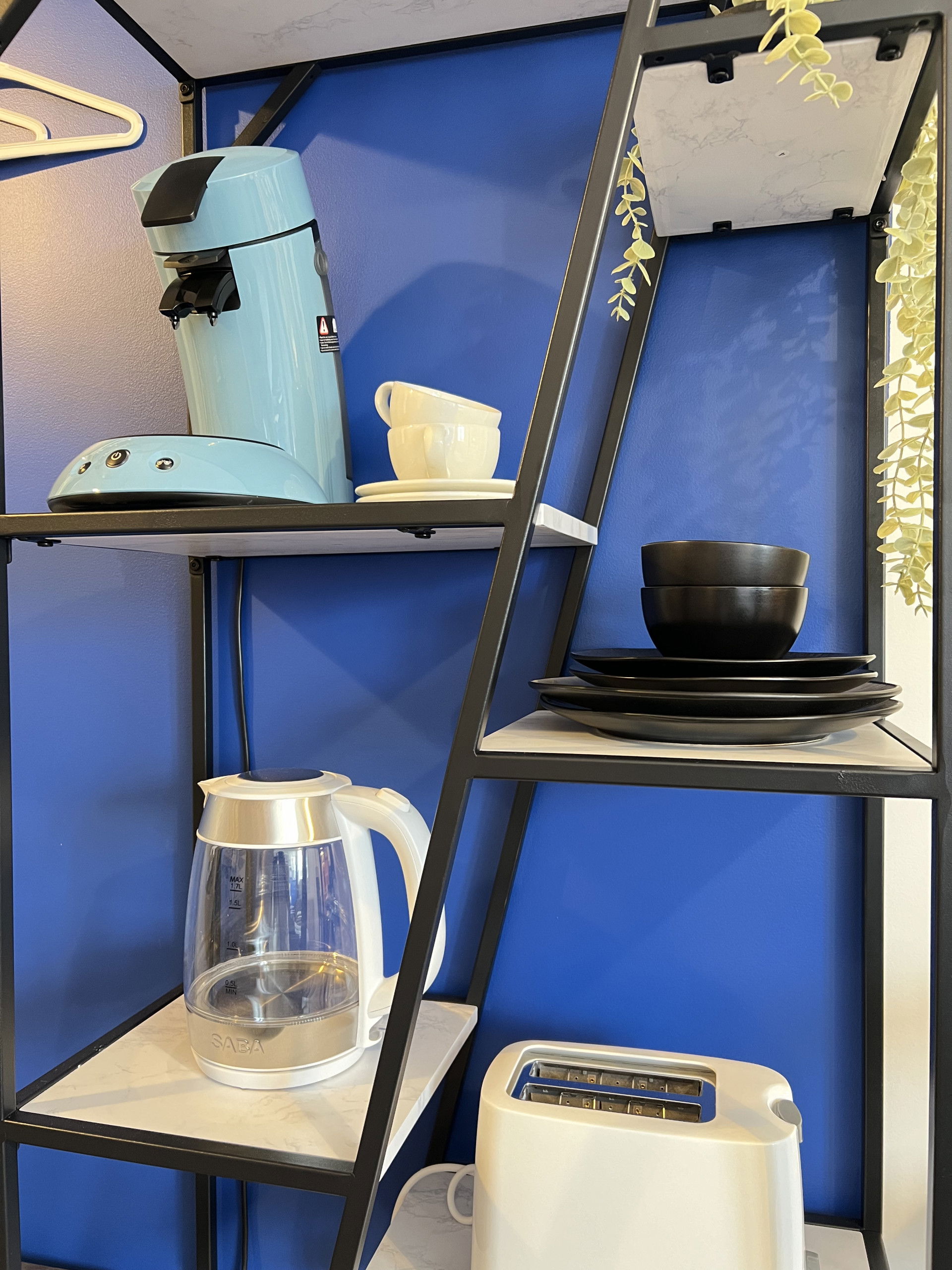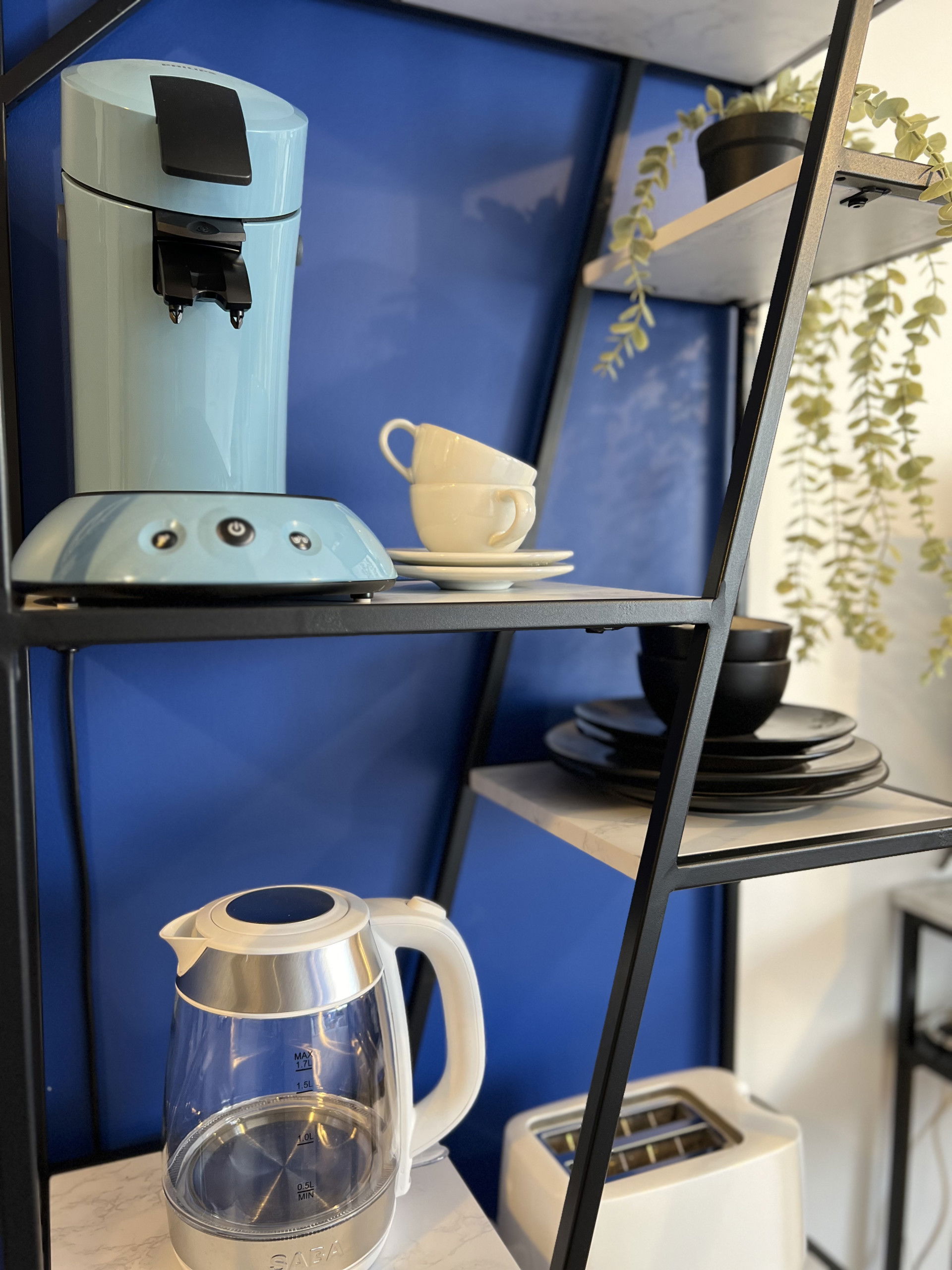 The open plan kitchen, electric, is equipped with refrigerator, microwave, dishes/cutlery, kitchen utensils, coffee machine, toaster and kettle.