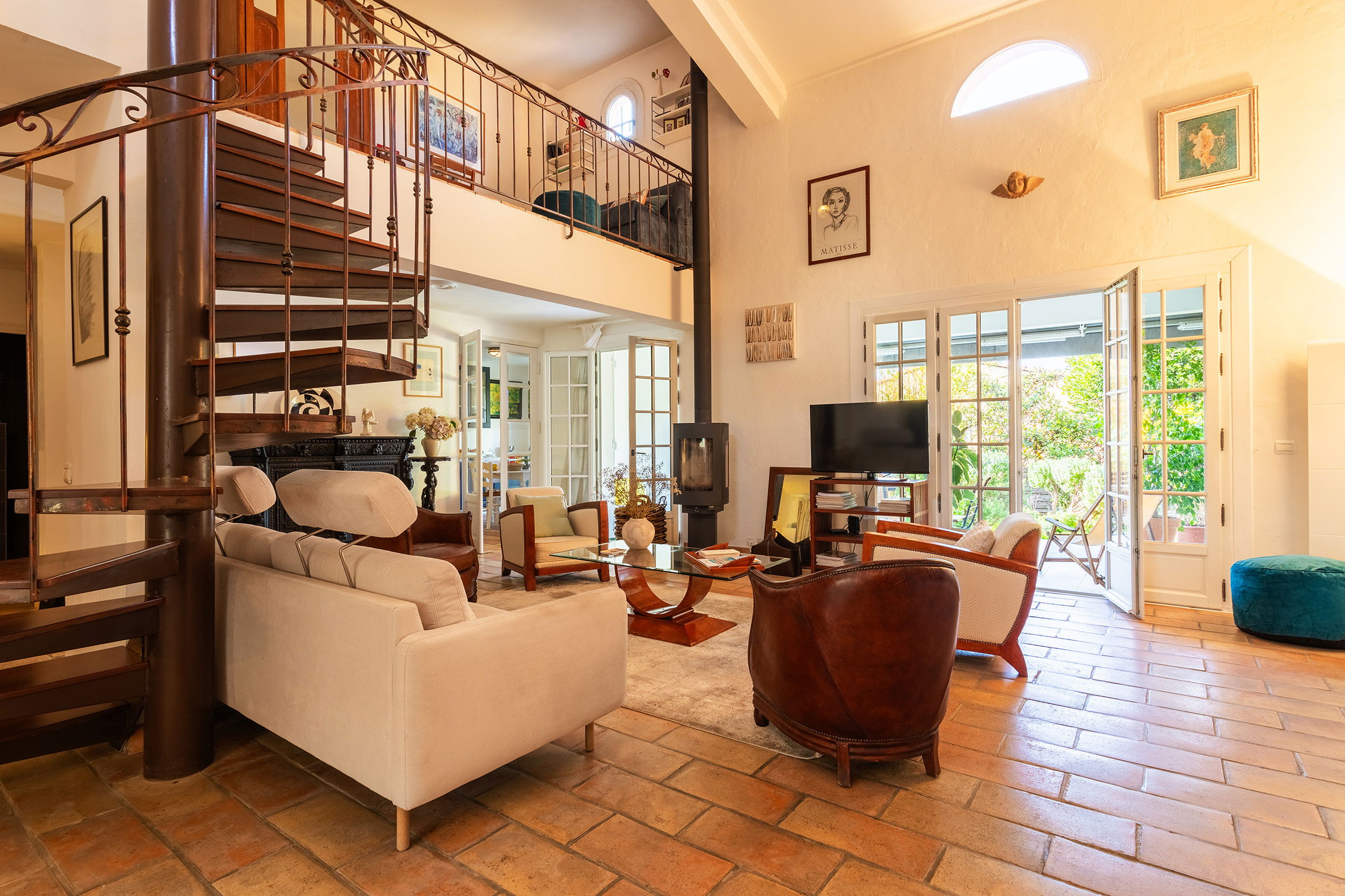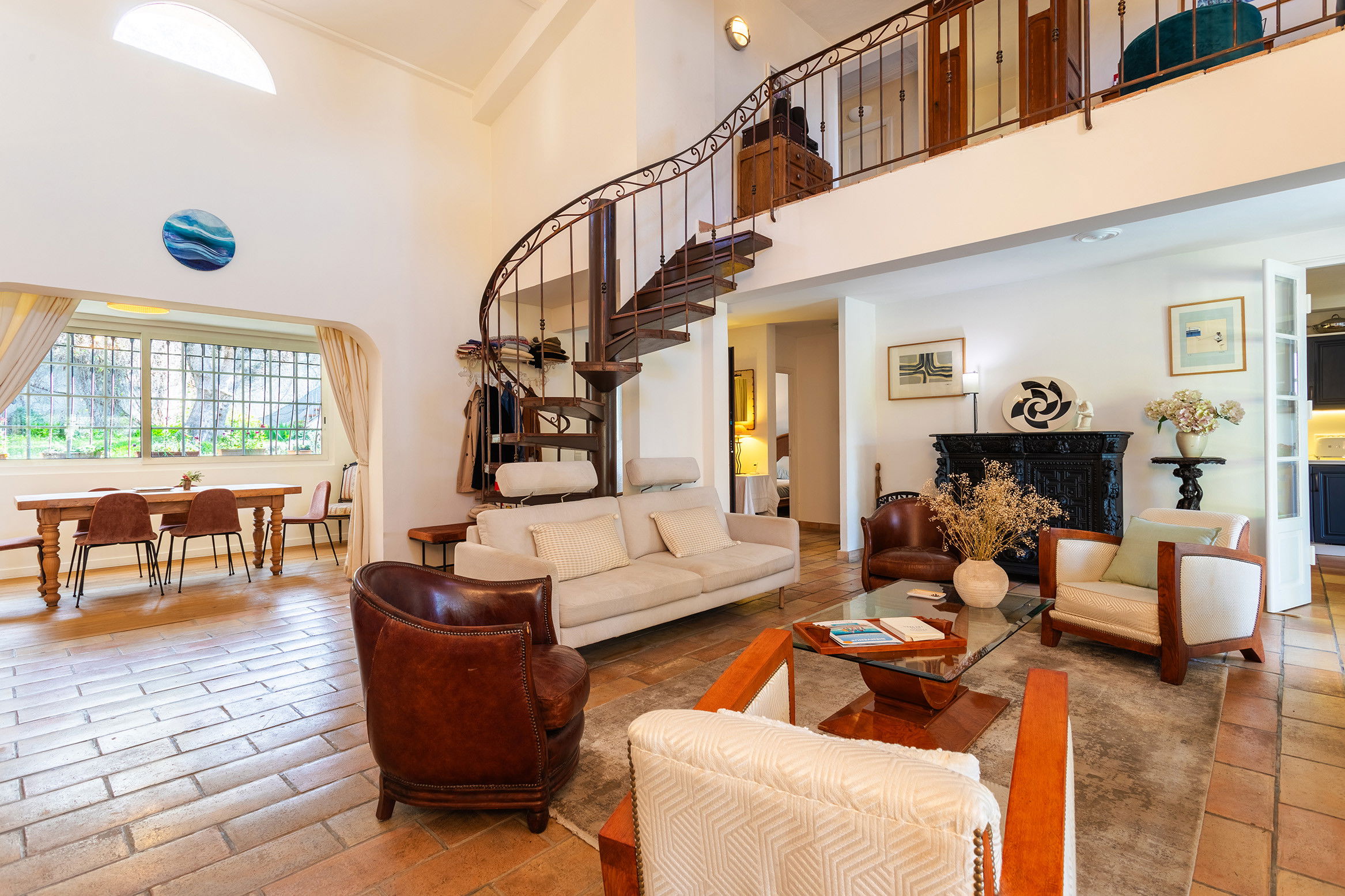 Three bedrooms with 2 double beds (160cm) and 1 double bed (140cm), A mezzanine accessible by a small spiral staircase gives access to the 1st floor and a sleeping area with a single sofa bed.