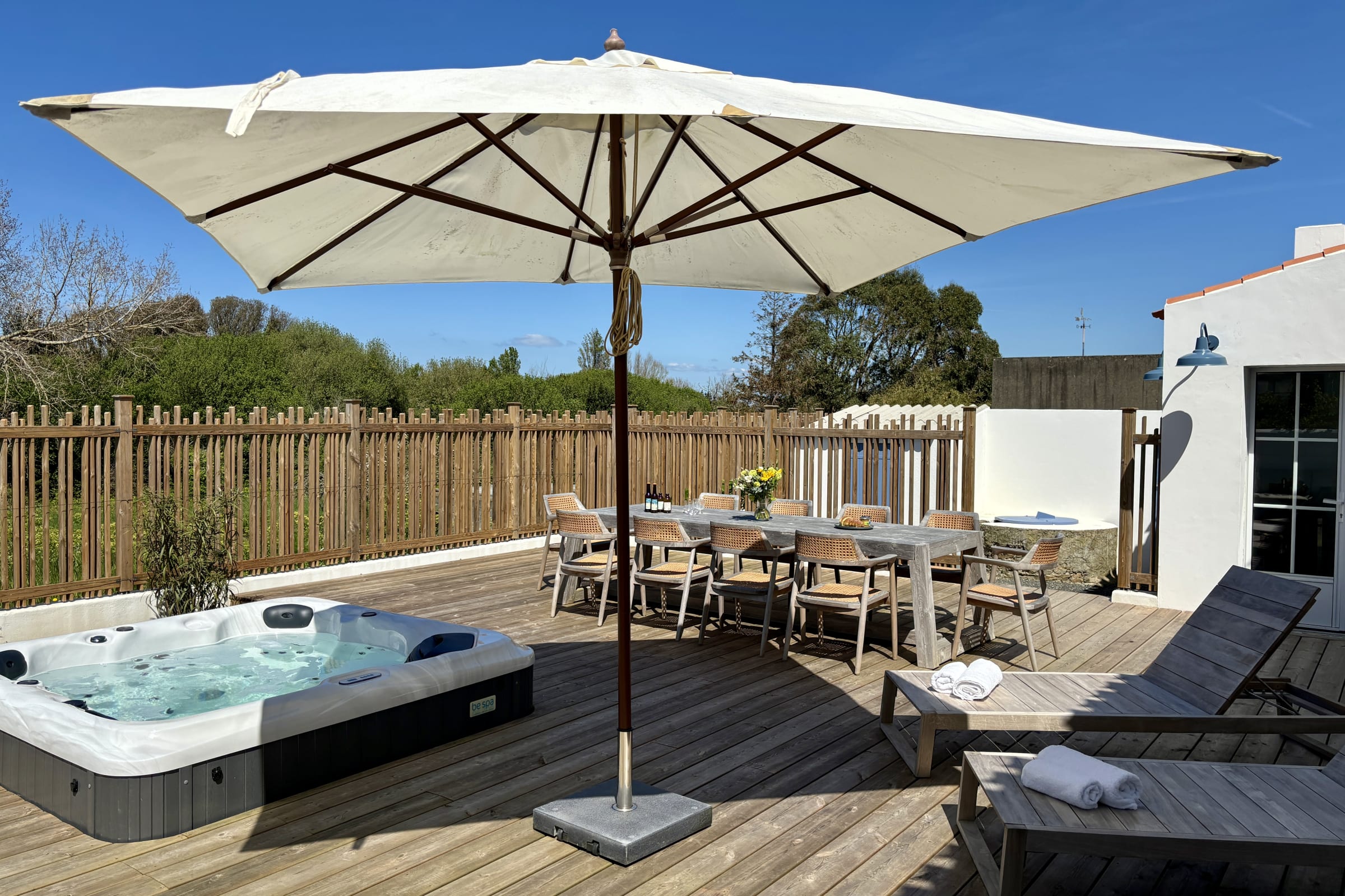 A pleasant outdoor space fitted out with a wooden terrace, a family table, deckchairs, a SPA and a barbecue.
