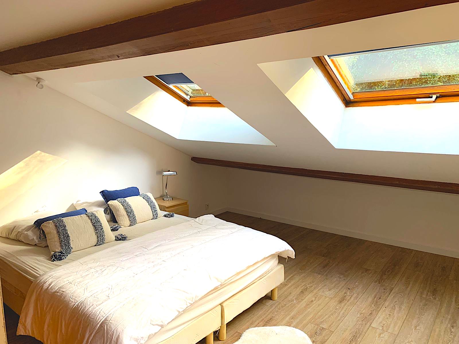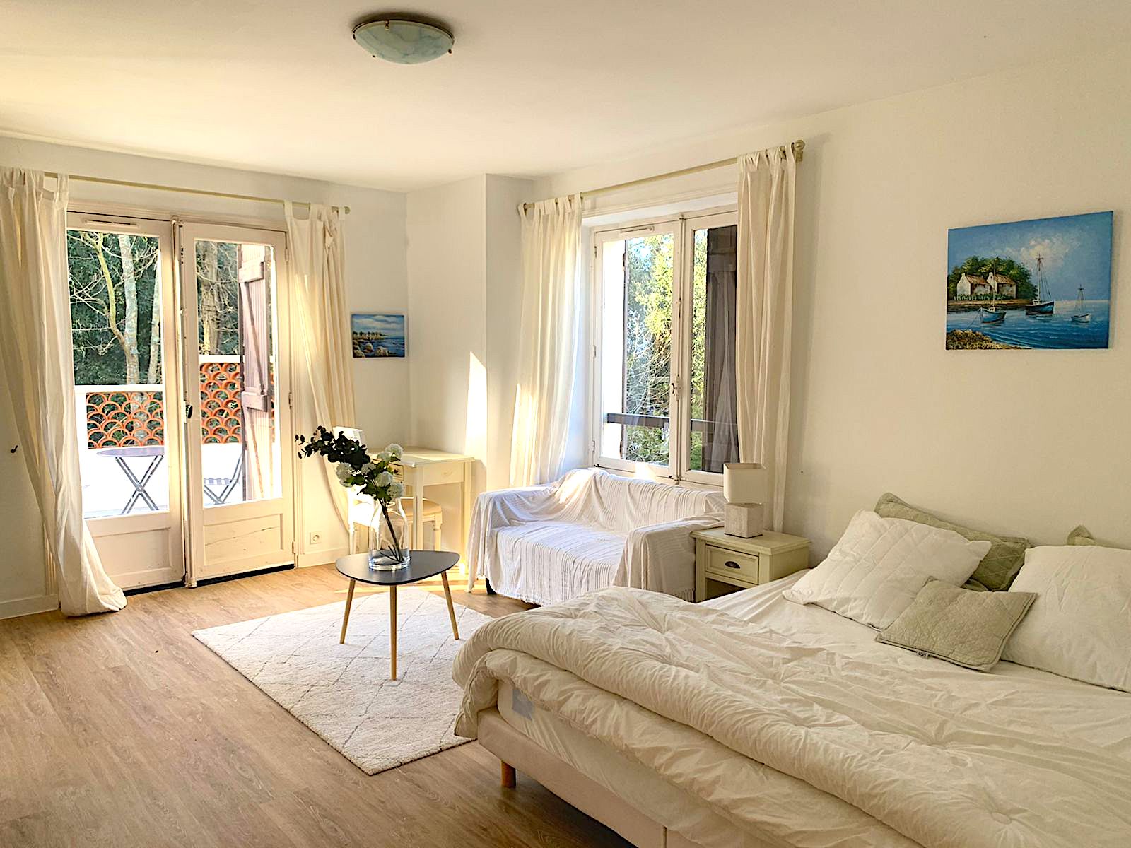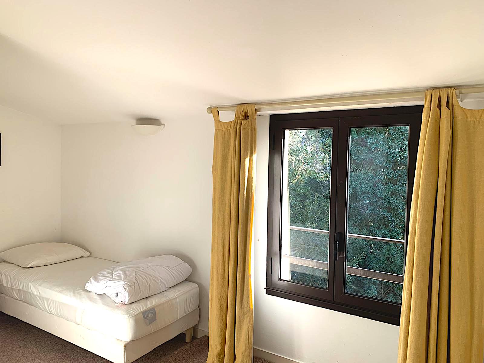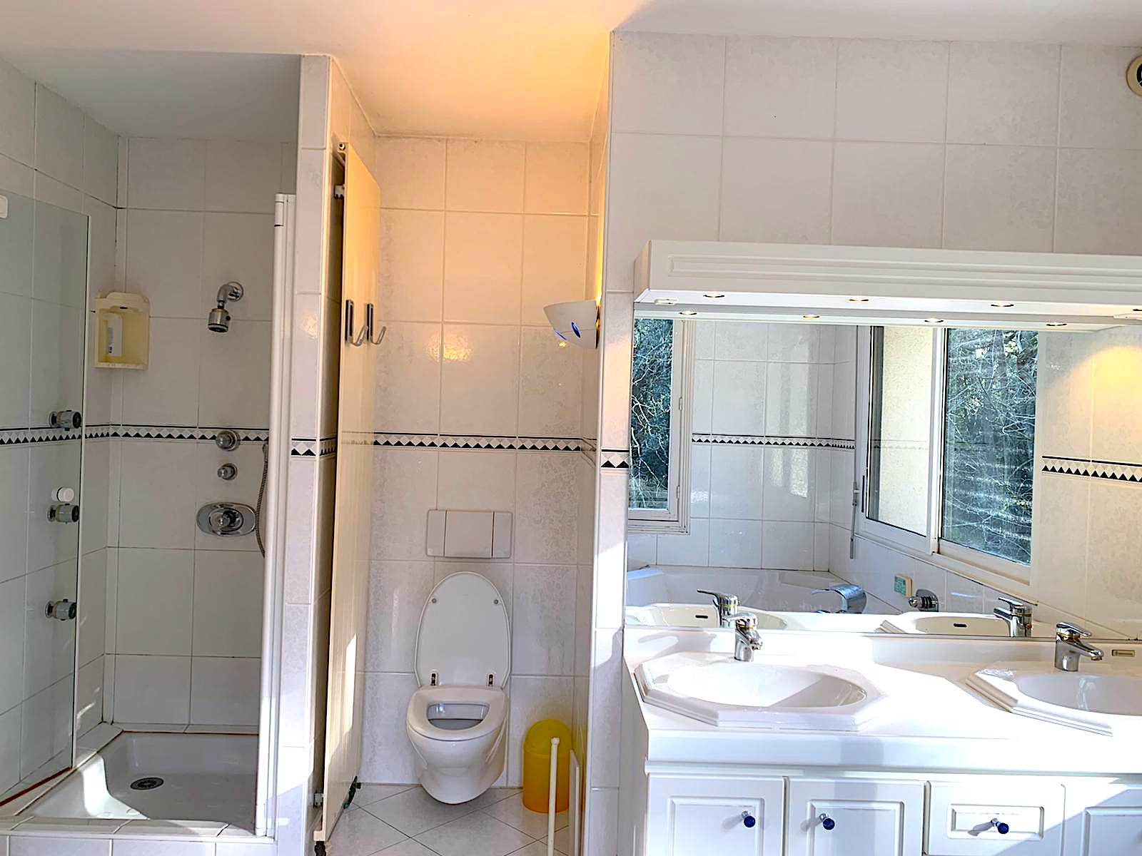 On the 1st floor: Bedroom 3 with 180/200 bed or 2 90/200 beds + cupboard/wardrobe - Shower room with WC - Bedroom 4 with 140/190 sofa bed + desk, communicating with the master suite (possibility of closing the door) - Master bedroom 5 with 180/200 bed + Adjoining bathroom (shower, bathtub, WC, heated towel rail, bidet) + cupboard/wardrobe + balcony with outdoor furniture (table + 2 chairs)