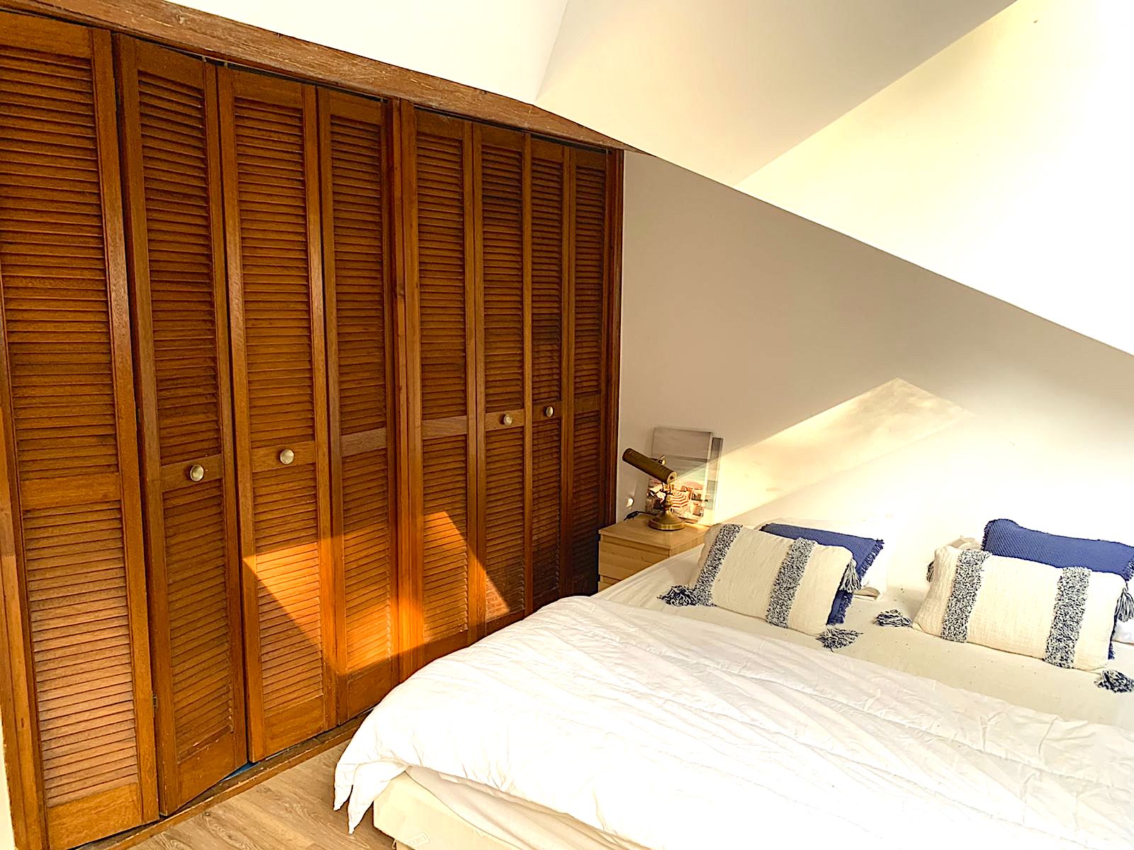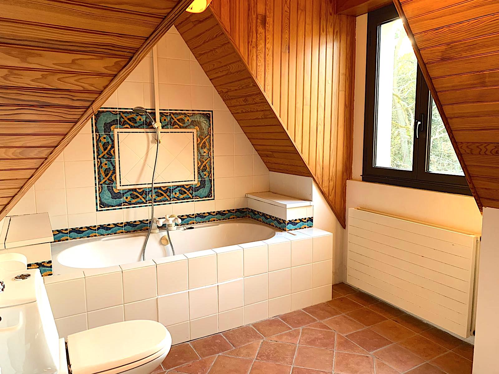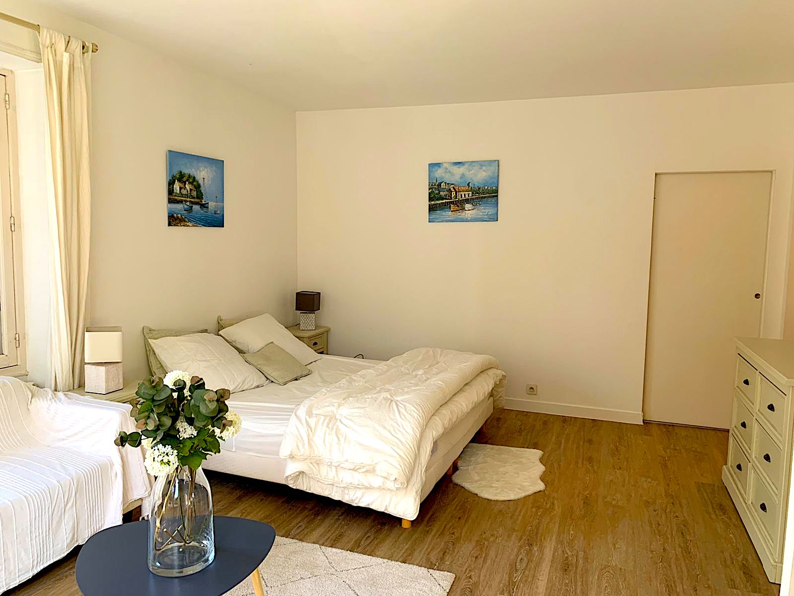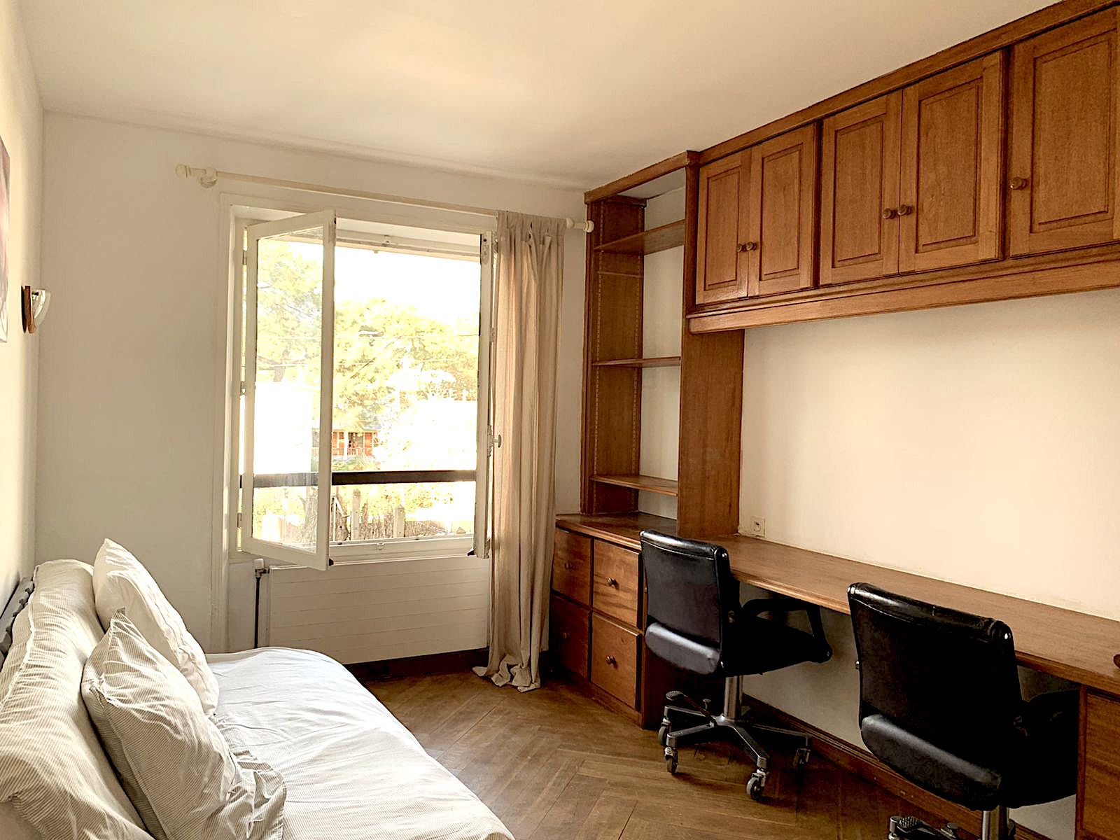 On the 1st floor: Bedroom 3 with 180/200 bed or 2 90/200 beds + cupboard/wardrobe - Shower room with WC - Bedroom 4 with 140/190 sofa bed + desk, communicating with the master suite (possibility of closing the door) - Master bedroom 5 with 180/200 bed + Adjoining bathroom (shower, bathtub, WC, heated towel rail, bidet) + cupboard/wardrobe + balcony with outdoor furniture (table + 2 chairs)