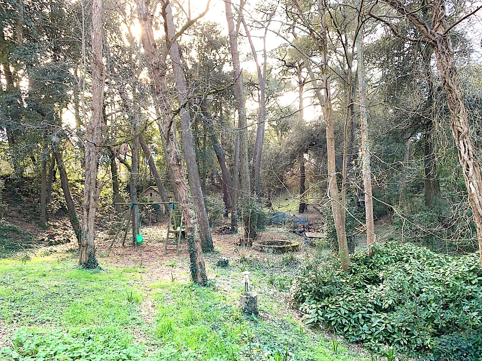 Garden with trees and games for children and ping-pong table.