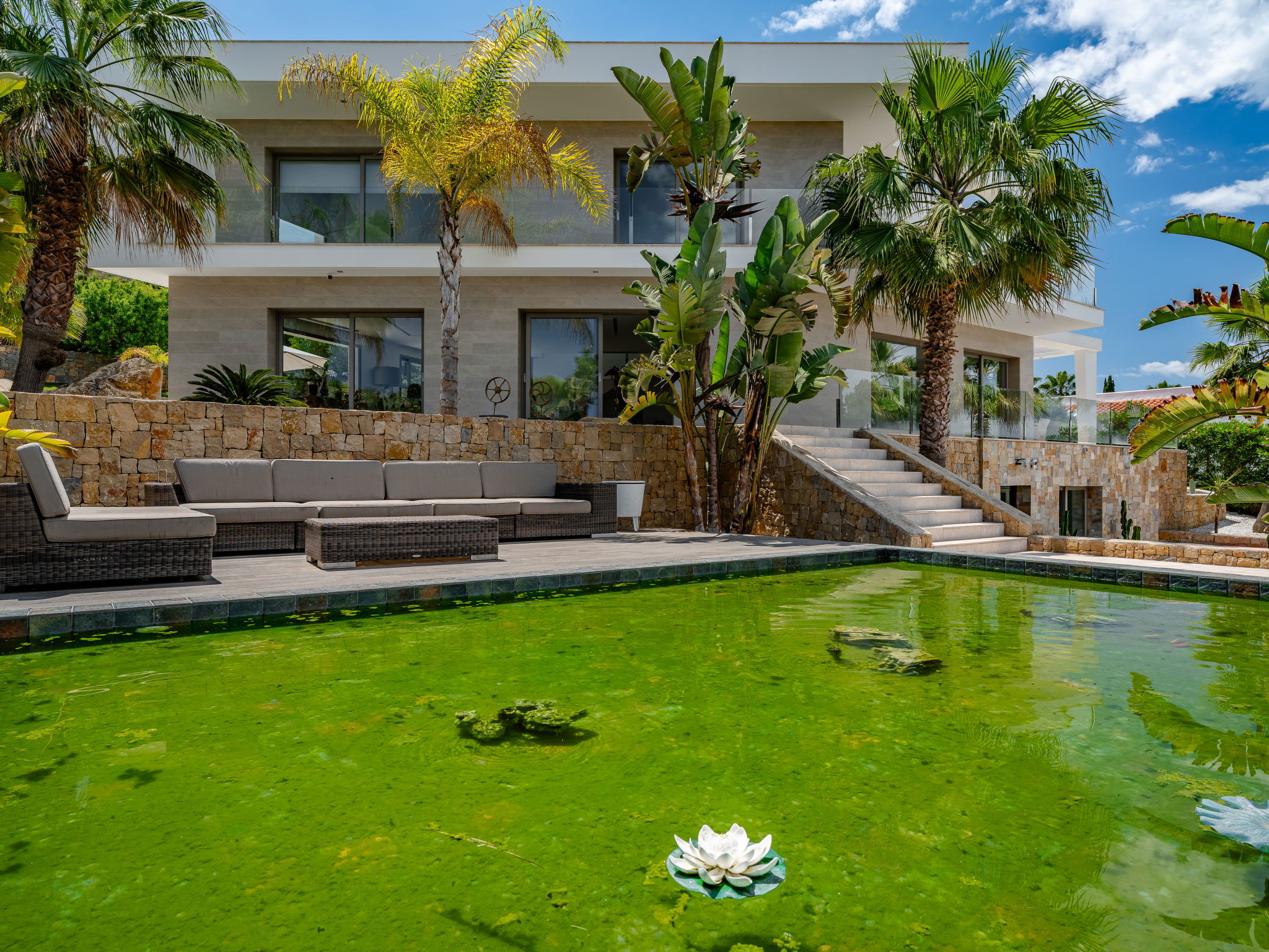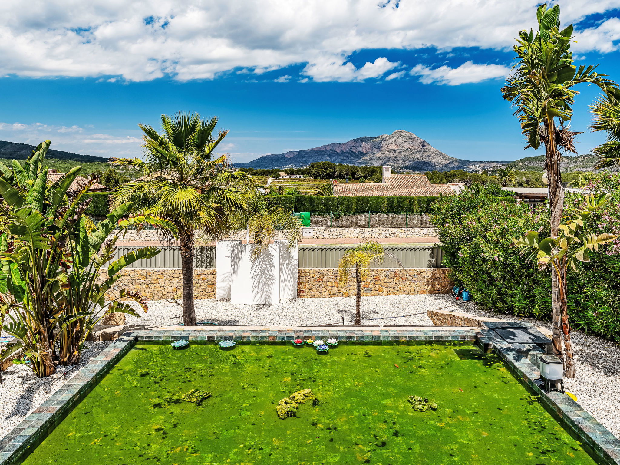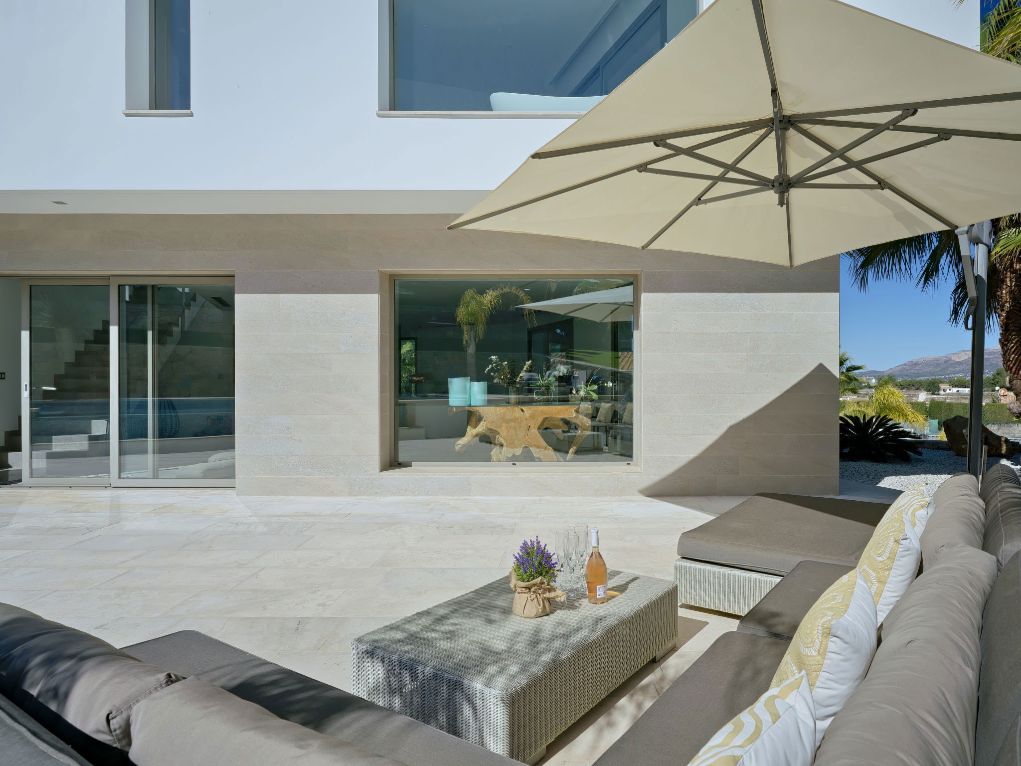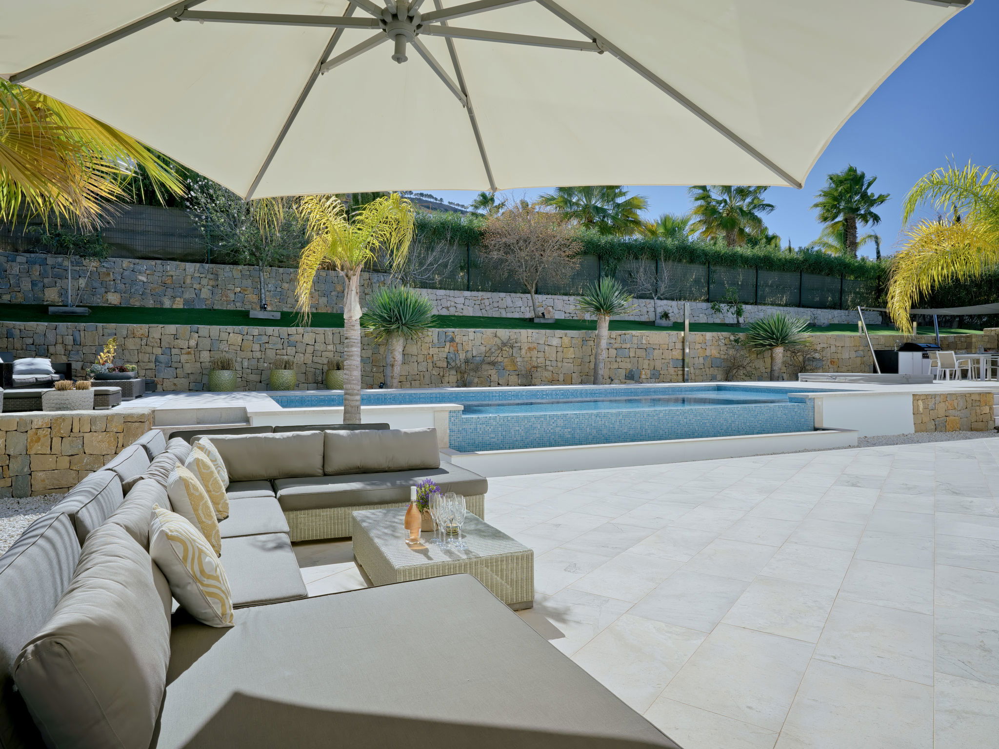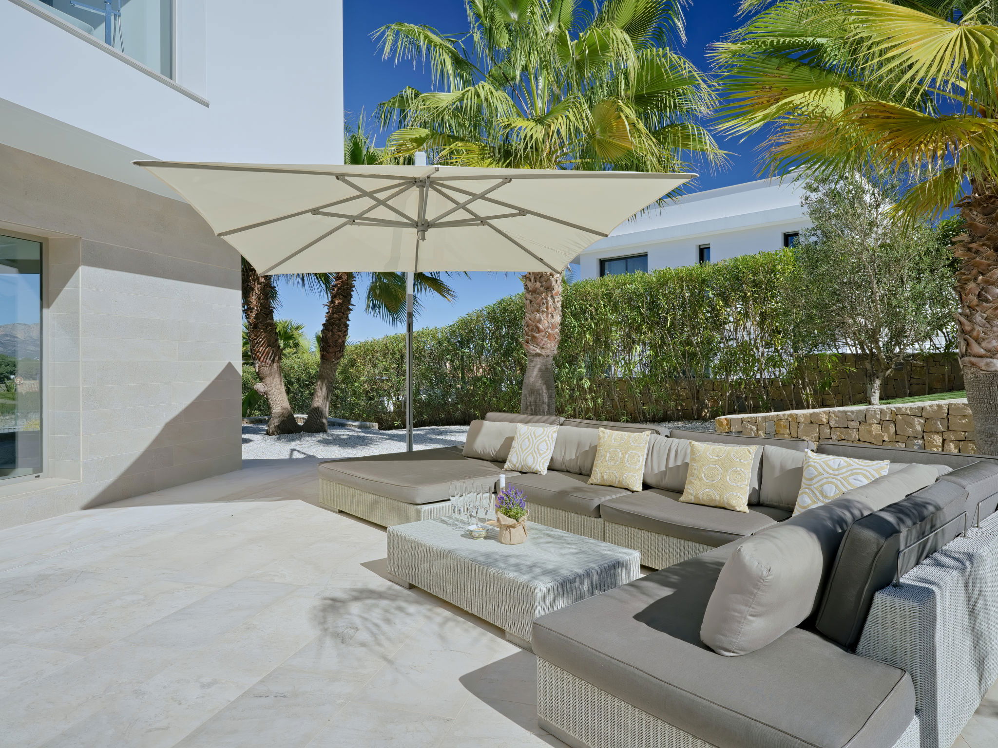 Very large, modern, luxurious villa "Eos", 3 storeys. In the district of Cansalades Park Monte Olimpo 5 km from the centre of Jávea - El Arenal, 8 km from the centre of Moraira, in a quiet, sunny position, 5 km from the sea, 5 km from the beach. Private: large, beautiful, well-kept terraced garden with lawn and wildlife garden, pond, swimming pool angular, with privacy (10 x 4 m, depth 40 - 180 cm, seasonal availability: 01.Jan. - 31.Dec.) with internal staircase. Outdoor shower, hot tub, patio, pergola, garden furniture, barbecue. In the house: central heating system, air conditioning, burglar alarm system. Roofed, parking (for 2 cars) on the premises. Supermarket 2.5 km, restaurant 1 km, bar 2.5 km, bakery 2.5 km, café 2.5 km, bus stop 5 km, sandy beach "El Arenal" 5 km, shingle beach "La Granadella" 10 km. Sports harbour 6 km, marina 6 km, golf course (9 hole) 3 km, surf school 5 km, sailing school 5 km. Please note: car recommended. The owner does not accept any youth groups. The villa has a second indoor heated swimming pool. Measurements 4x2 with exit to terrace.