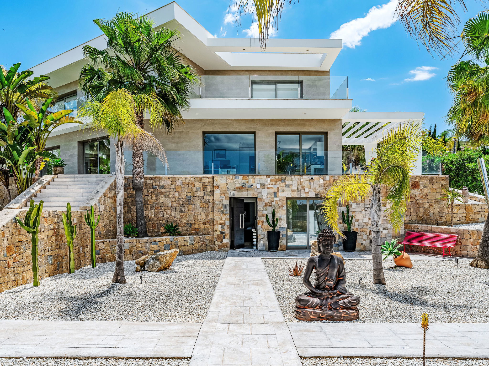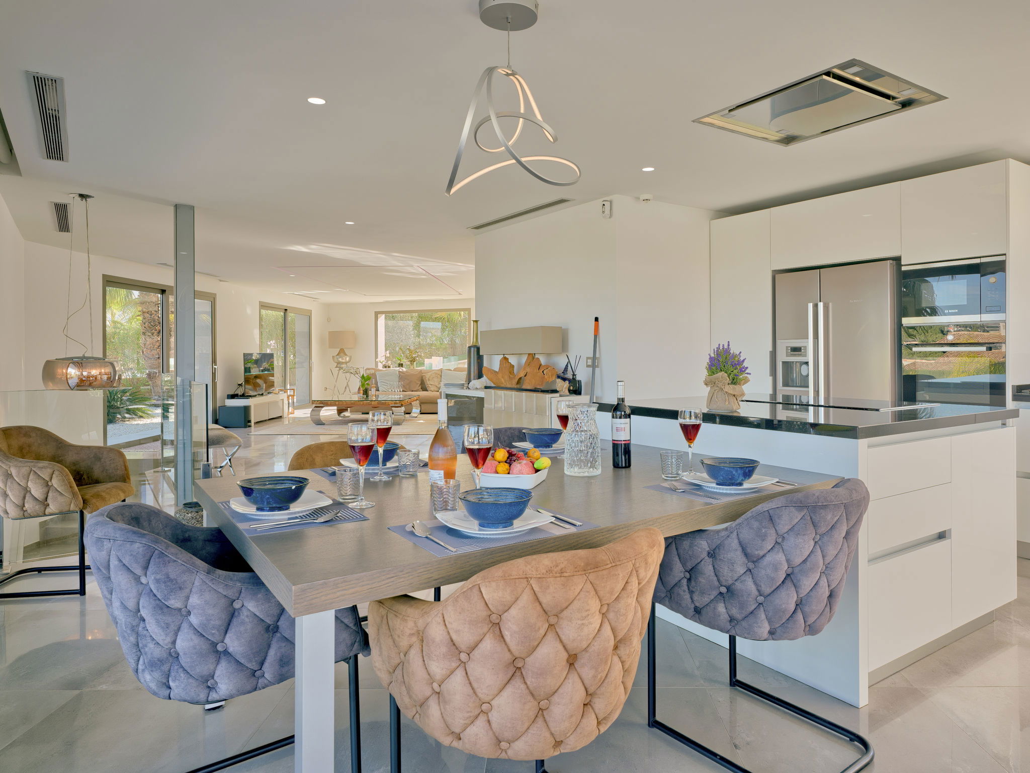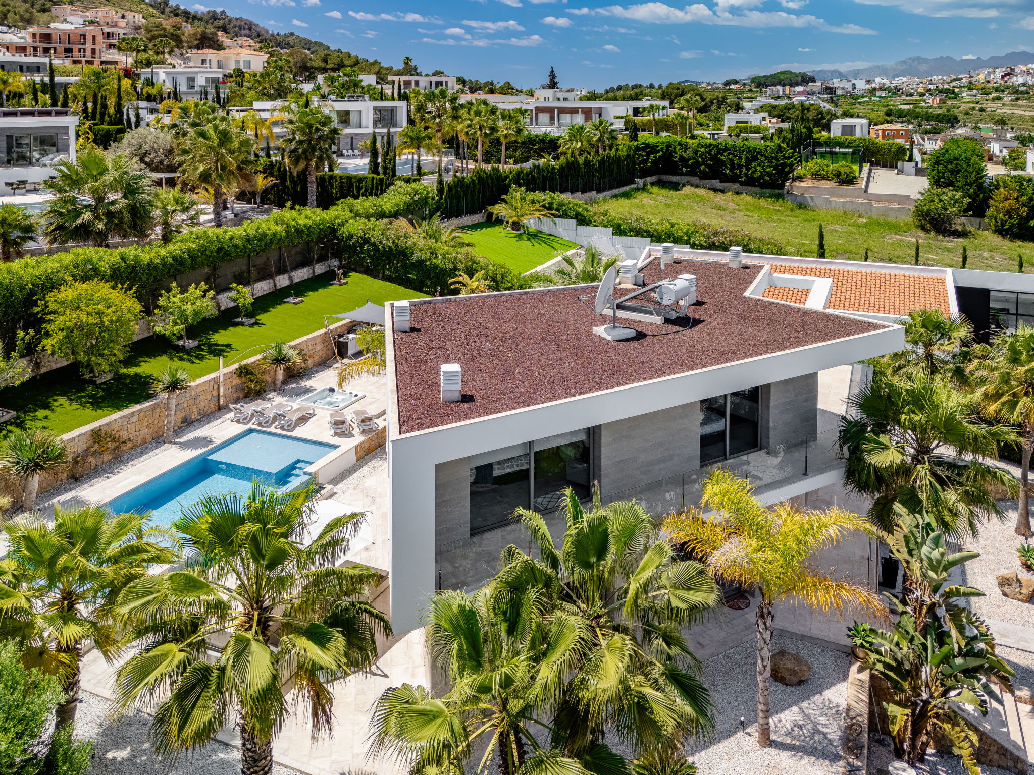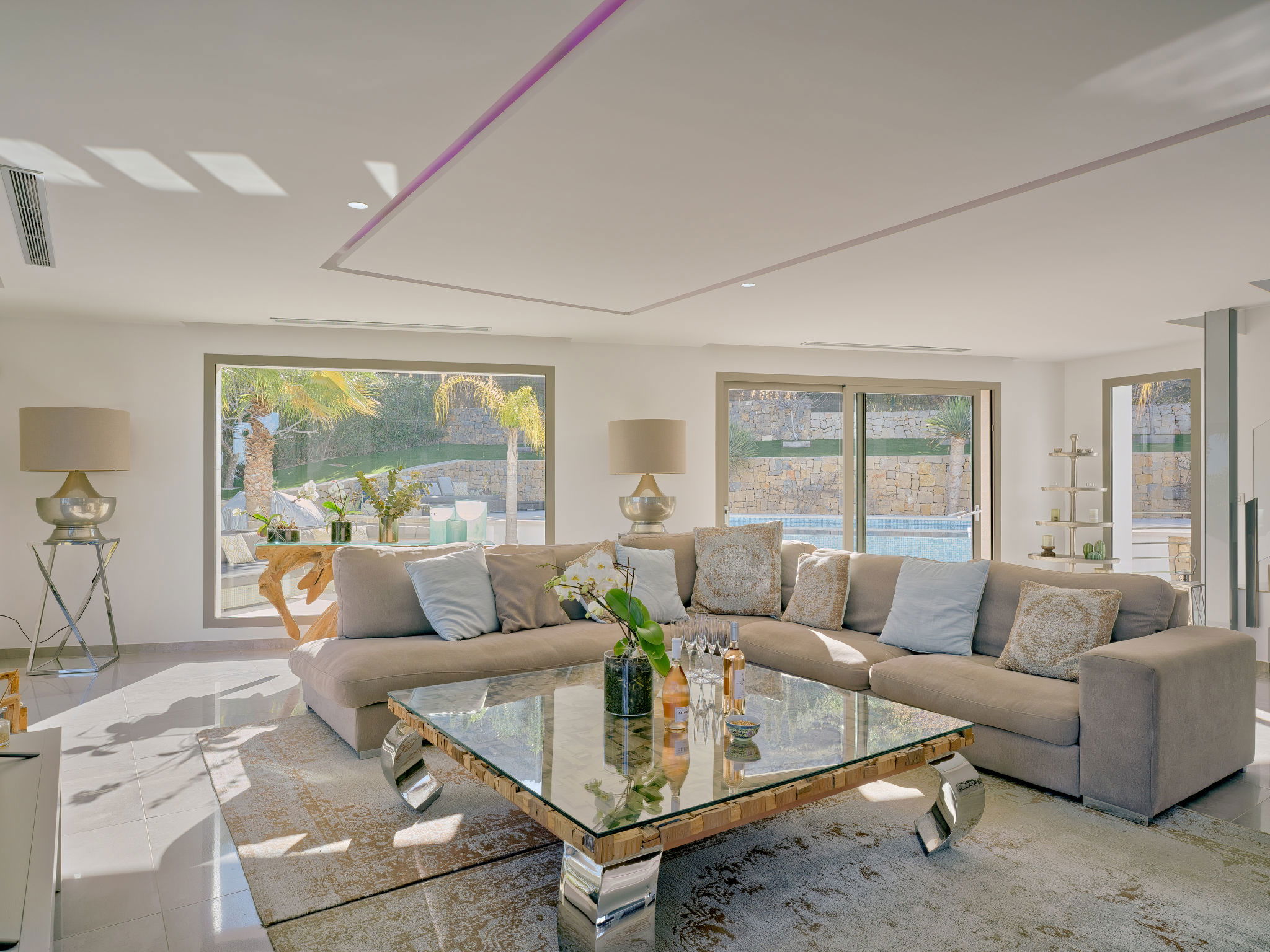 Very large, modern, luxurious villa "Eos", 3 storeys. In the district of Cansalades Park Monte Olimpo 5 km from the centre of Jávea - El Arenal, 8 km from the centre of Moraira, in a quiet, sunny position, 5 km from the sea, 5 km from the beach. Private: large, beautiful, well-kept terraced garden with lawn and wildlife garden, pond, swimming pool angular, with privacy (10 x 4 m, depth 40 - 180 cm, seasonal availability: 01.Jan. - 31.Dec.) with internal staircase. Outdoor shower, hot tub, patio, pergola, garden furniture, barbecue. In the house: central heating system, air conditioning, burglar alarm system. Roofed, parking (for 2 cars) on the premises. Supermarket 2.5 km, restaurant 1 km, bar 2.5 km, bakery 2.5 km, café 2.5 km, bus stop 5 km, sandy beach "El Arenal" 5 km, shingle beach "La Granadella" 10 km. Sports harbour 6 km, marina 6 km, golf course (9 hole) 3 km, surf school 5 km, sailing school 5 km. Please note: car recommended. The owner does not accept any youth groups. The villa has a second indoor heated swimming pool. Measurements 4x2 with exit to terrace.