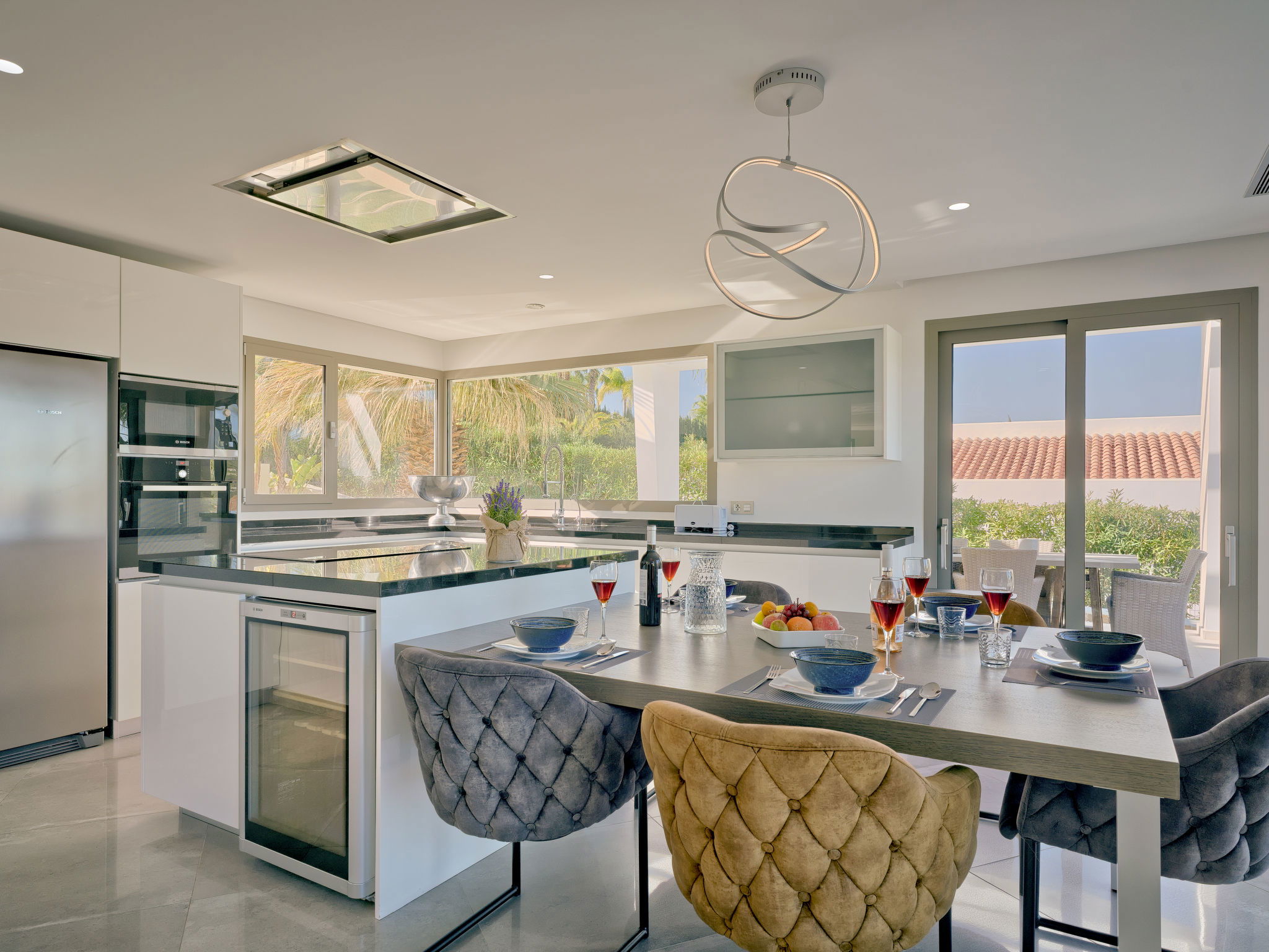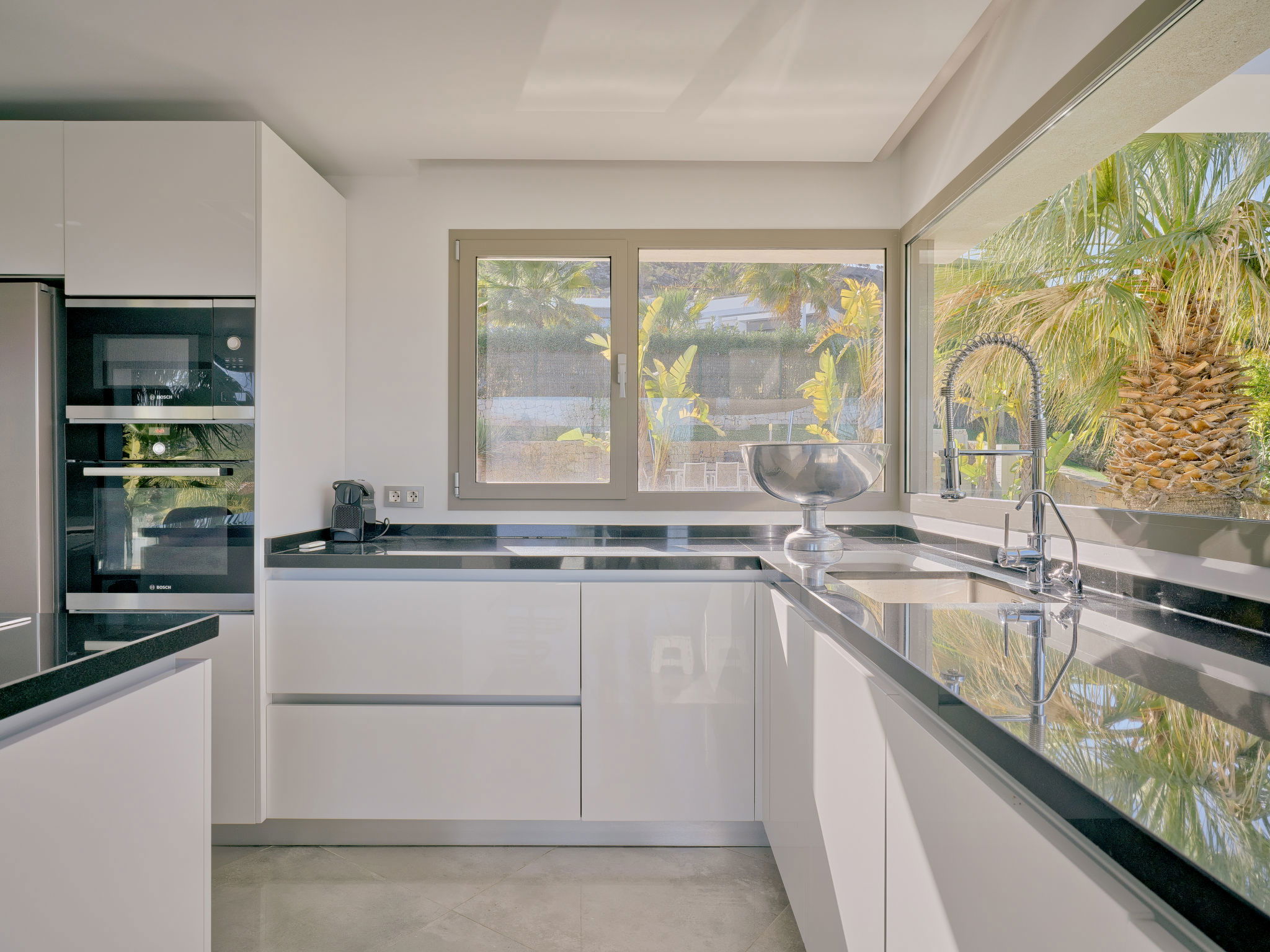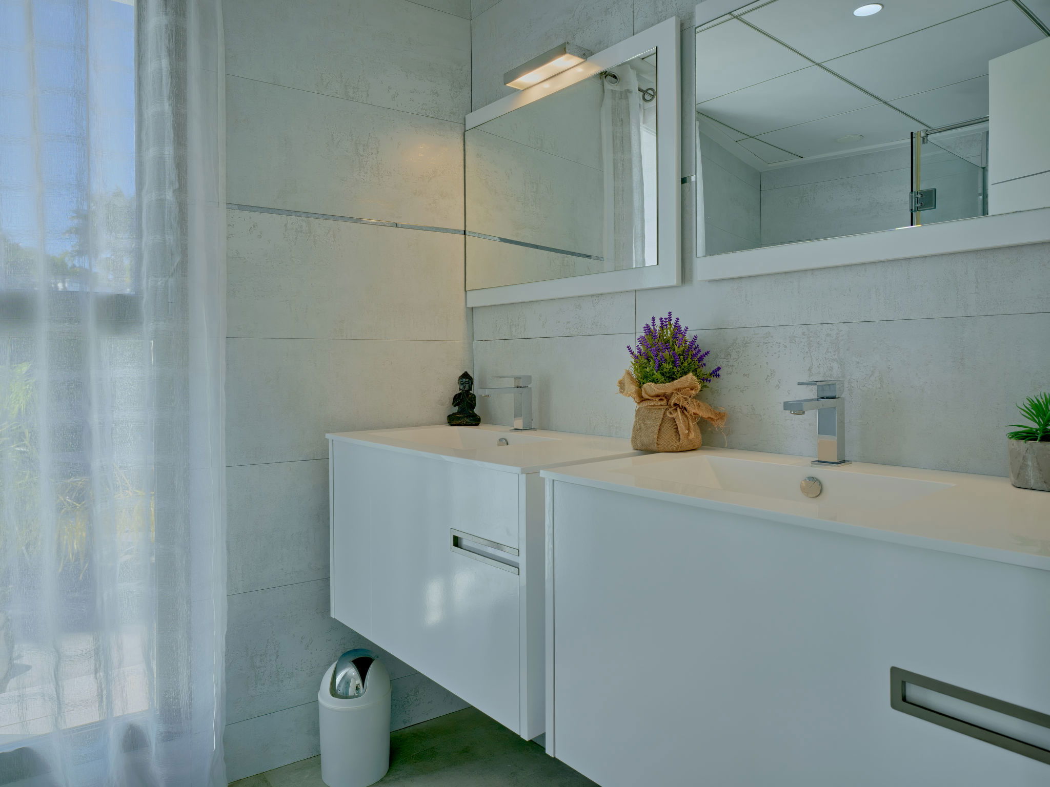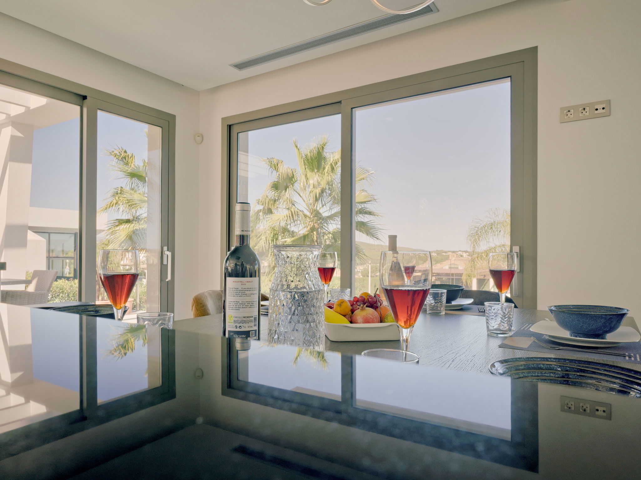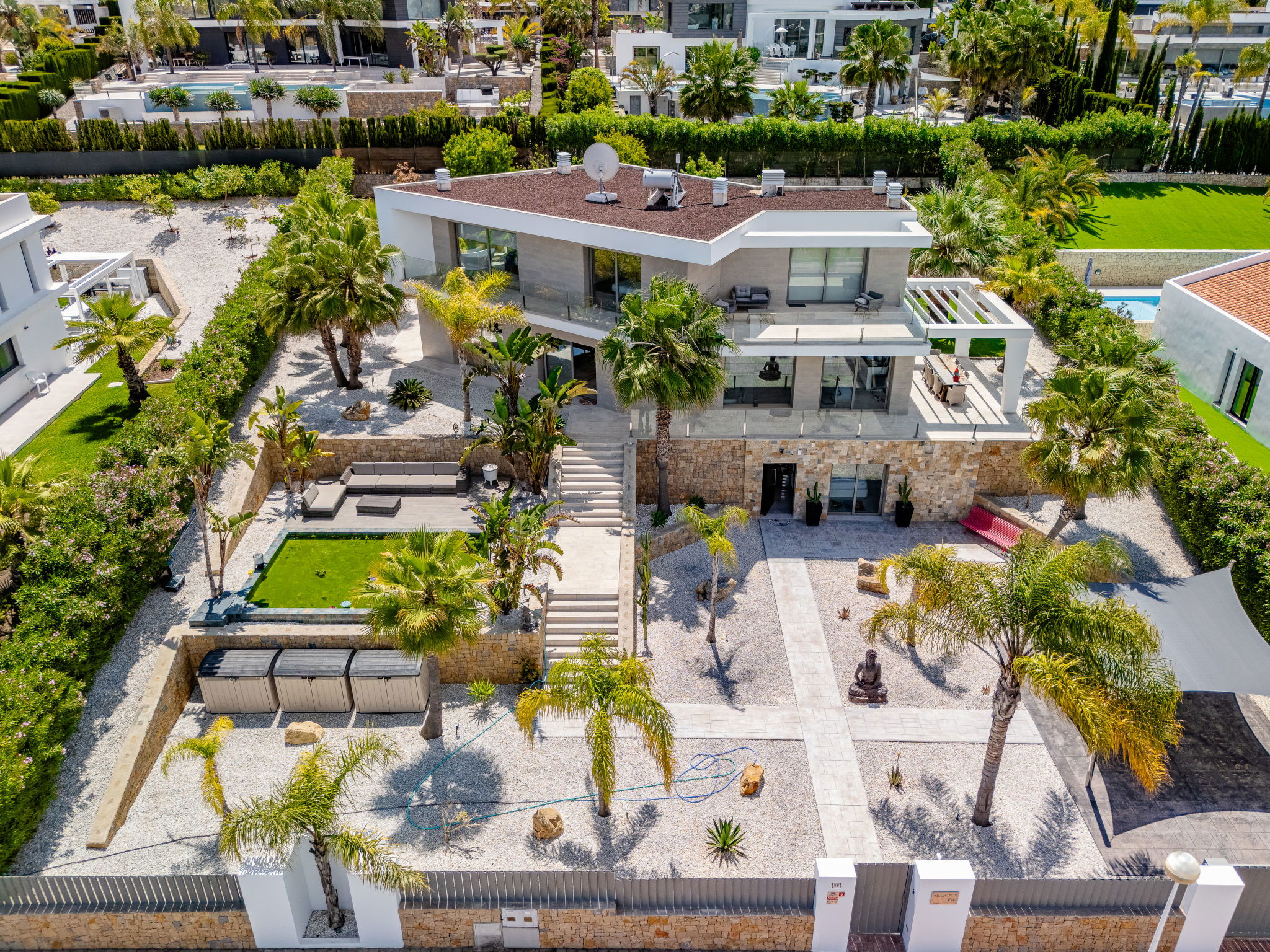 Very large, modern, luxurious villa "Eos", 3 storeys. In the district of Cansalades Park Monte Olimpo 5 km from the centre of Jávea - El Arenal, 8 km from the centre of Moraira, in a quiet, sunny position, 5 km from the sea, 5 km from the beach. Private: large, beautiful, well-kept terraced garden with lawn and wildlife garden, pond, swimming pool angular, with privacy (10 x 4 m, depth 40 - 180 cm, seasonal availability: 01.Jan. - 31.Dec.) with internal staircase. Outdoor shower, hot tub, patio, pergola, garden furniture, barbecue. In the house: central heating system, air conditioning, burglar alarm system. Roofed, parking (for 2 cars) on the premises. Supermarket 2.5 km, restaurant 1 km, bar 2.5 km, bakery 2.5 km, café 2.5 km, bus stop 5 km, sandy beach "El Arenal" 5 km, shingle beach "La Granadella" 10 km. Sports harbour 6 km, marina 6 km, golf course (9 hole) 3 km, surf school 5 km, sailing school 5 km. Please note: car recommended. The owner does not accept any youth groups. The villa has a second indoor heated swimming pool. Measurements 4x2 with exit to terrace.