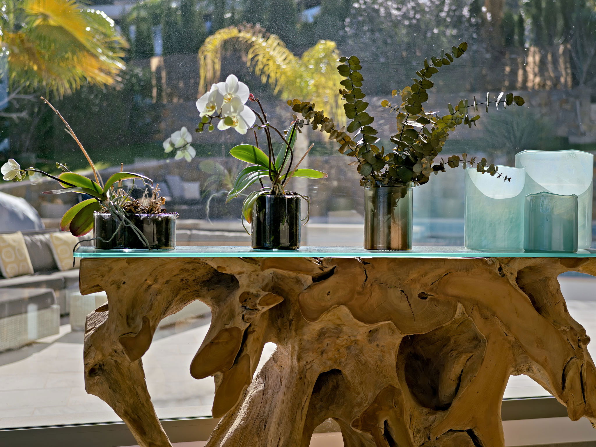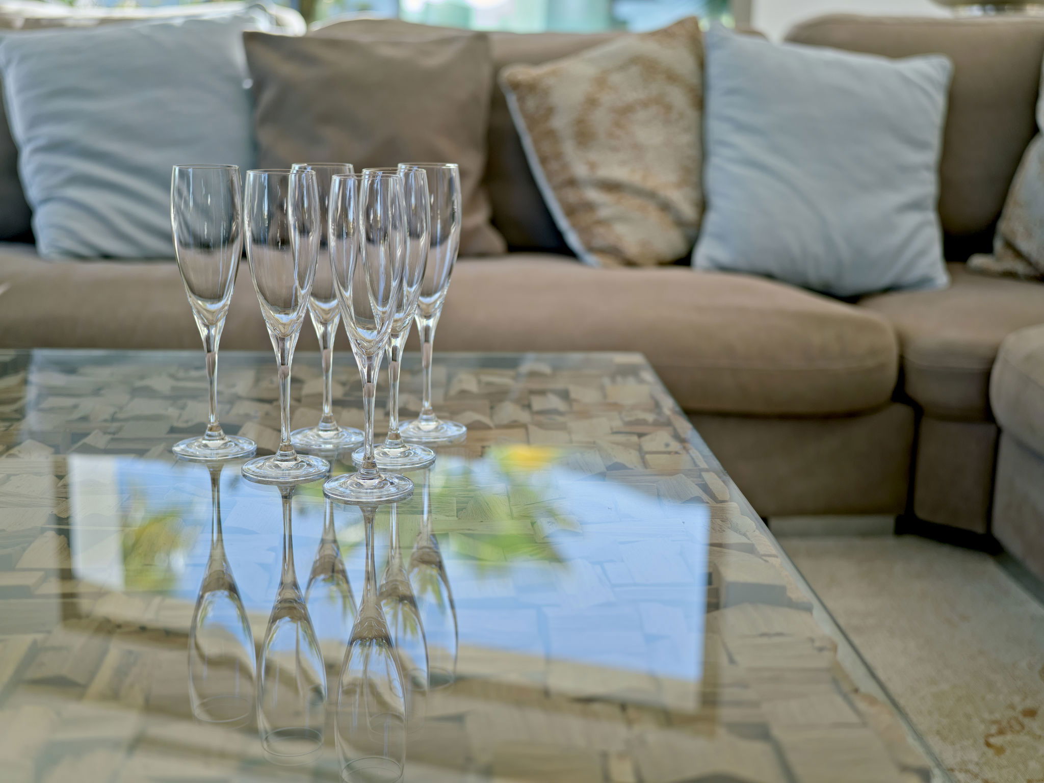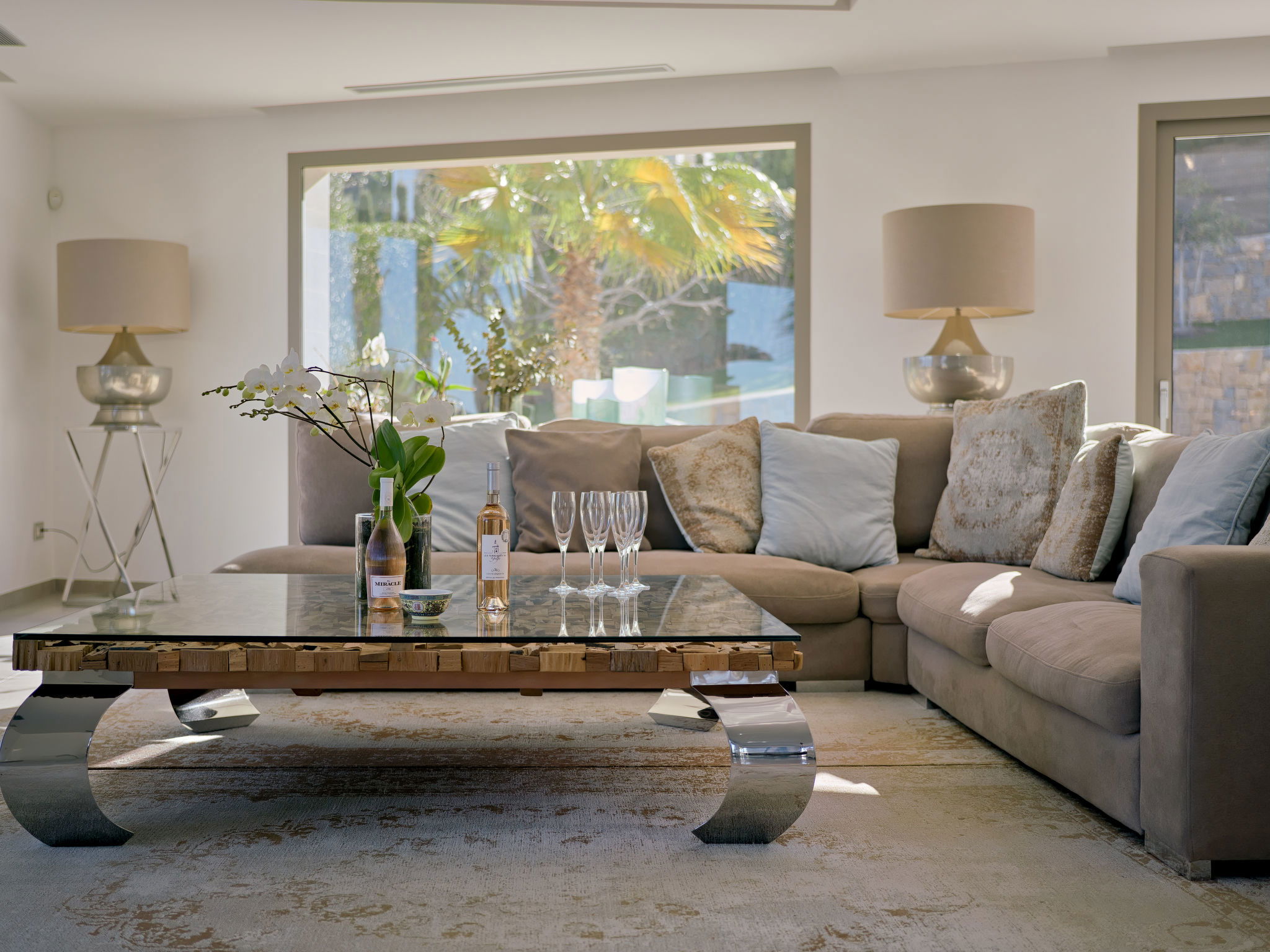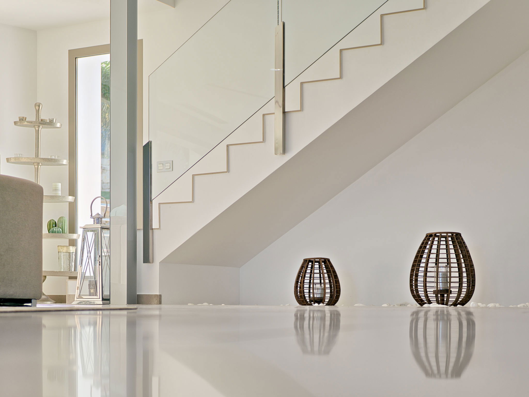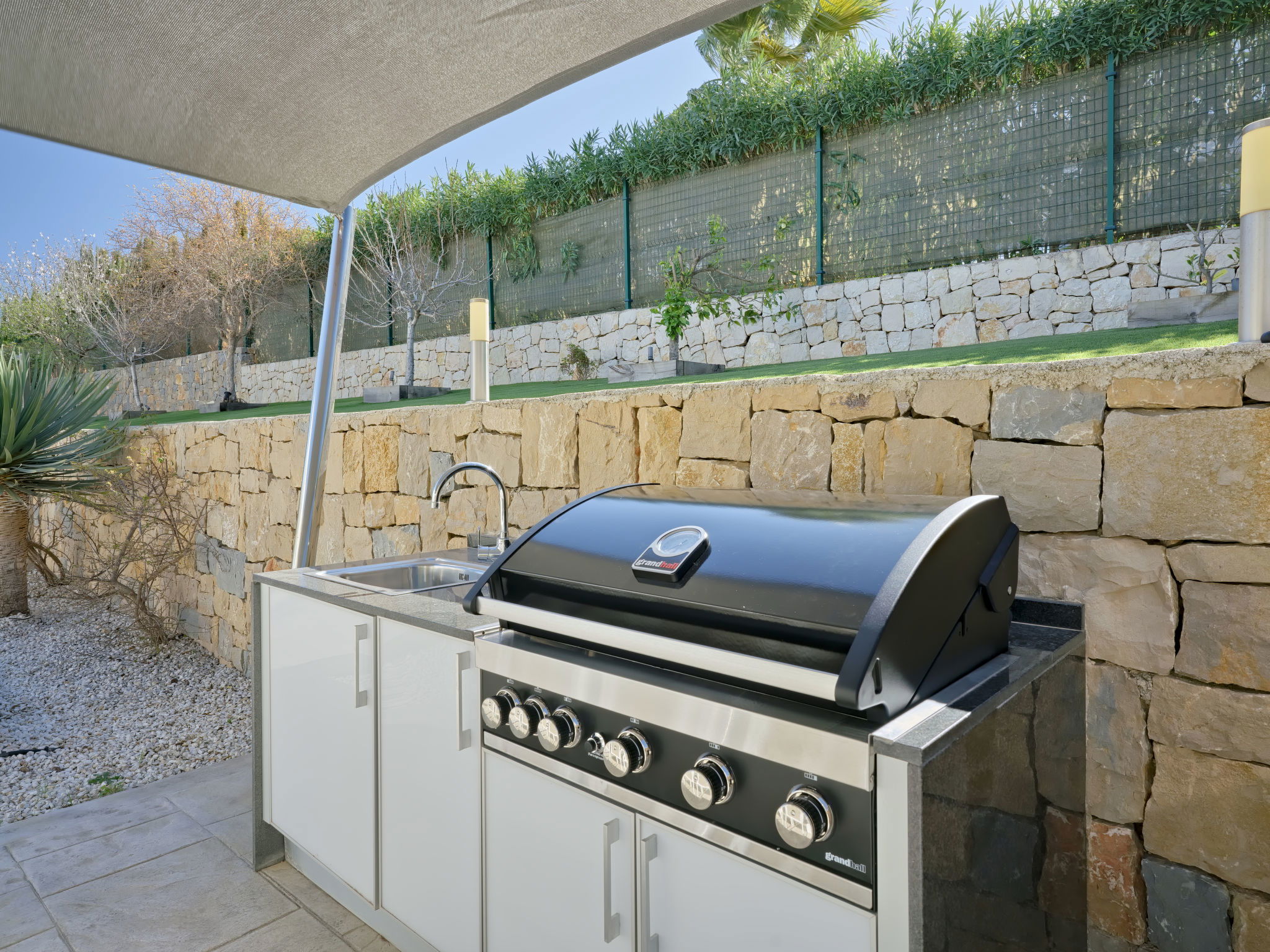 Very large, modern, luxurious villa "Eos", 3 storeys. In the district of Cansalades Park Monte Olimpo 5 km from the centre of Jávea - El Arenal, 8 km from the centre of Moraira, in a quiet, sunny position, 5 km from the sea, 5 km from the beach. Private: large, beautiful, well-kept terraced garden with lawn and wildlife garden, pond, swimming pool angular, with privacy (10 x 4 m, depth 40 - 180 cm, seasonal availability: 01.Jan. - 31.Dec.) with internal staircase. Outdoor shower, hot tub, patio, pergola, garden furniture, barbecue. In the house: central heating system, air conditioning, burglar alarm system. Roofed, parking (for 2 cars) on the premises. Supermarket 2.5 km, restaurant 1 km, bar 2.5 km, bakery 2.5 km, café 2.5 km, bus stop 5 km, sandy beach "El Arenal" 5 km, shingle beach "La Granadella" 10 km. Sports harbour 6 km, marina 6 km, golf course (9 hole) 3 km, surf school 5 km, sailing school 5 km. Please note: car recommended. The owner does not accept any youth groups. The villa has a second indoor heated swimming pool. Measurements 4x2 with exit to terrace.