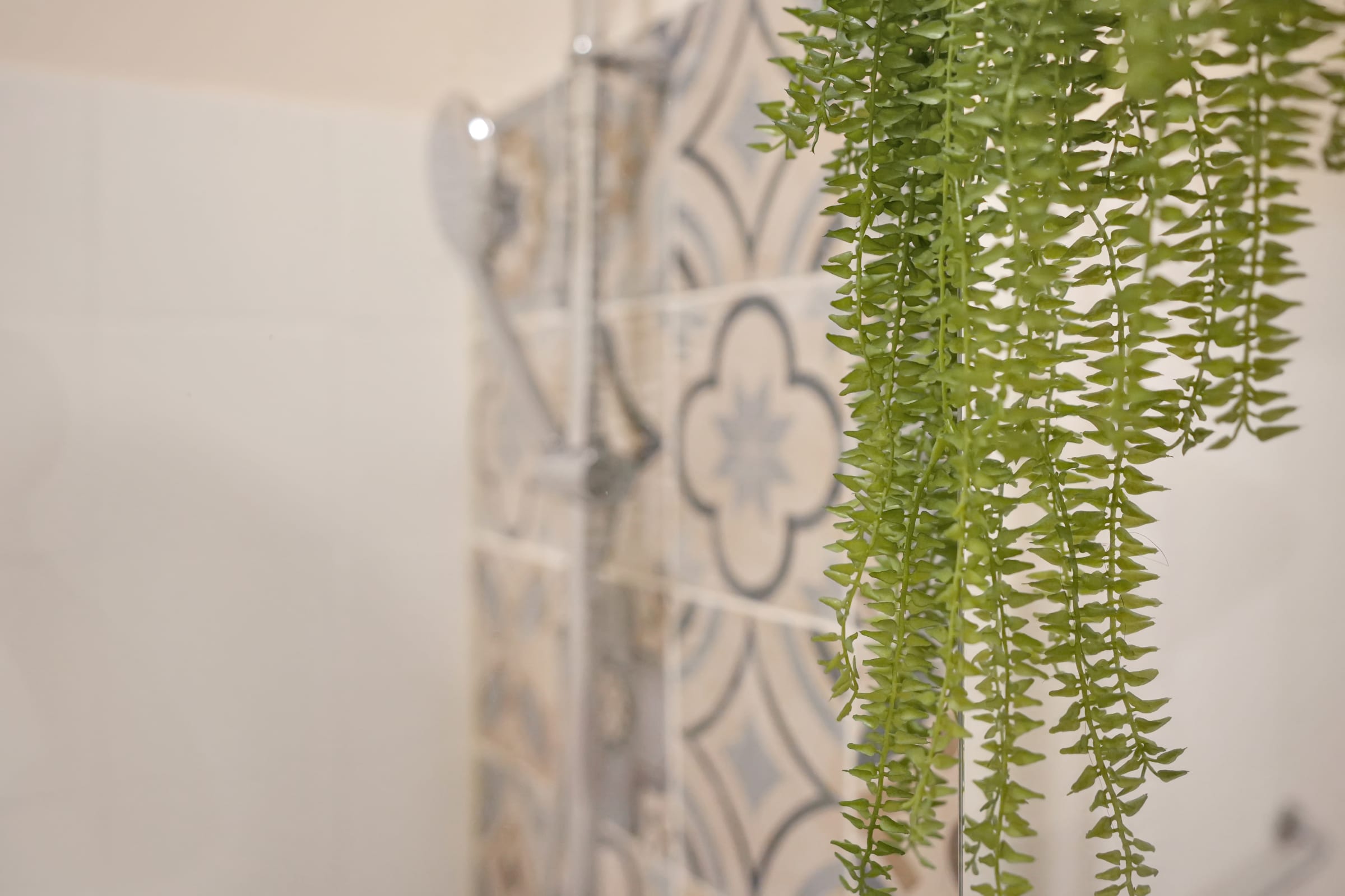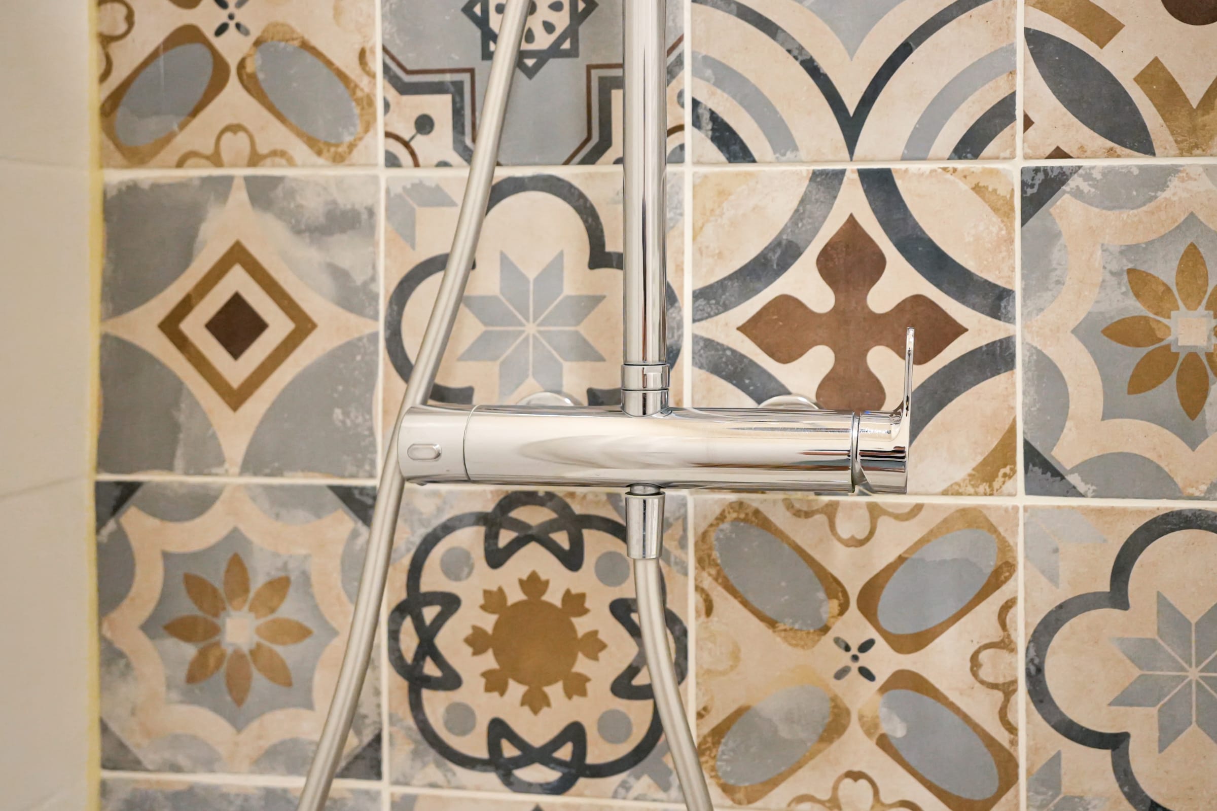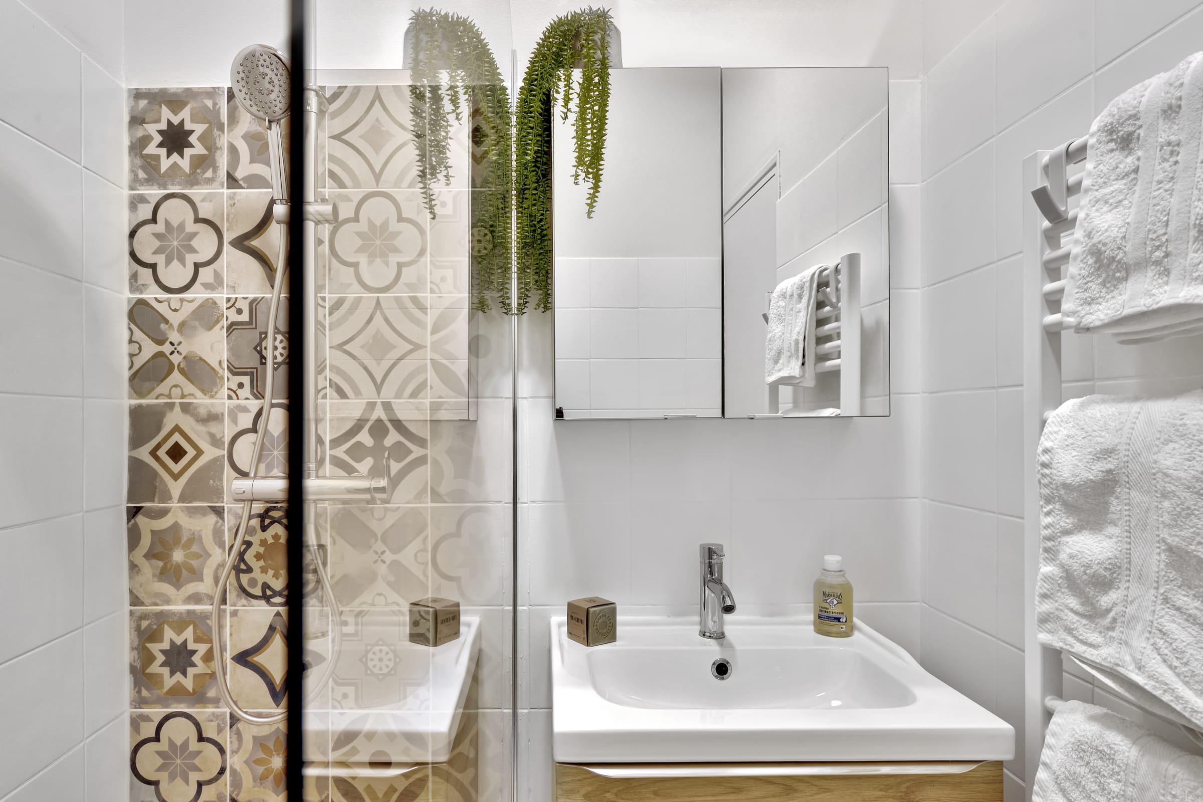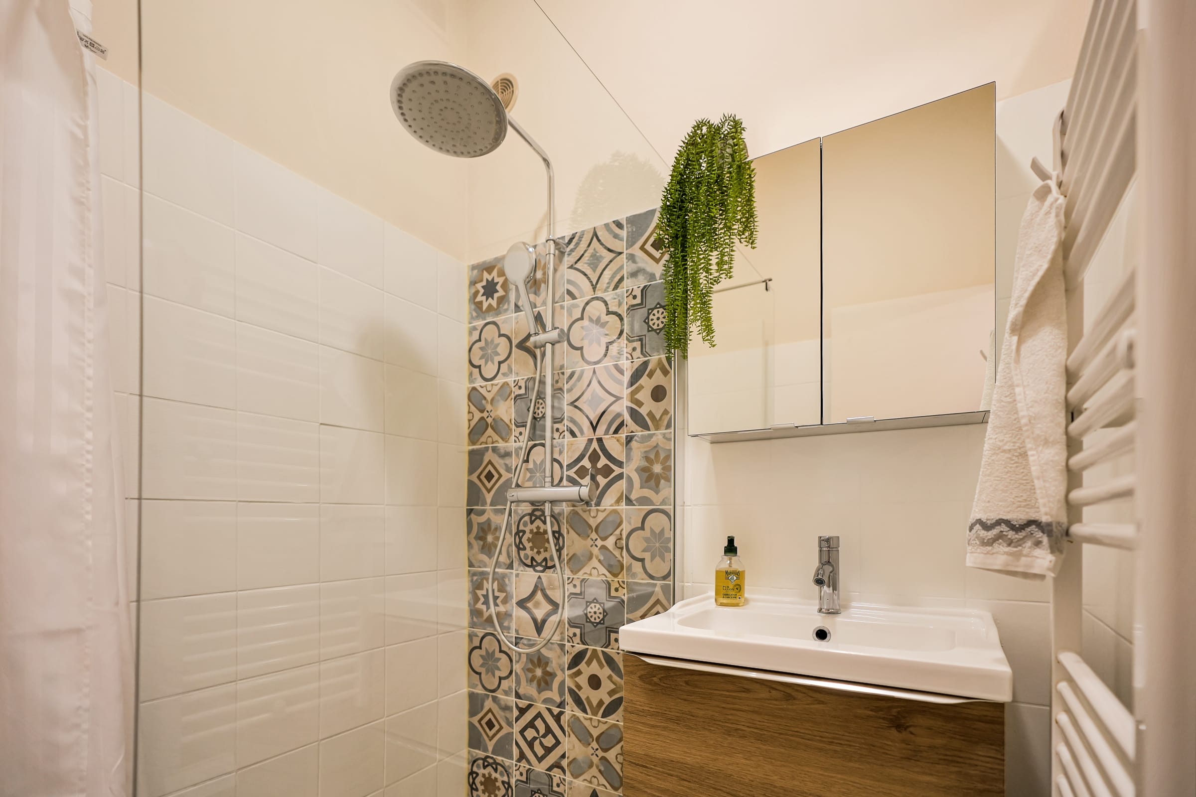 A custom bathroom with its Italian shower with distinguished cement tiles, its wooden furniture, and a towel dryer to feel wrapped in a small warm cloud when you leave.