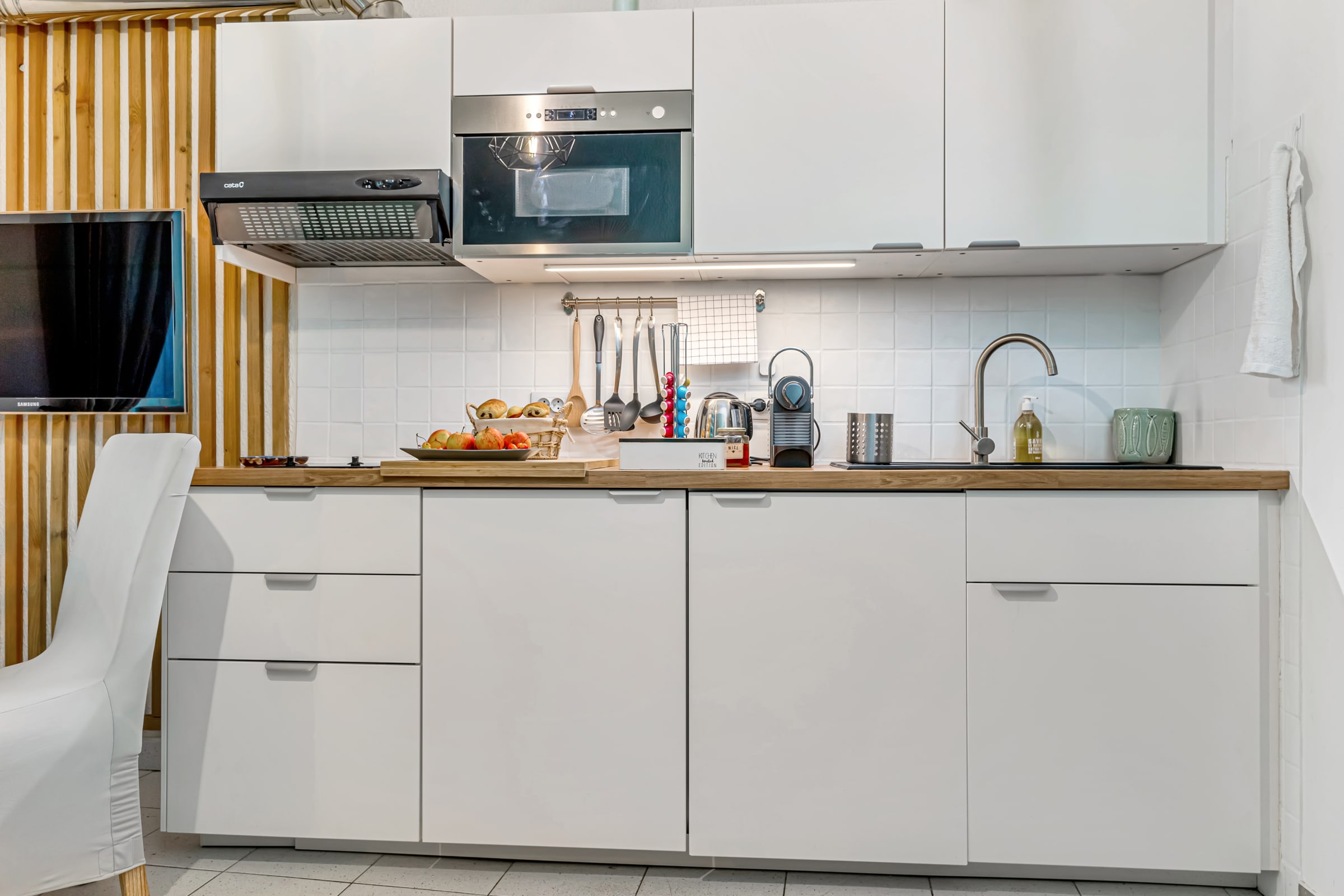 The kitchen is fully equipped and highly functional, it has a microwave, a refrigerator, and a washing machine. A Nespresso machine as well as a kettle and a toaster are at your disposal with coffee capsules and a sn of teas for your breaks.