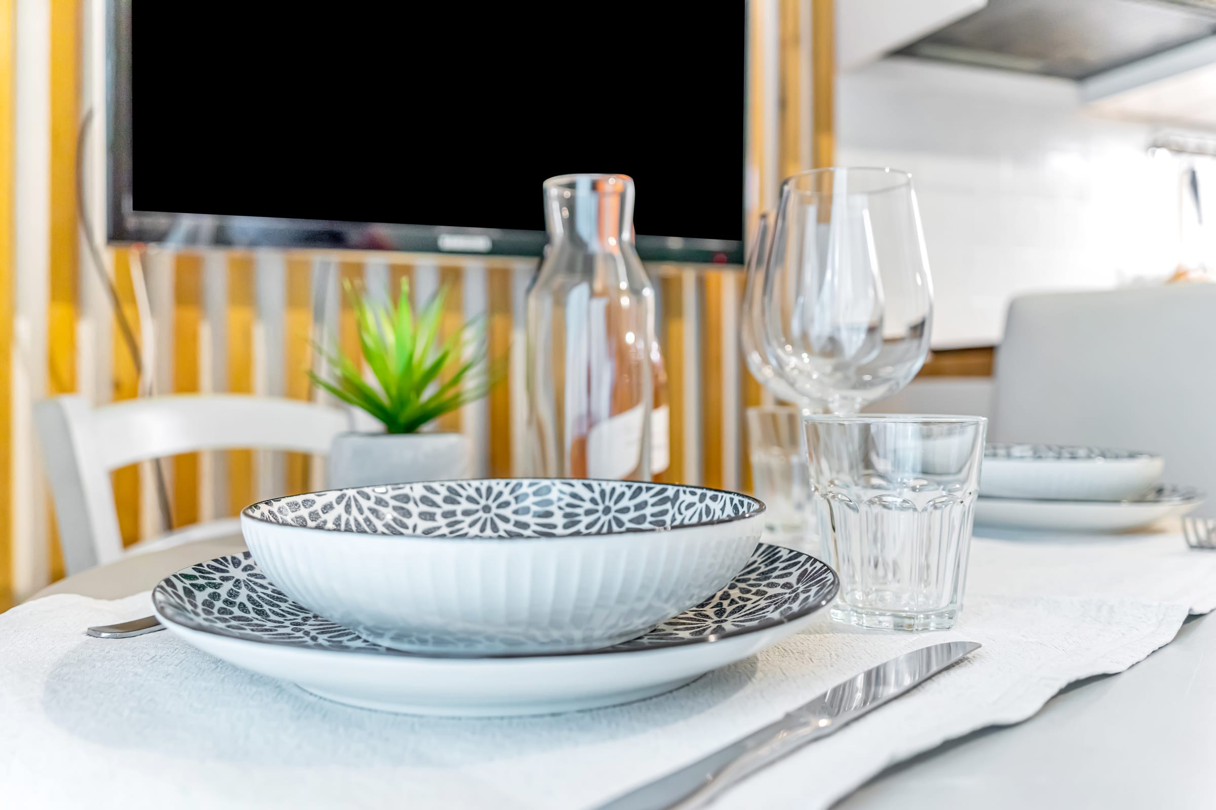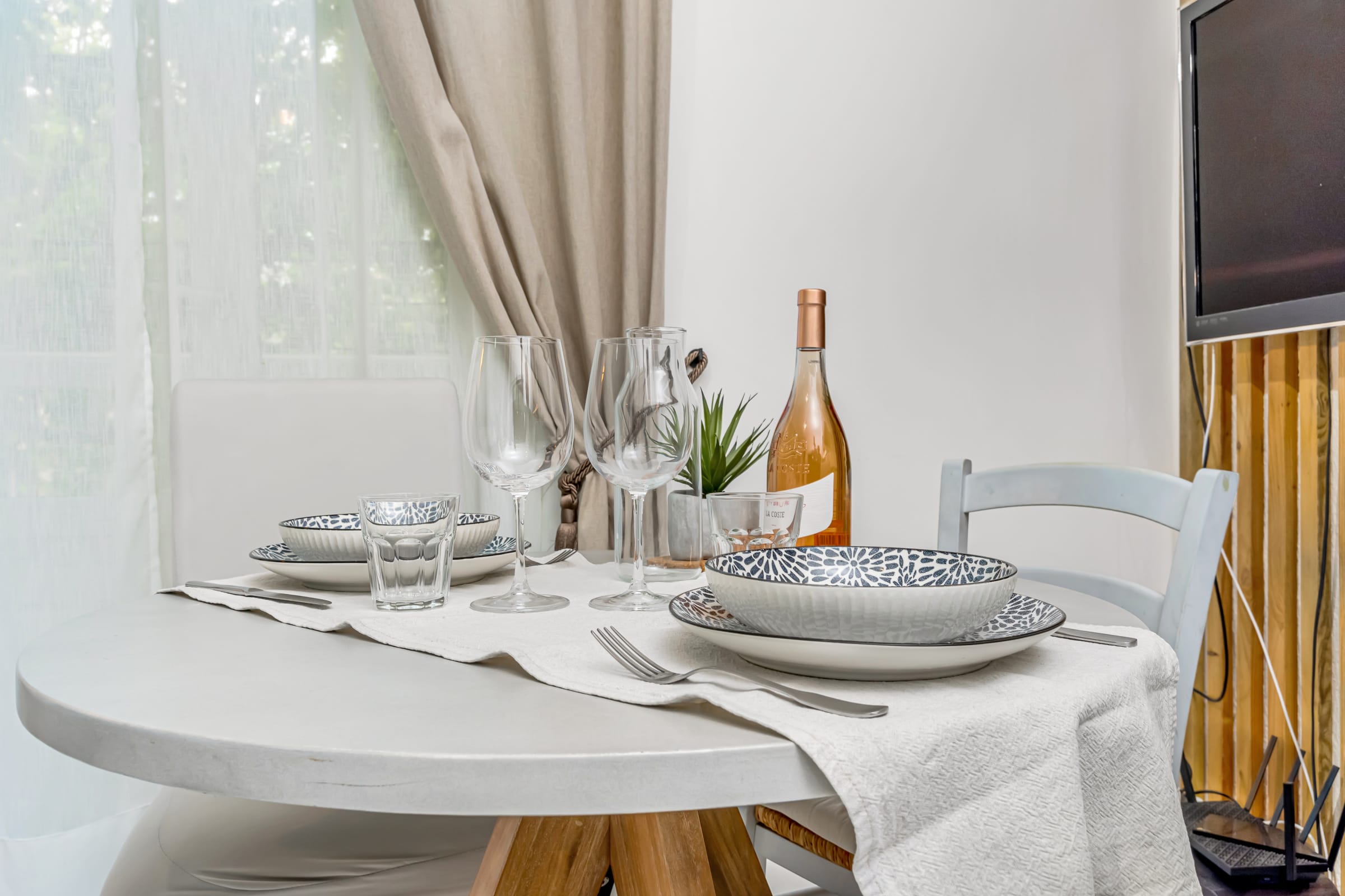 The living and dining area is fully equipped: dining table with chairs and coffee table and a 140×190 cm sofa bed opposite the television. A refined art of the table with quality dishes and glassware for all desires (wine glass, beer glass, cocktail glass, and champagne flute).
