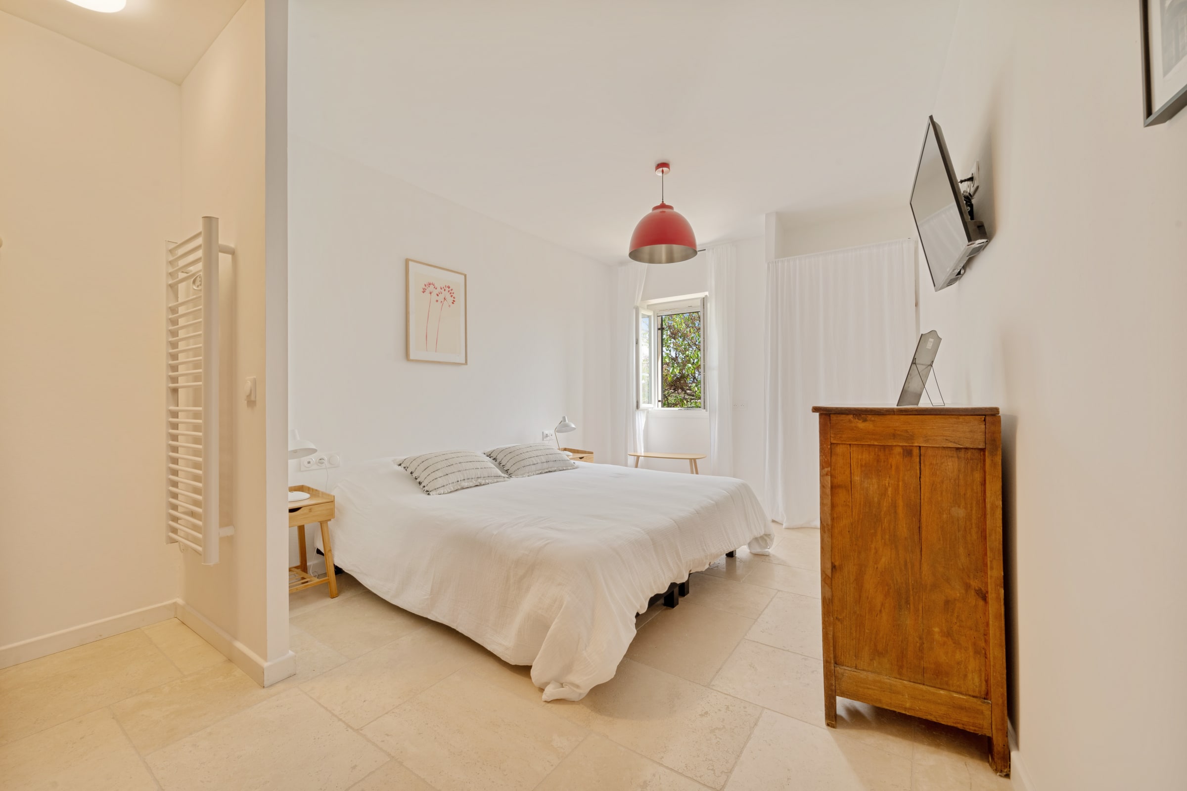 Bedroom 1 en suite with air-conditioning: double bed 160x200cm, wardrobe, closet, shower room with walk-in shower, 1 washbasin. This room has access to the outside.