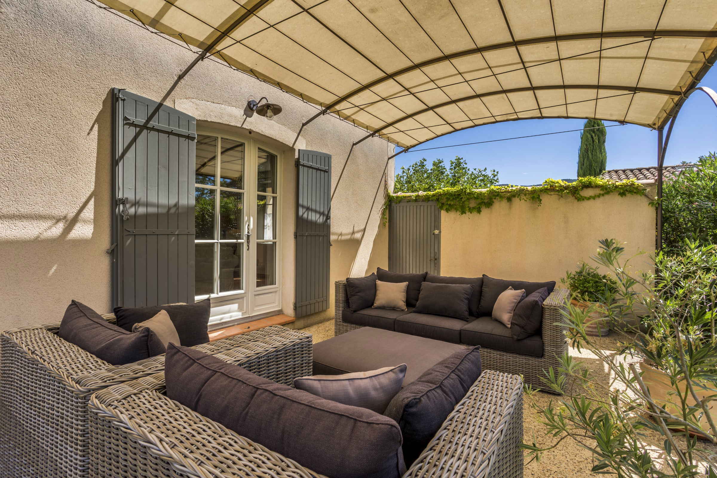 - Shaded terrace on the south side with a clear view on the Luberon and the vineyards. Wrought iron table and 10 chairs