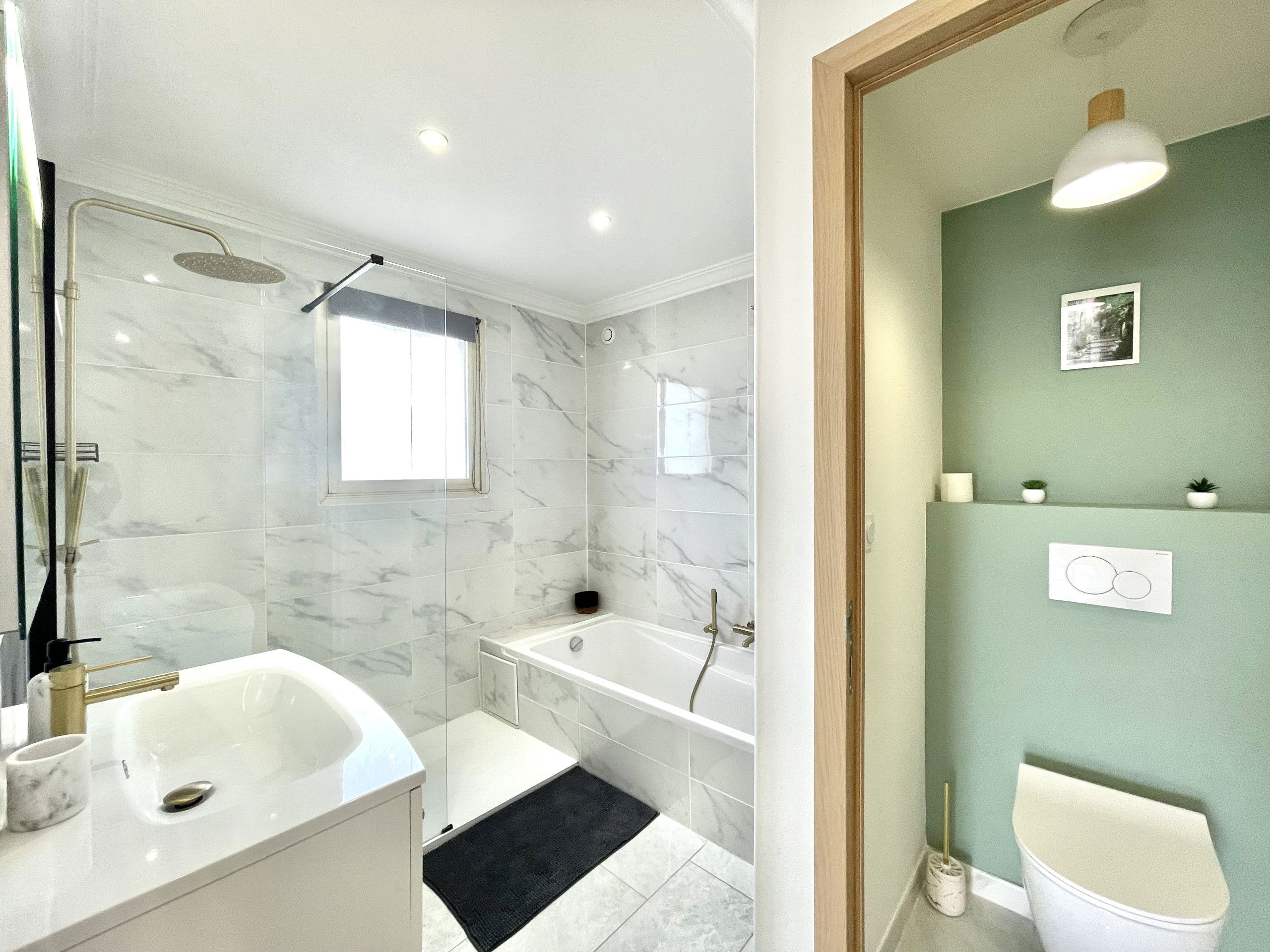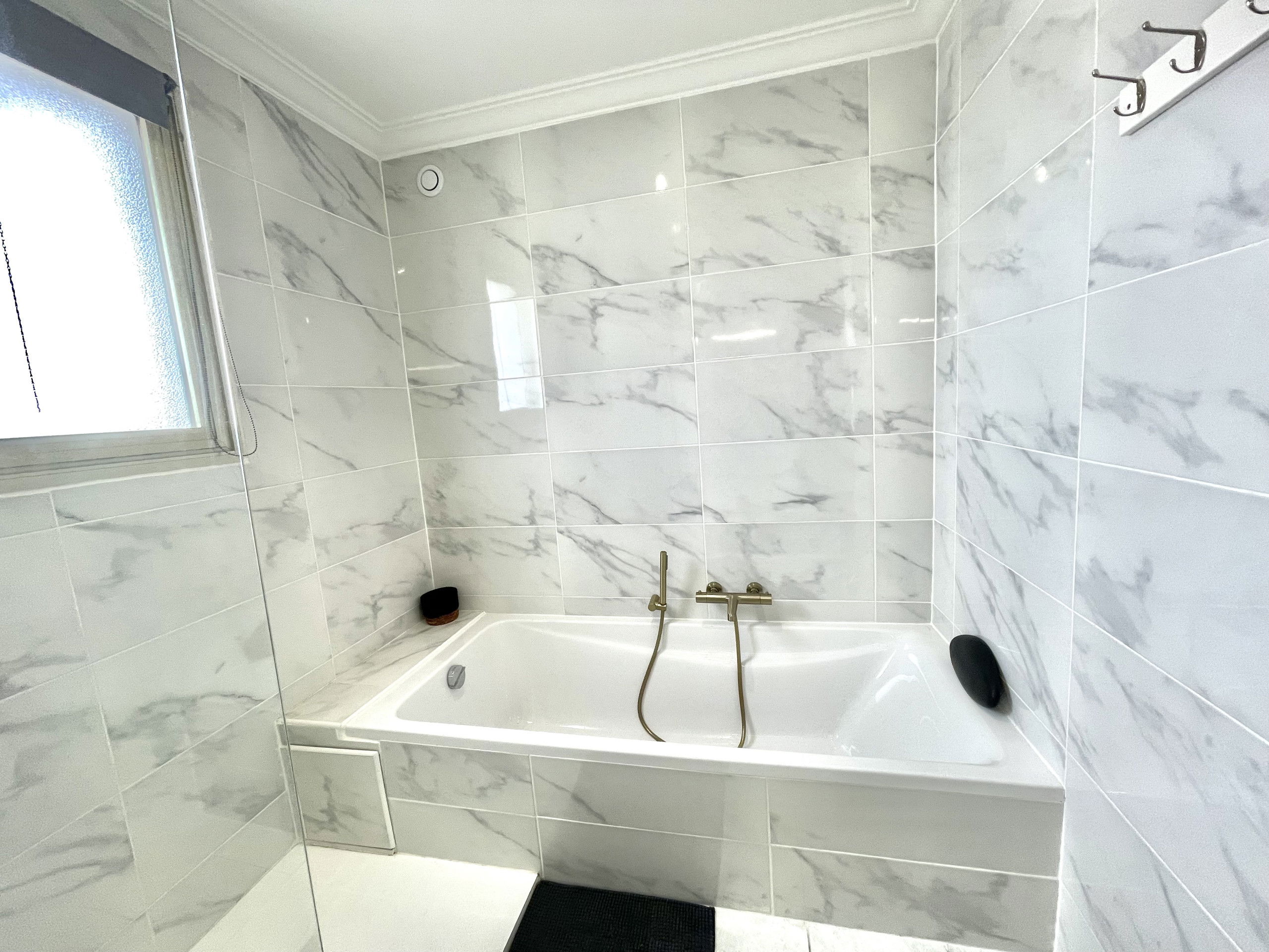 The apartment includes a bedroom with two single beds and adjoining bathroom, a second bedroom with two single beds and private bathroom, both opening onto the same terrace, as well as a master bedroom with double bed also overlooking the sea view terrace and featuring a bathroom with shower, bathtub and independent WC.