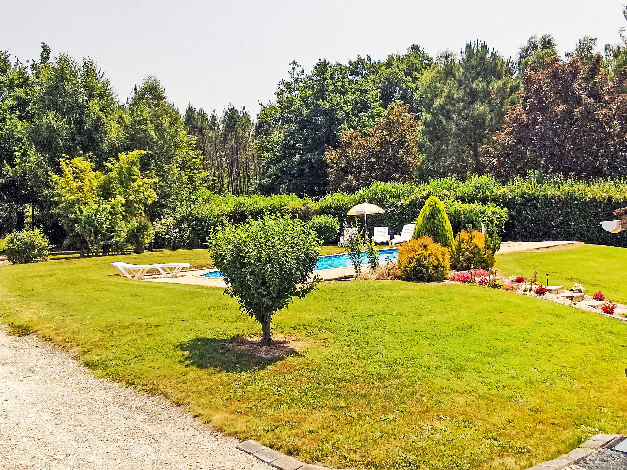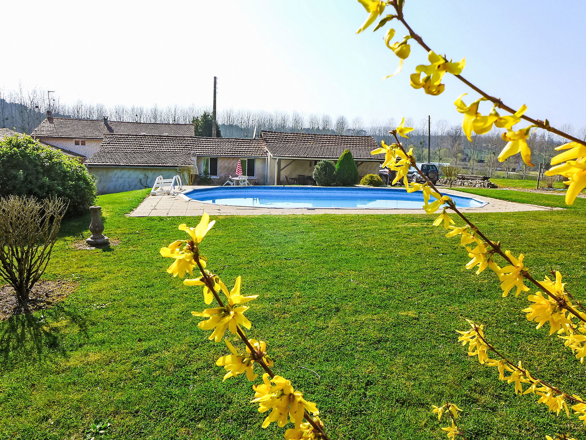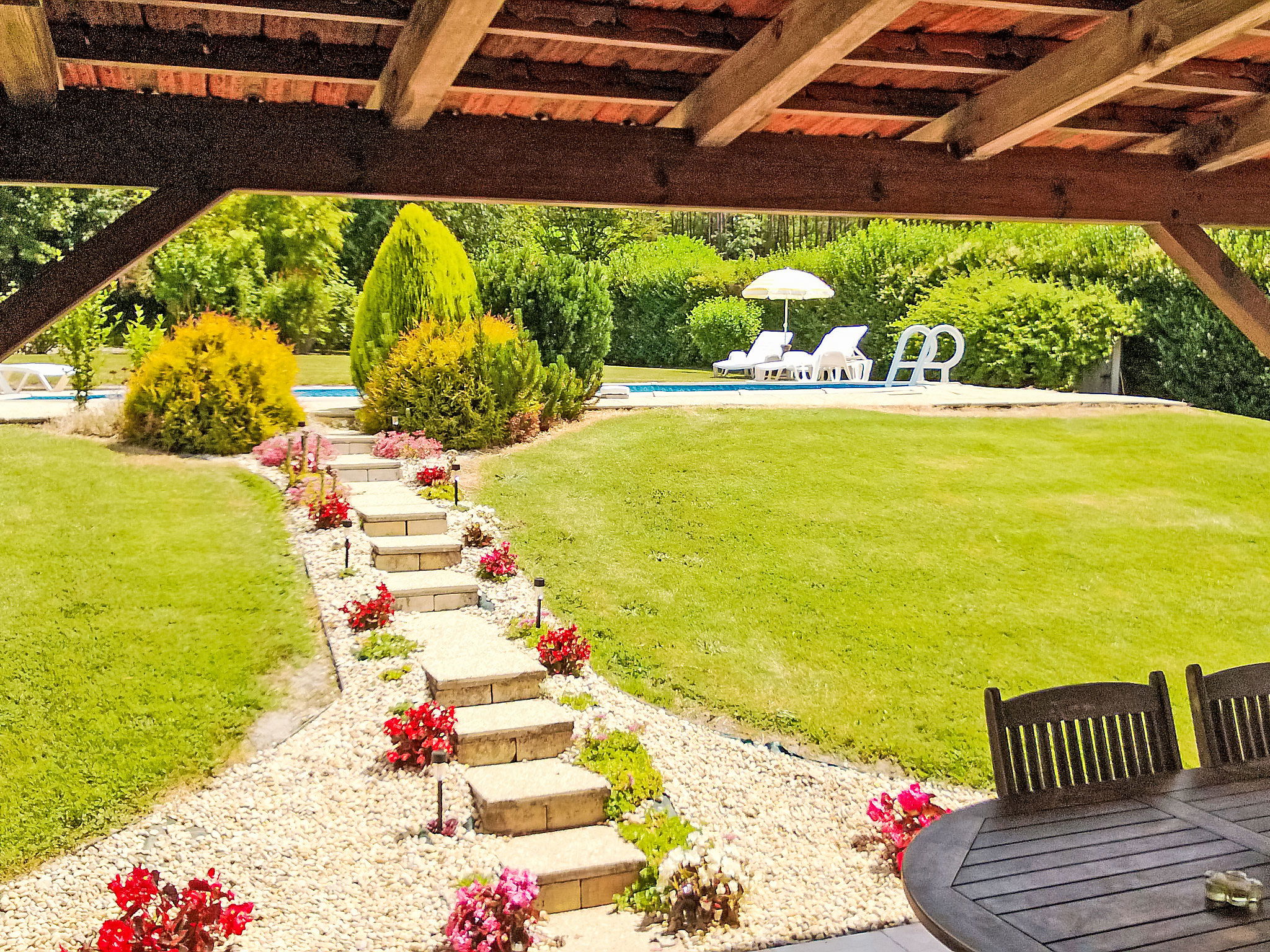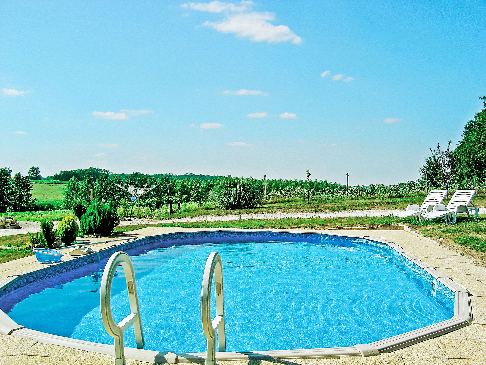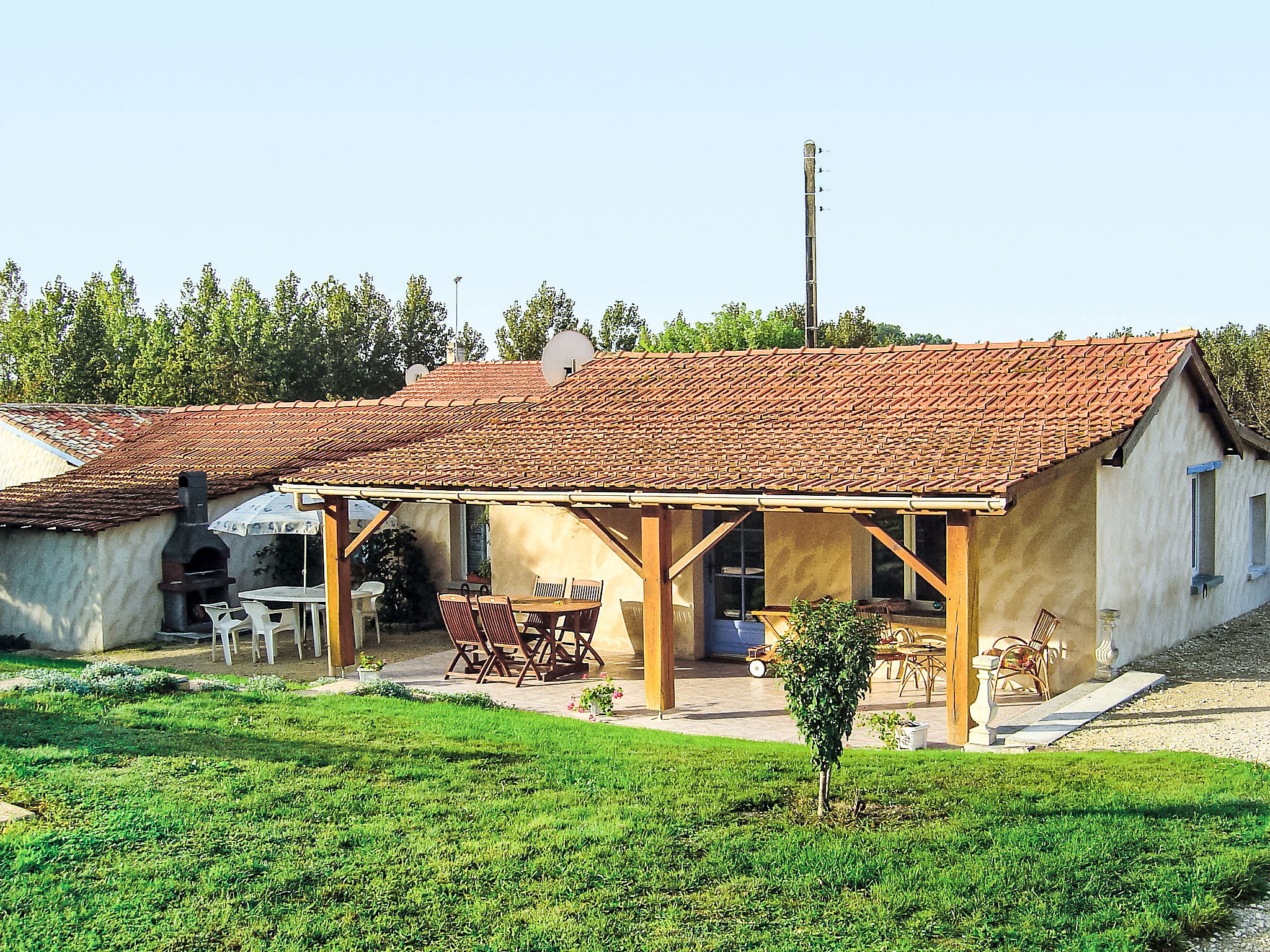 Condeon 7 km from Barbezieux: Cosy, rustic farmhouse "La Grangette", renovated, surrounded by trees and fields. 1.8 km from the centre of Condéon, 7 km from the centre of Barbezieux, in a quiet position, in the countryside. Private: property, well-kept garden 500 m2 (not fenced) with lawn and flowers, swimming pool (10 x 5 m, depth 120 cm, seasonal availability: 10.Apr. - 17.Oct.) with internal staircase and alarm system. Children's playground (swing, sandbox). 50 m long motor access. Parking (for 3 cars) on the premises. Grocery 1.8 km, restaurant 1.8 km, bar 1.8 km, bus stop "Barbezieux" 7 km. Tennis 1.8 km, walking paths from the house 100 m. Nearby attractions: Angoulême 35 km, Brossac 20 km, Cognac 34 km. Please note: car recommended. Suitable for families, baby equipment on request (included). Object suitable for 4 adults + 2 children.