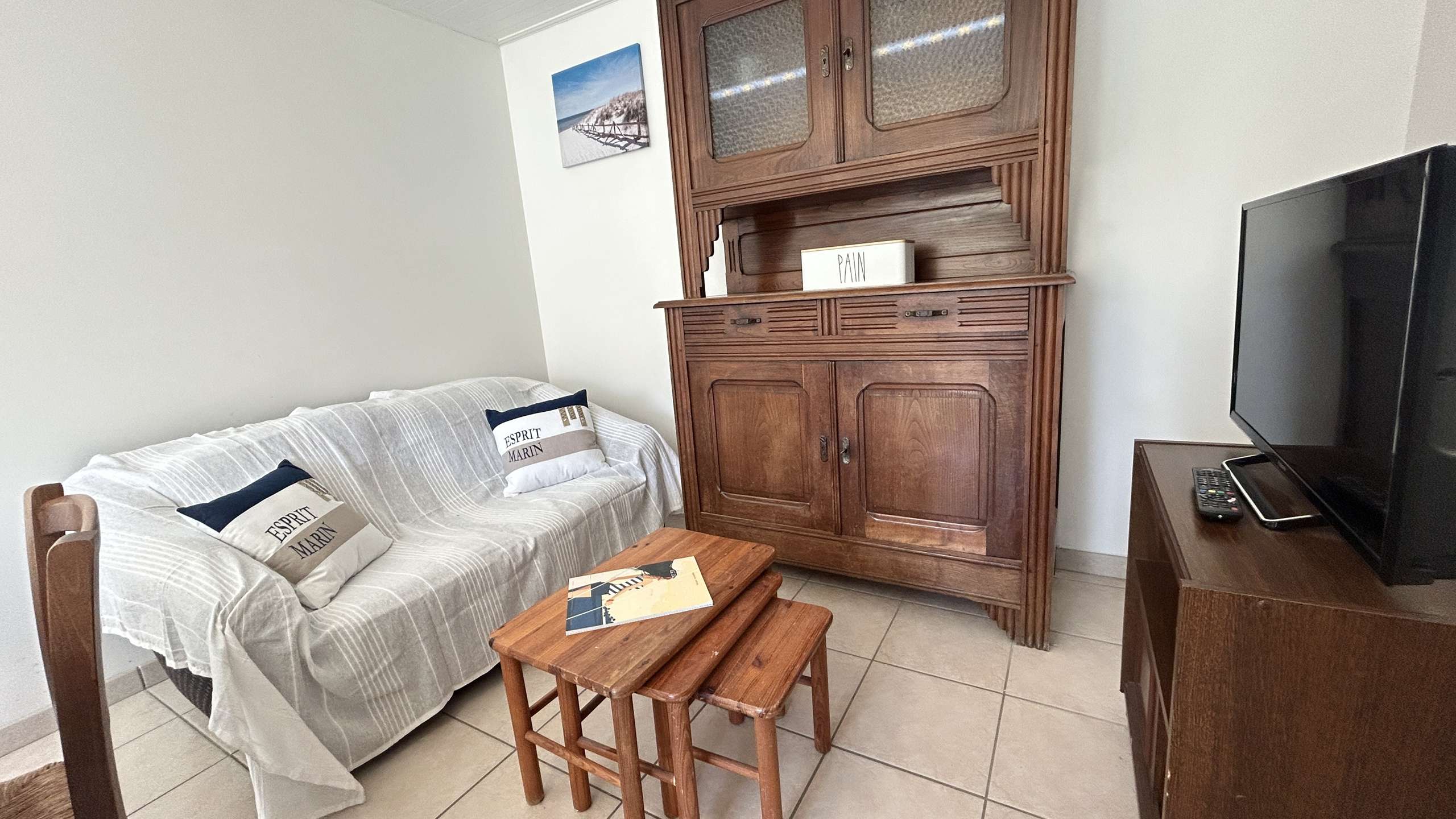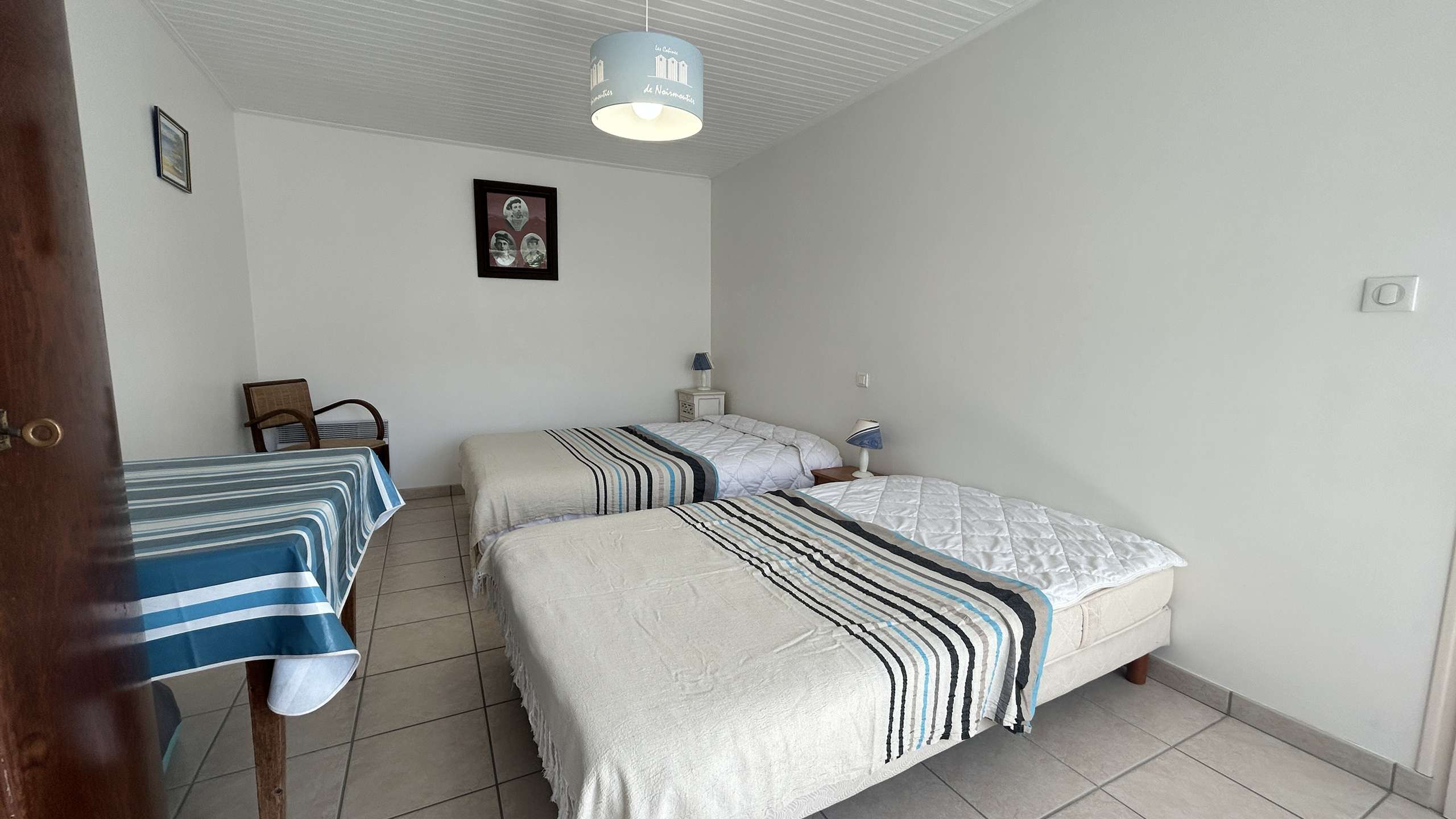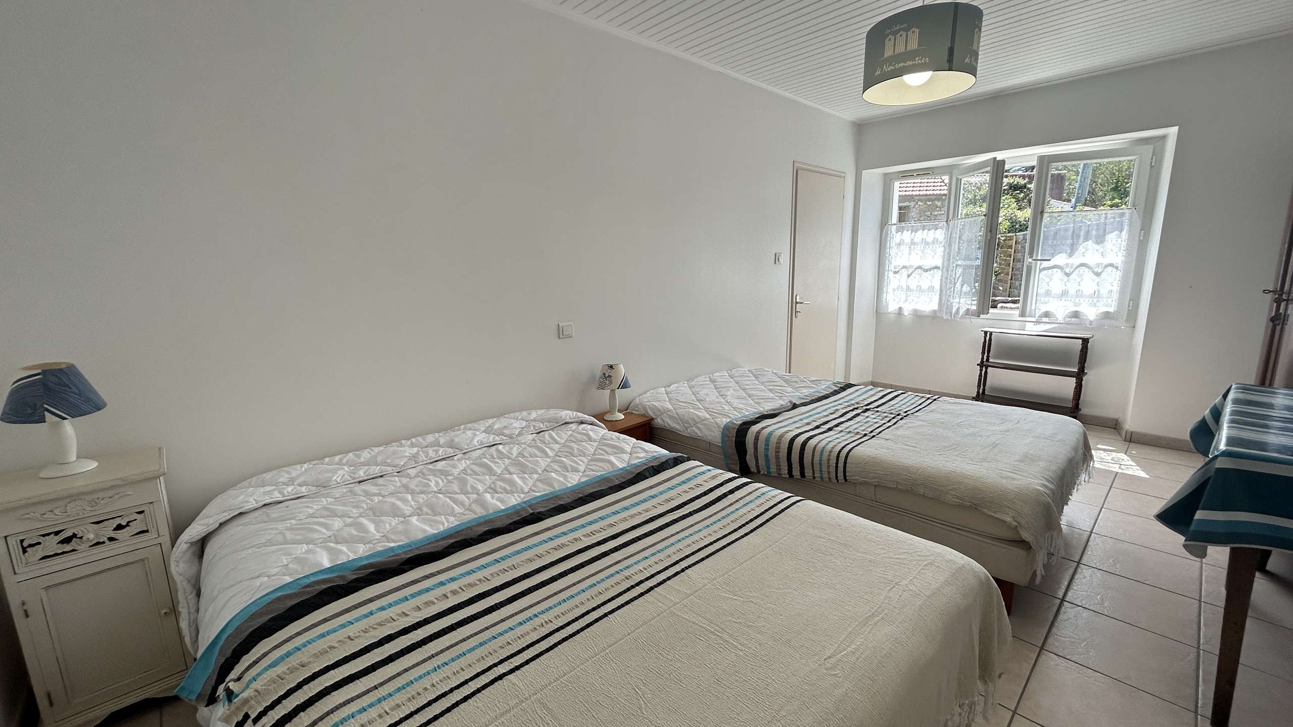 This country house located in a quiet area and 300 m from the beach includes an entrance hall, an equipped kitchen, a living room with television, a large bedroom with a double bed and a 120 cm bed, another bedroom with a double bed, a bathroom water, a toilet.