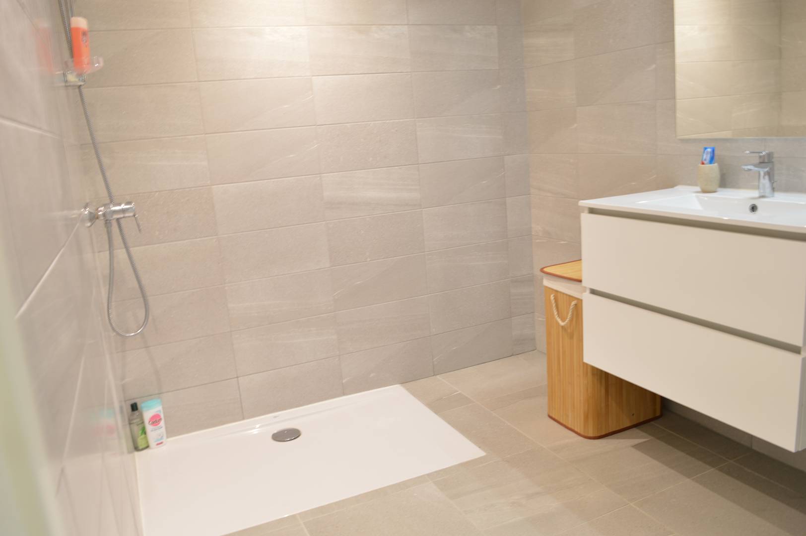 This vacation apartment features a living room opening onto a spacious 20m² terrace, a functional kitchen, a bedroom with a 140cm bed, a bathroom with a walk-in shower, and a separate toilet.
