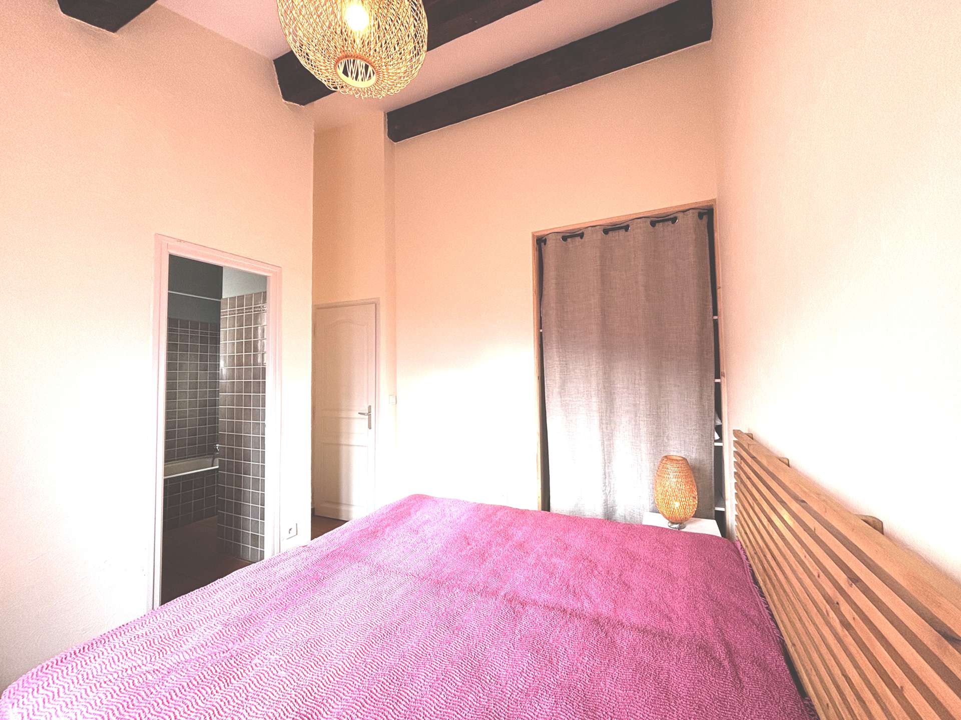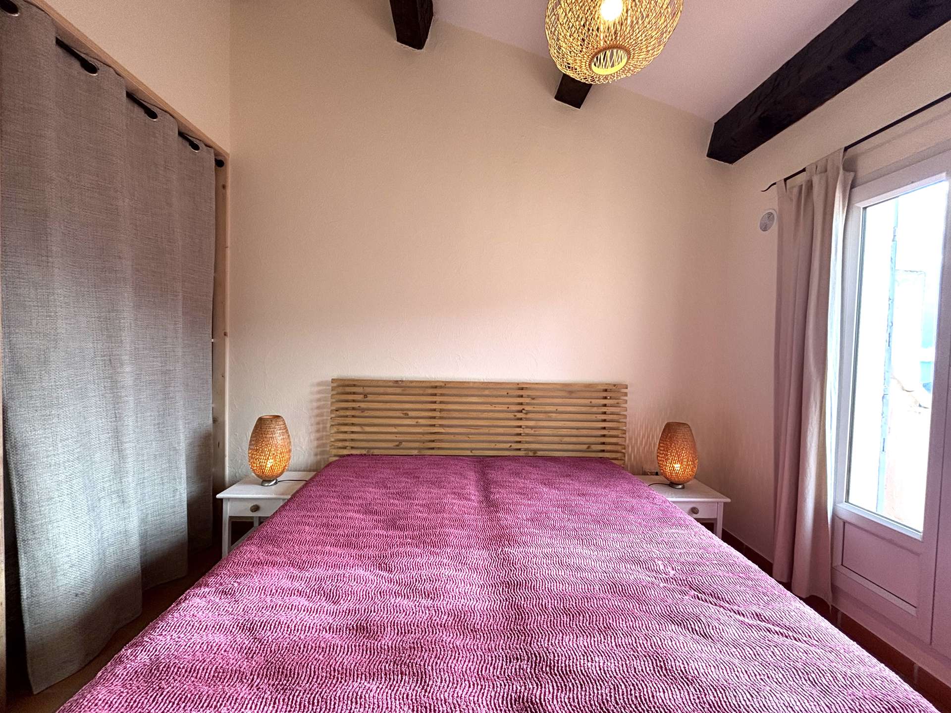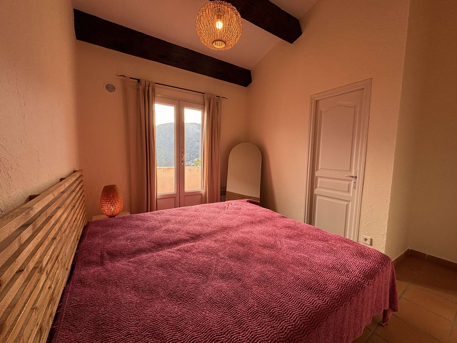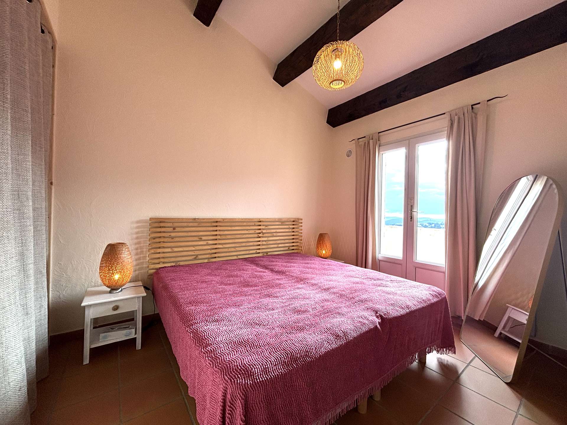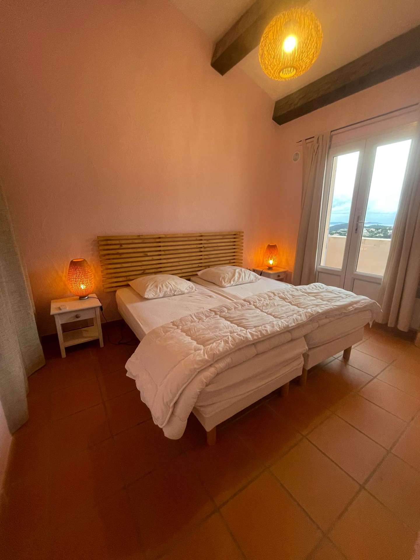Upstairs, you will find two bedrooms, including a master suite with two single beds (90 × 190 cm), a bathroom, and a private Tropezian-style terrace with sea views. The second bedroom has two single beds (90 × 190 cm), with a shower room nearby and separate WC.