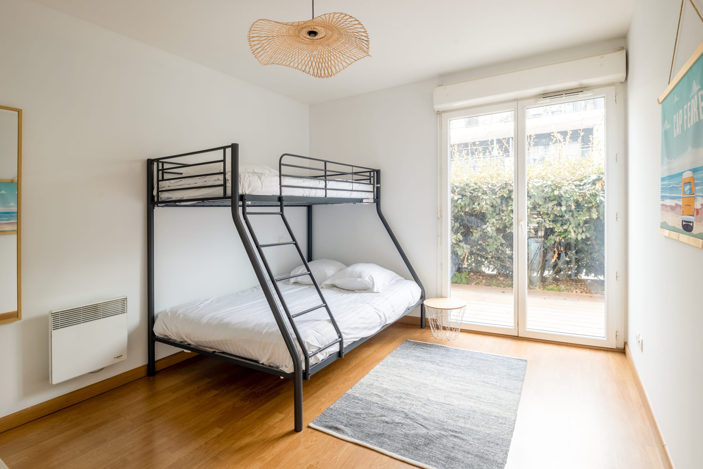 - a second bedroom with a bunk bed consisting of a double bed (bottom) and a single bed (top),