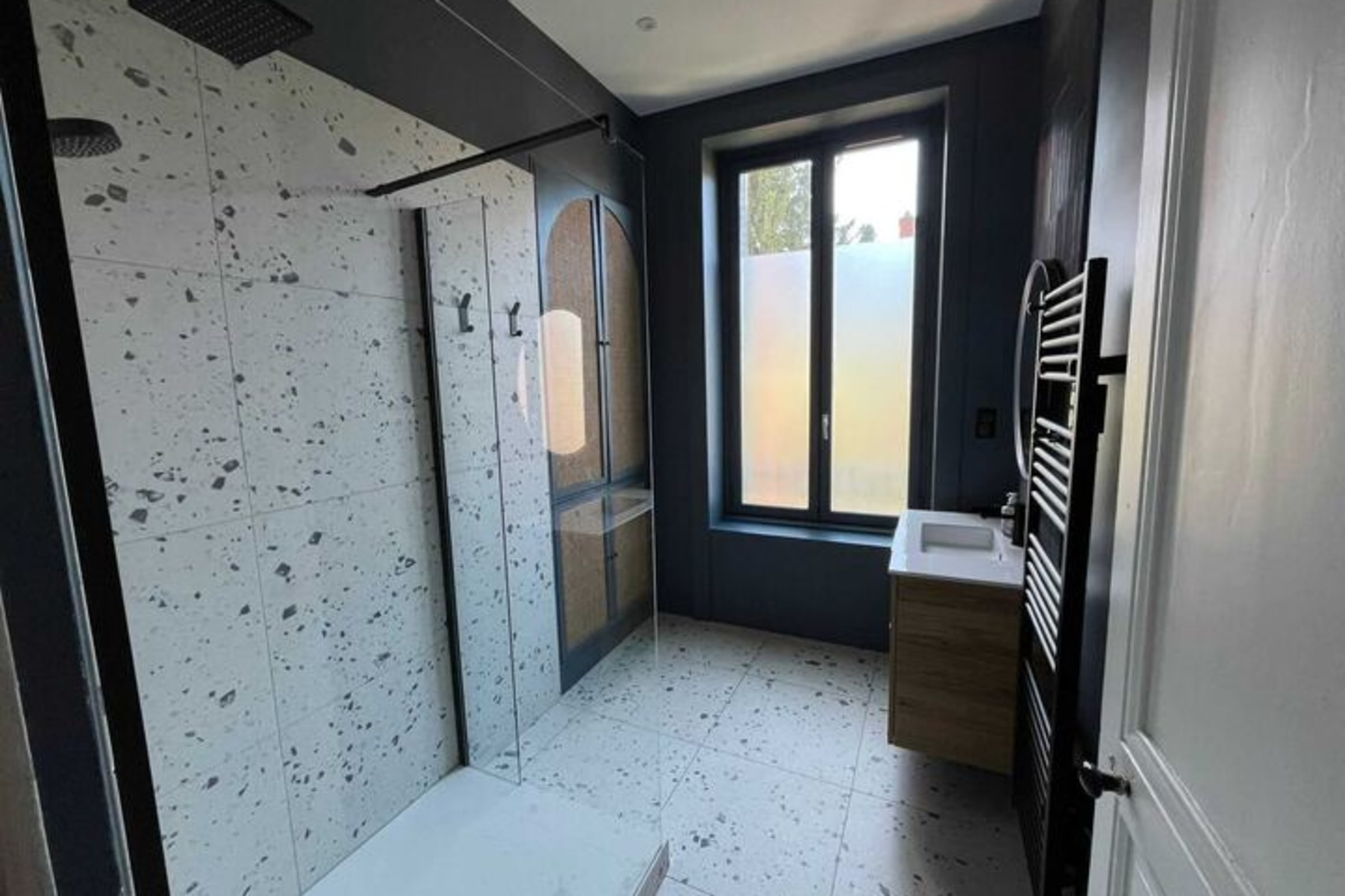 - a bathroom with a shower,