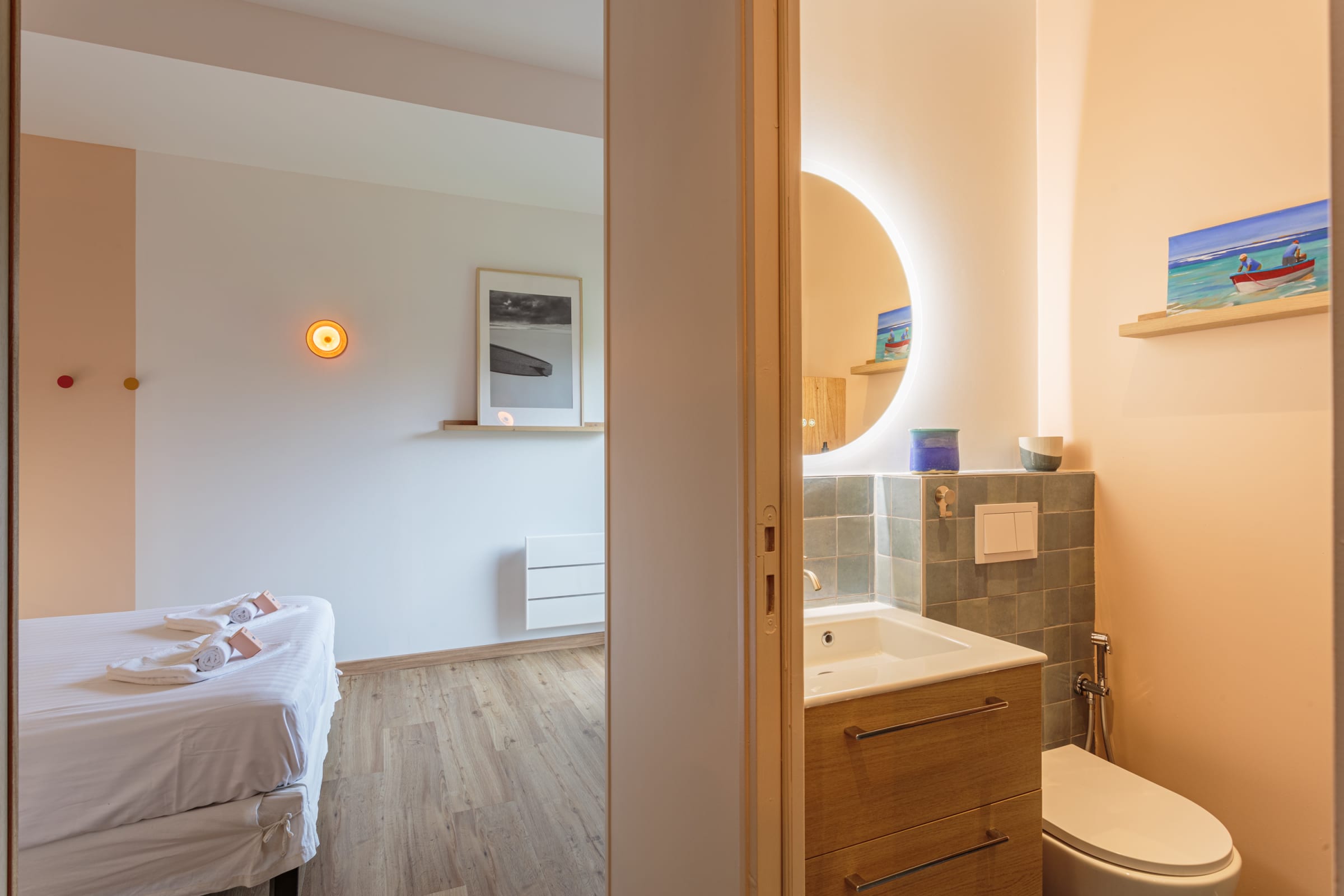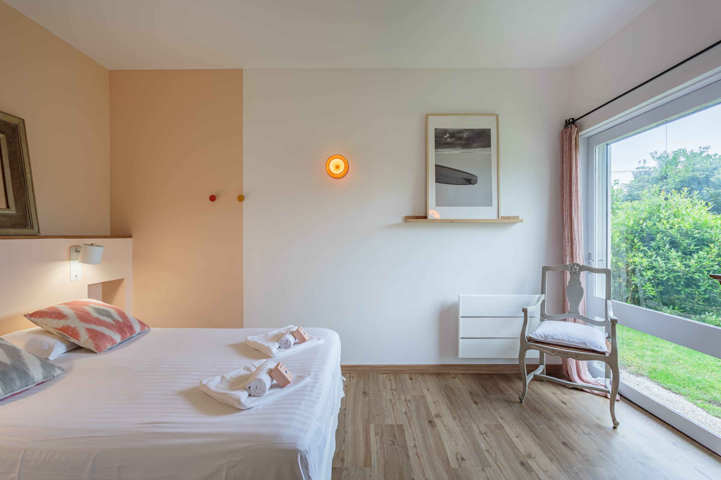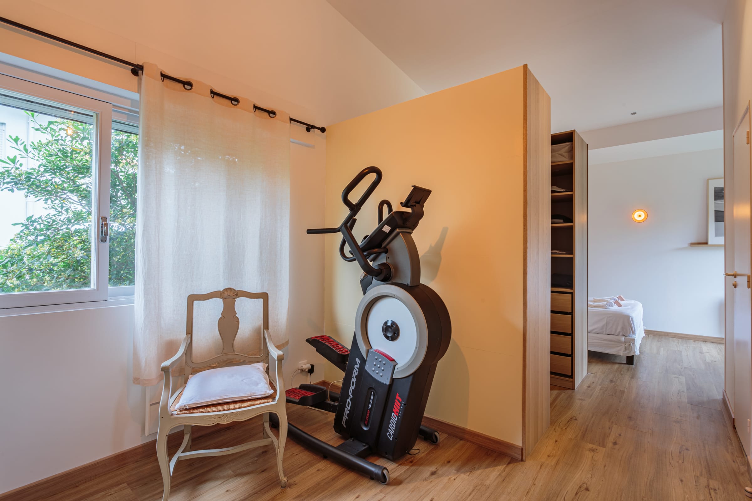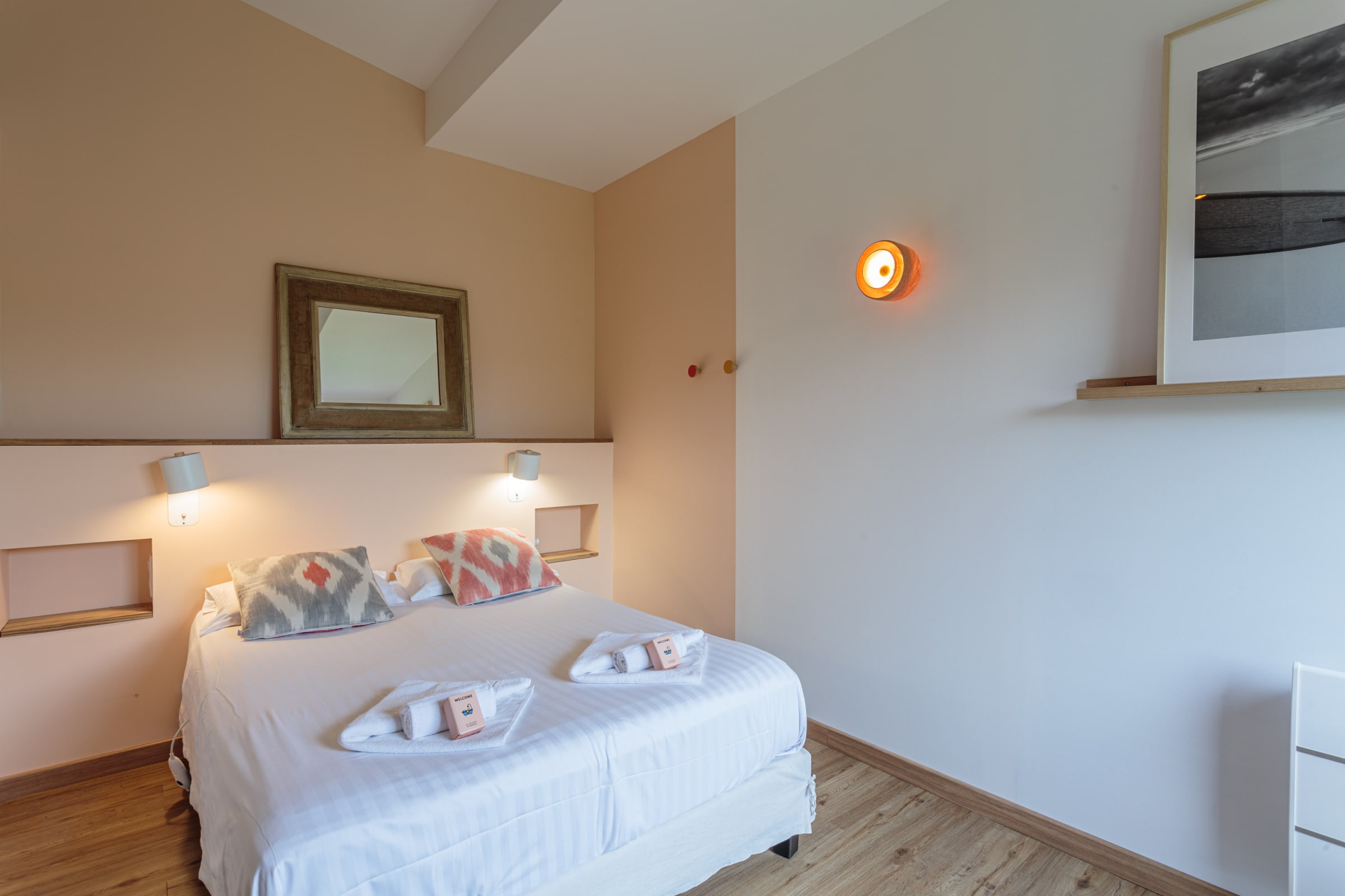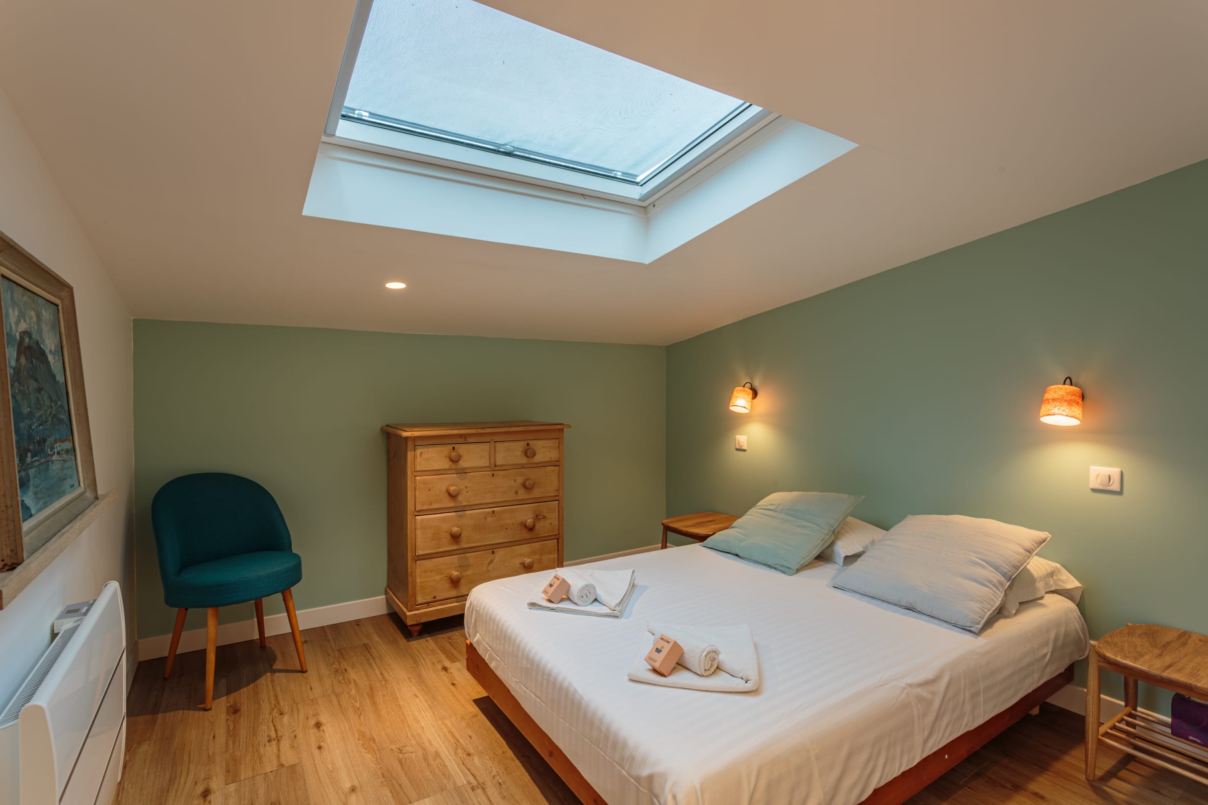 - a bedroom with a double bed (140cm) and en-suite bathroom (shower and WC), with an adjoining room separated by a dressing room, housing a sofa bed (140cm),